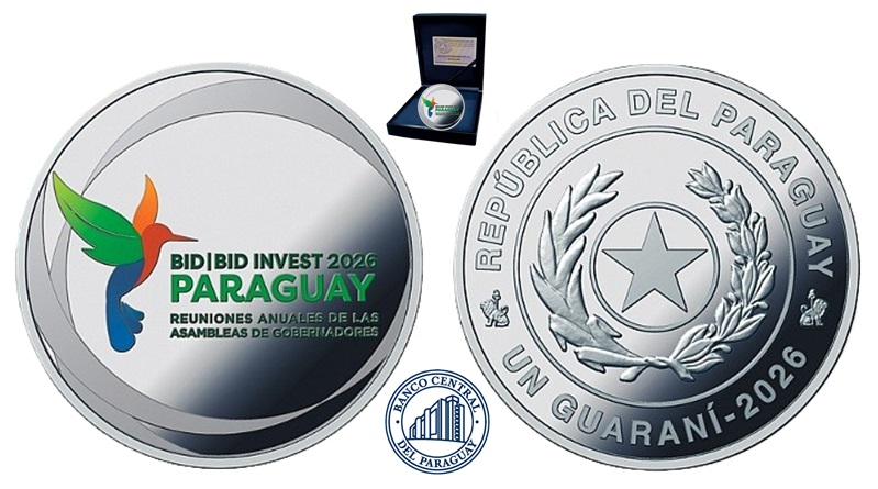 The proof quality coins are produced by the FNMT – Real Casa de la Moneda at their facilities in Madrid on behalf of the Banco Central del Paraguay. The obverse side of the proof and colour coins includes the official logo for the IDB Board of Governor’s meeting centred. The logo depicts a stylised hummingbird along with the text BID|BID INVEST 2026 - PARAGUAY - REUNIONES ANUALES DE LAS - ASAMBLEAS DE GOBERNADORES. The design is surrounded with crescent-shaped designs placed along the rim. The reverse side depicts the Paraguayan coat of arms consisting of a single five-pointed star centred flanked with a palm branch to the left and an olive branch to the right. Above and along the upper rim is the text REPÚBLICA DEL PARAGUAY and below the crest is the denomination and year, UN GUARANÍ-2026.