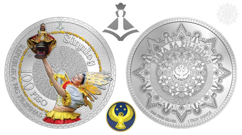 The obverse design of each coin will depict a composite of common motif and theme elements such as a diamond shape shown on the edge at the top of the coin and which number increases along the edge according to the month the coin is released, up to twelve. A stylised symbol or motif is also featured at the top and just below the number of diamonds. This assigned symbol represents both the month and festival highlighted. The obverse of each coin will features a full colour motif characteristic of a specific festival. For the festival of Sinulog and month of January, a performer gracefully dances in devotion, as she holds a figurine of the Santo Niño de Cebu, a revered religious icon in the Philippines. At the base of the Santo Niño figurine to the left is the distinctive mintmark of the BSP. Within an ornamental circular gold-coloured inner border is the stylised text Sinulog shown near the upper right with the denomination of 100 PISO placed near the lower left. Along the lower left rim is the text REPUBLIKA NG PILIPINAS. Within a circle in the background field behind the dancer is repeated micro-text that reads SINULOG CEBU CITY. The reverse side which is common to the entire series comprisessymbols and elements of the twelve Philippine festivals incorporated in one design to create a festive pattern that forms a large centred image representing the symbol of the lantern festival, the 12th and last coin in the series. In the centre of the composition is the logo of the Central Bank of the Philippines with the name BANGKO SENTRAL NG PILIPINAS. Within the ornamental image above the Bank’s logo is the text of the name of the series PISTA SA PILIPINAS (festivals of the Philippines) along with the year 2026 placed below the logo. Along the lower rim are the specifications of the coin, 999 FINE SILVER 1 TROY OUNCE. The overall design is surrounded by a continuous geometric ornamental design seen along the flat rim.