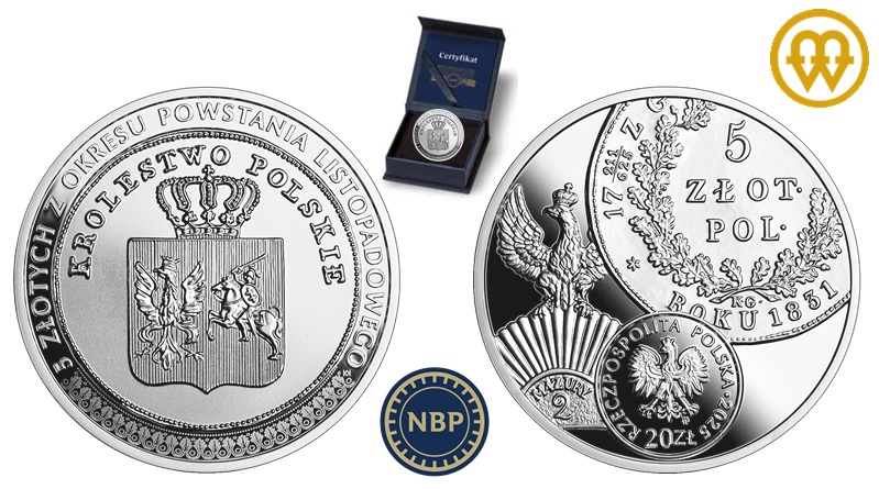 The silver proof coins are produced by the Mennica Polska – Mint of Poland at their facilities in Warsaw on behalf of the National Bank and designed by Dominika Karpińska-Kopiec. The obverse features the transitional coat of arms featuring the Eagle and Knight on horseback. The inscription along the rim above clearly indicates that it symbolises the Kingdom of Poland, KRÓLESTWO POLSKIE. Above and along the upper rim of the replicated coin is the text 5 ZŁOTYCH Z OKRESU POWSTANIA LISTOPADOWEGO (5 złoty from the period of the November Uprising). Below the primary design and along the lower rim is a patterned ornament decoration taken from a commemorative box of a presentation set of insurrection coins produced at the time. The reverse shows a replicated element of the silver coin off-centre and placed toward the upper left. The text 5 ZŁOT· POL· is surrounded by a wreath of oak leaves with the two letters K· and G· - the initials of the mint’s administrator, Karol Gronau shown just under the knot of the wreath. Along the rim, the exact coinage standard of the 5 złoty coin and the date: 17 211/625 Z GRZYW·CZYST·KOL· * ROKU 1831 * are featured along the rim. Placed to the lower left is an element from from the cap badge of an officer of 2 MAZURY (2nd Masovian Cavalry Regiment) depicting an eagle. Close to the lower rim is a contemporary reverse design image within a small circle. It contains an image of the crowned Eagle, the emblem of the Republic of Poland and the inscription RZECZPOSPOLITA POLSKA · 2025 and the denomination 20 ZŁ. The flat edge of each coin includes the incused lettering BOŻE ZBAW POLSKĘ (God save Poland).