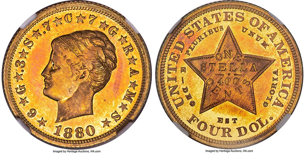 Also in play is an 1879 Flowing Hair Stella, Judd-1635 PR67★ NGC that is among the finest known examples. The 1879 Flowing Hair is the most plentiful of the gold stella patterns, but examples as fine as the Costa specimen are as rare as any of the other lower-mintage variants.
