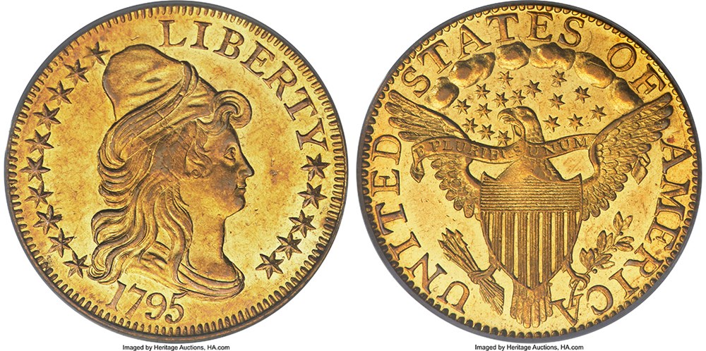 Among the highlights in the collection is a 1795 BD-13 Heraldic Eagle Five, MS62 PCGS HBJ-207. Doug Winter called it “one of the very few early gold varieties that is unique, and the fact that such early researchers and collectors as Edgar Adams, Waldo Newcomer, Walter Breen and Harry Bass never found one is a true testament to the numismatic significance of the Jacobson Collection.”