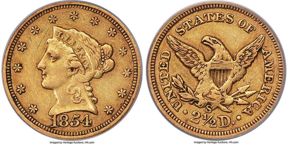 Also among the collection’s highlights is the third-finest 1854-S Liberty Quarter Eagle, XF45 CAC of just 13 known examples. The 1854-S Liberty quarter eagle is one of the landmark rarities of the United States gold series. The coin was created during the height of the California Gold Rush, in the infancy of the San Francisco Mint, and released into circulation far from any numismatic eyes that might have taken notice. Of the 246 pieces struck, most disappeared over the course of decades in the hard-money West.