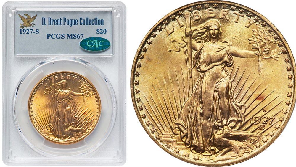 Though not as rare as the 1921, the 1927-S Saint is very rare. There could plausibly exist more than two hundred 1927-S Saints, though certainly not many more. PCGS has graded just one as MS67, the Duckor-Alymaya coin, and this same coin is the only MS67 grade 1927-S in the CAC population report.