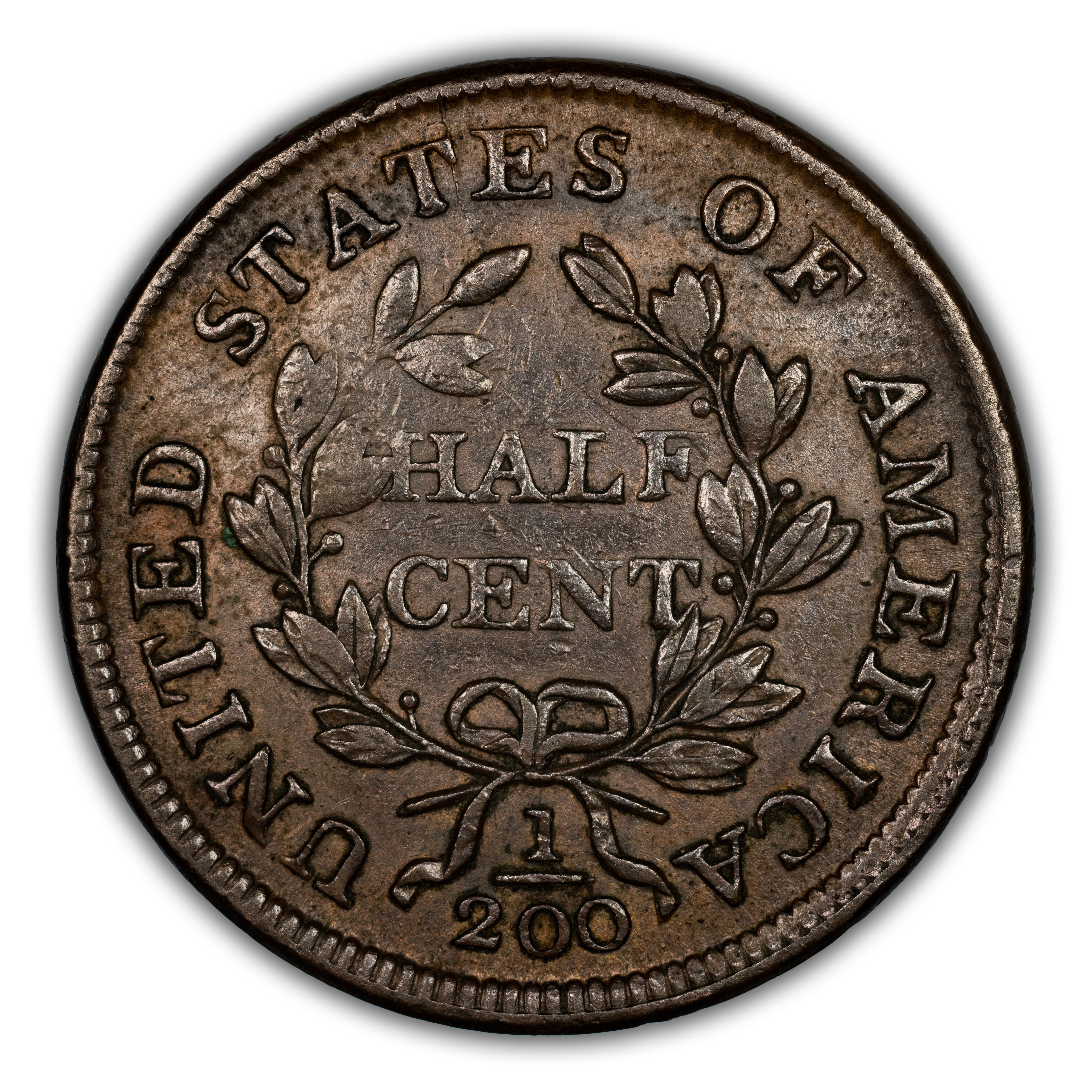 Reverse: The words UNITED STATES OF AMERICA around the periphery surround a wreath framing the words HALF CENT. The wreath is tied by a bow at the bottom and the denomination of 1/200 at the bottom center.