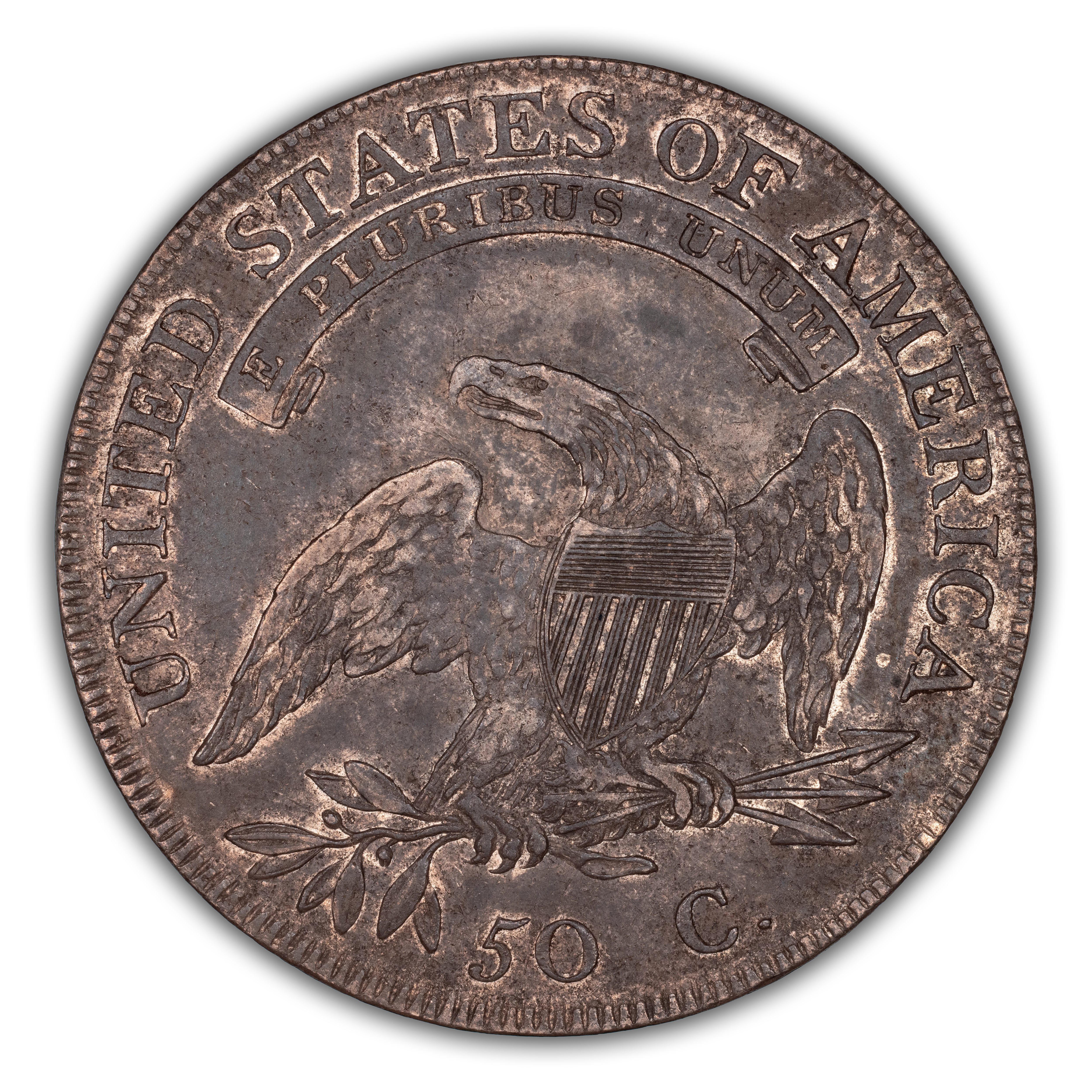 Reverse: An heraldic eagle holding olive branches and 3 arrows in its claws is surrounded by the words UNITED STATES OF AMERICA around the periphery. A ribbon below bears the motto E PLURIBUS UNUM. The denomination of 50C is centered below the eagle.