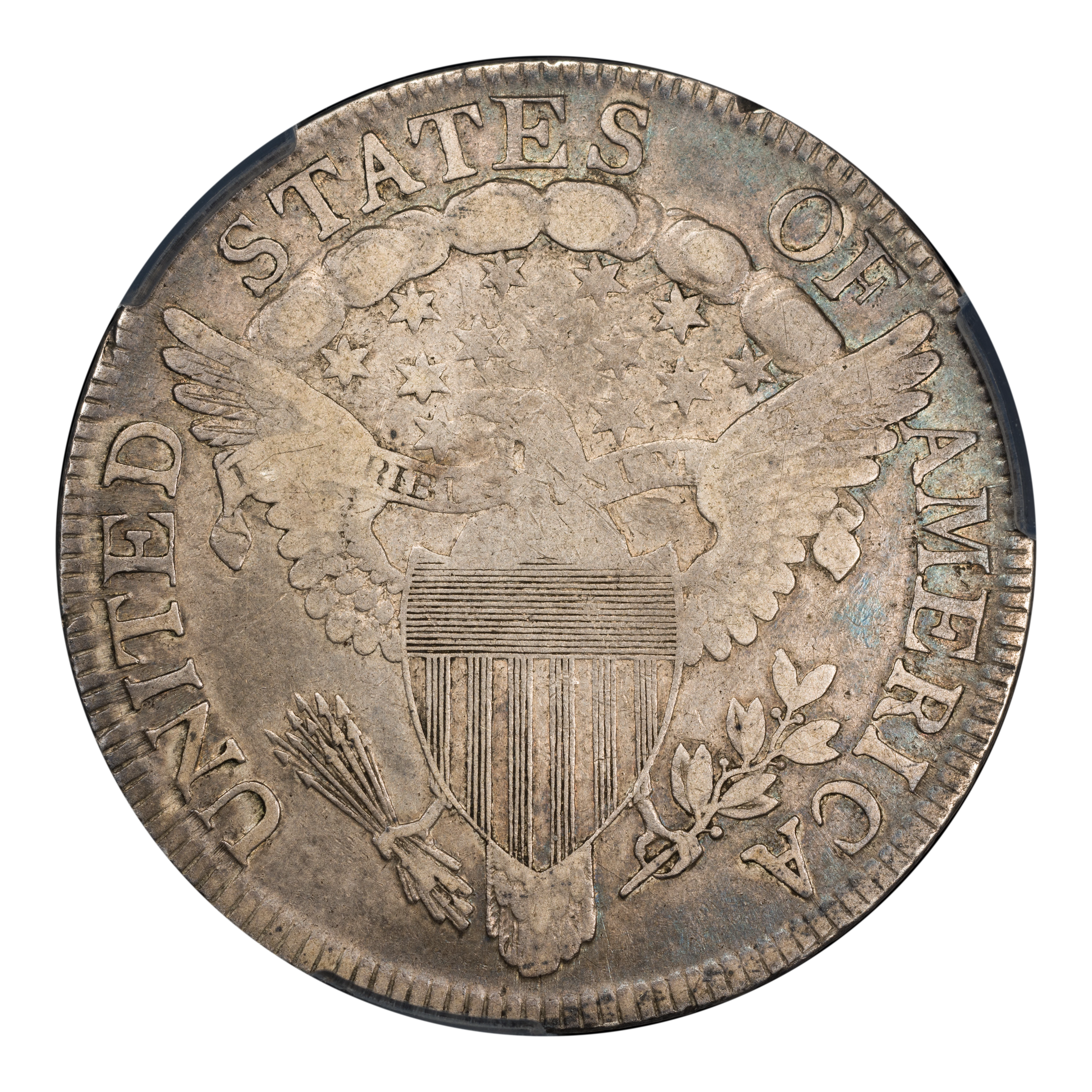 Reverse: The centerpiece of the reverse is the so-called "heraldic eagle" with wings fully spread and emblazoned with a shield replacing the chest. A ribbon bearing the motto E PLURIBUS UNUM hangs from the beak. The eagles right talon holds bundle of arrows and an olive branch in the right. Above the eagle's head are a group of stars and clouds with the words UNITED STATES OF AMERICA at the top periphery. No denomination is mentioned.