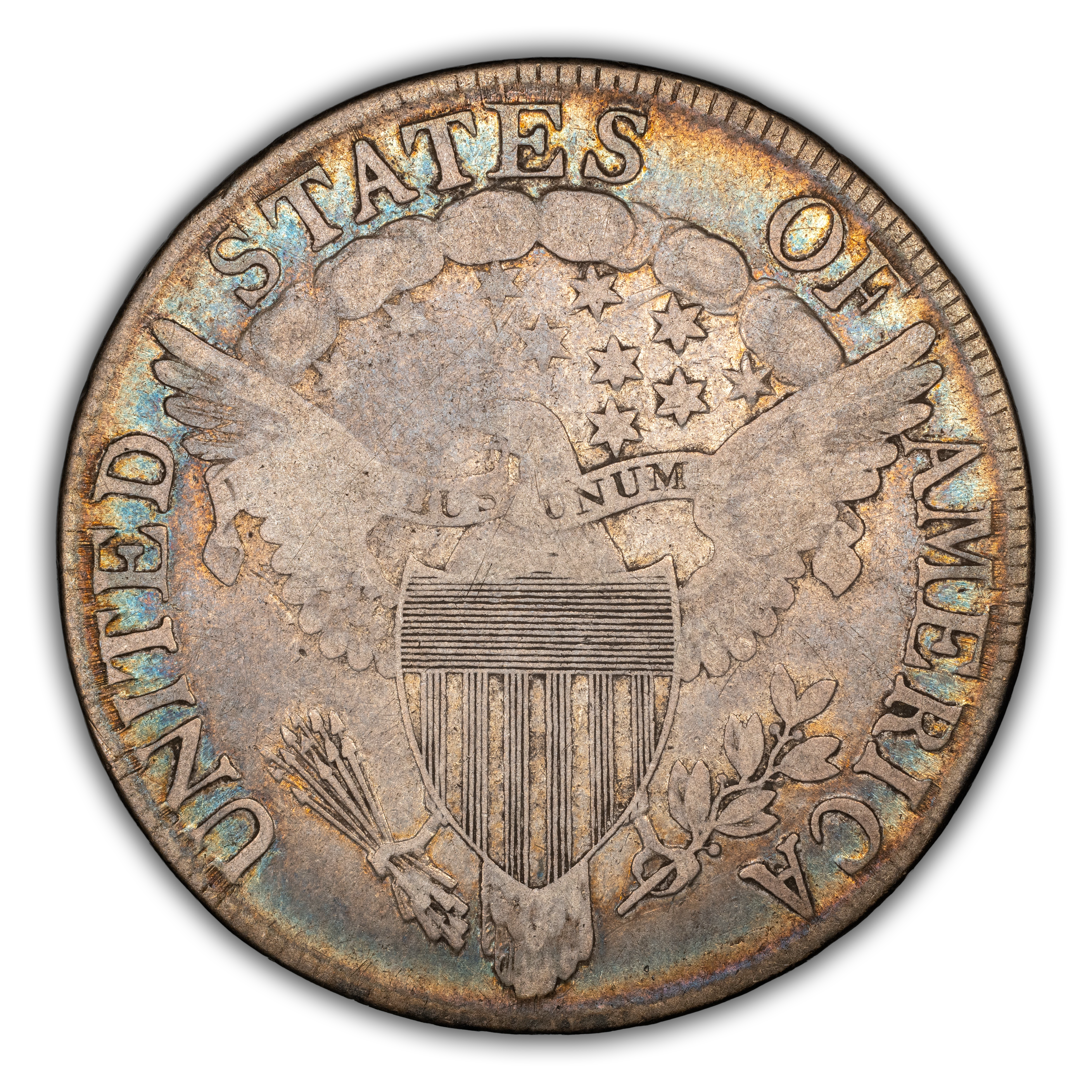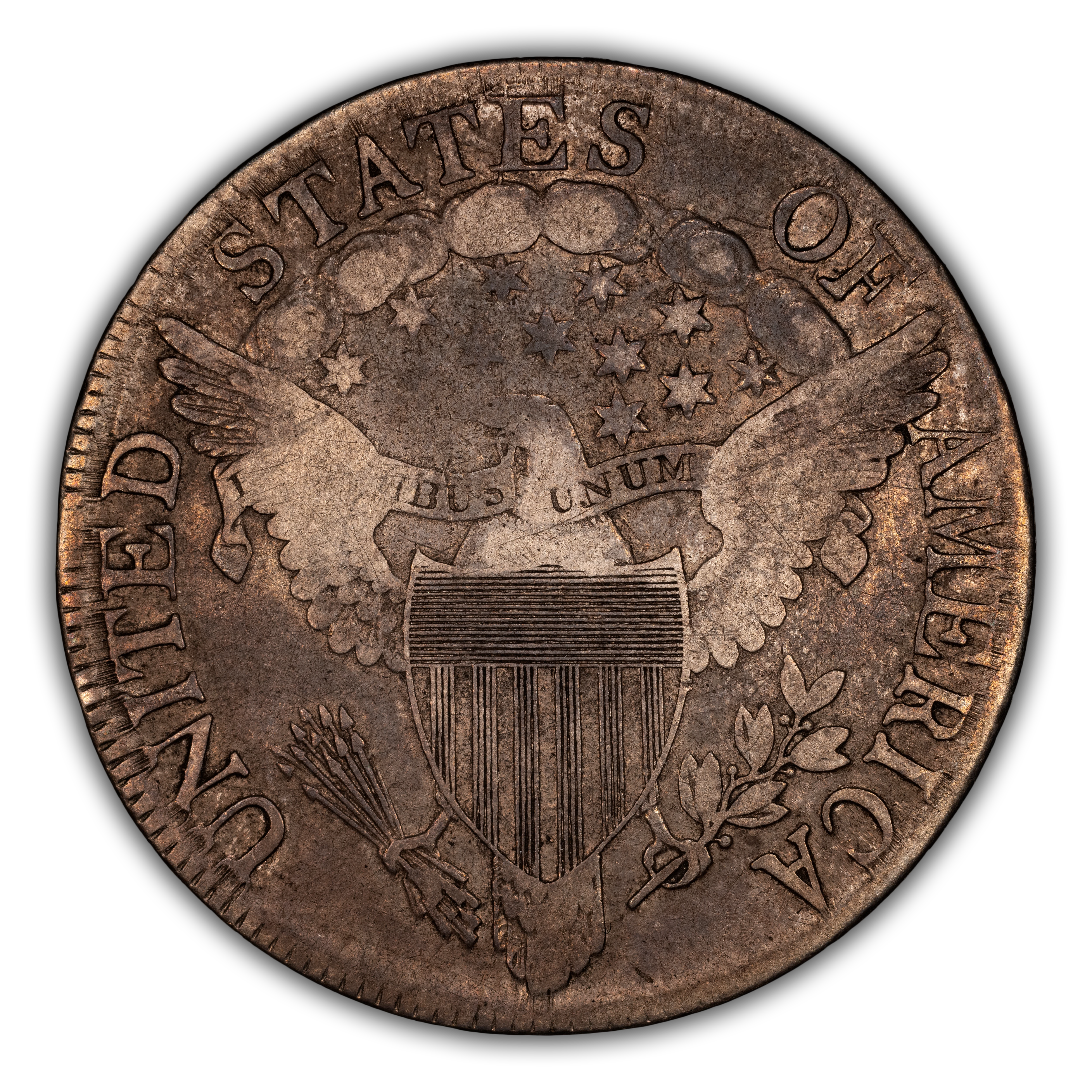 Reverse: The centerpiece of the reverse is the so-called "heraldic eagle" with wings fully spread and emblazoned with a shield replacing the chest. A ribbon bearing the motto E PLURIBUS UNUM hangs from the beak. The eagles right talon holds bundle of arrows and an olive branch in the right. Above the eagle's head are a group of stars and clouds with the words UNITED STATES OF AMERICA at the top periphery. No denomination is mentioned.