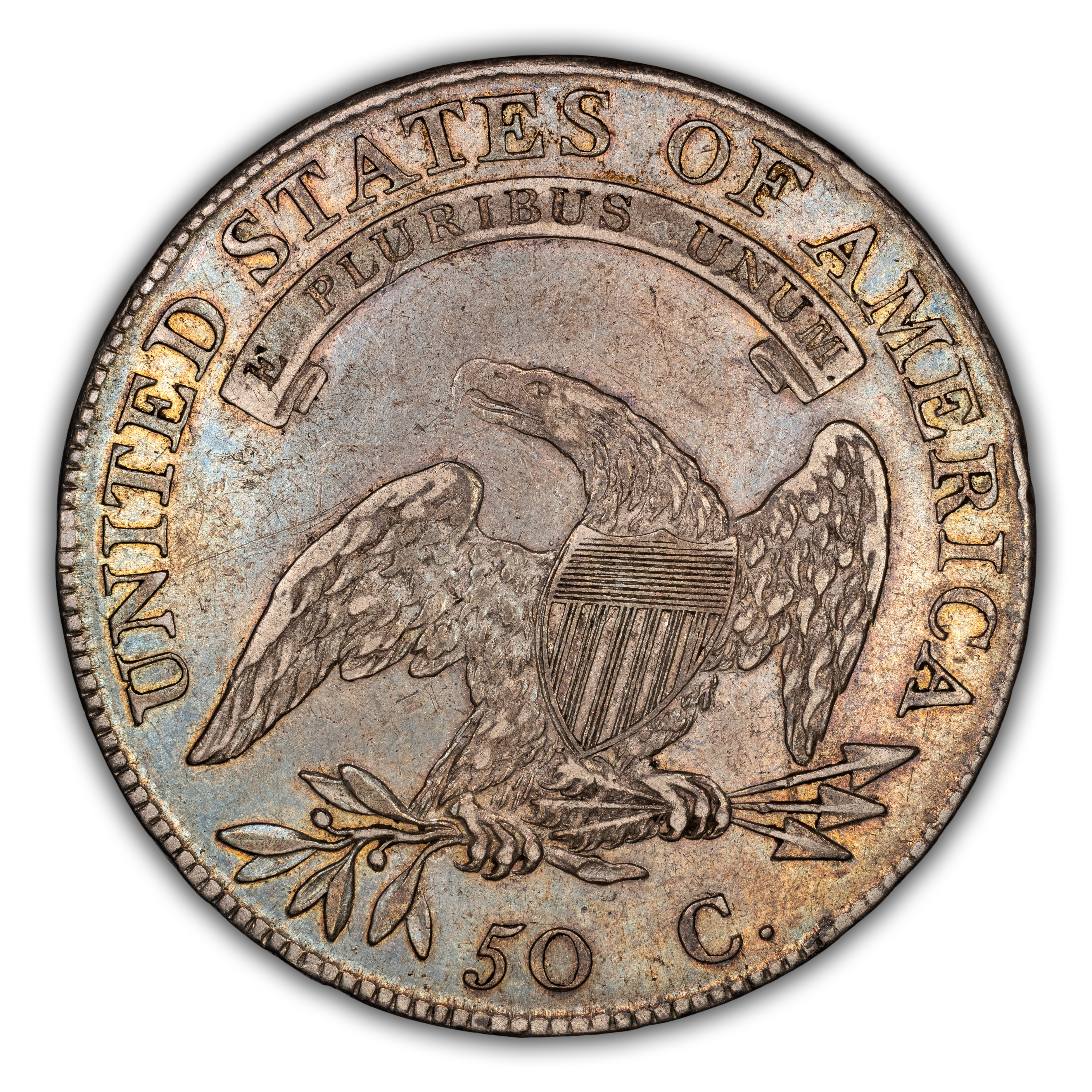 Reverse: An heraldic eagle holding olive branches and 3 arrows in its claws is surrounded by the words UNITED STATES OF AMERICA around the periphery. A ribbon below bears the motto E PLURIBUS UNUM. The denomination of 50C is centered below the eagle.