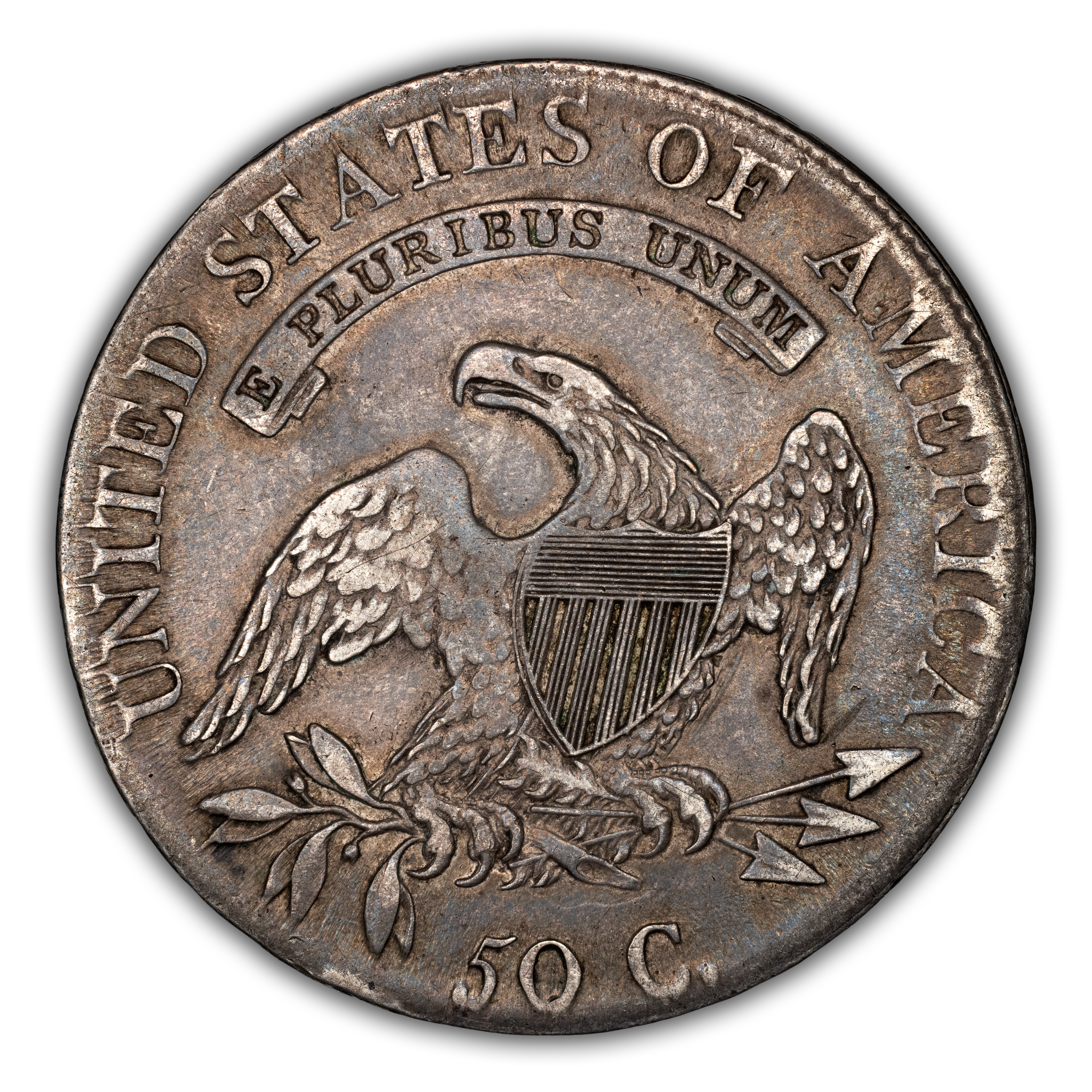 Reverse: An heraldic eagle holding olive branches and 3 arrows in its claws is surrounded by the words UNITED STATES OF AMERICA around the periphery. A ribbon below bears the motto E PLURIBUS UNUM. The denomination of 50C is centered below the eagle.