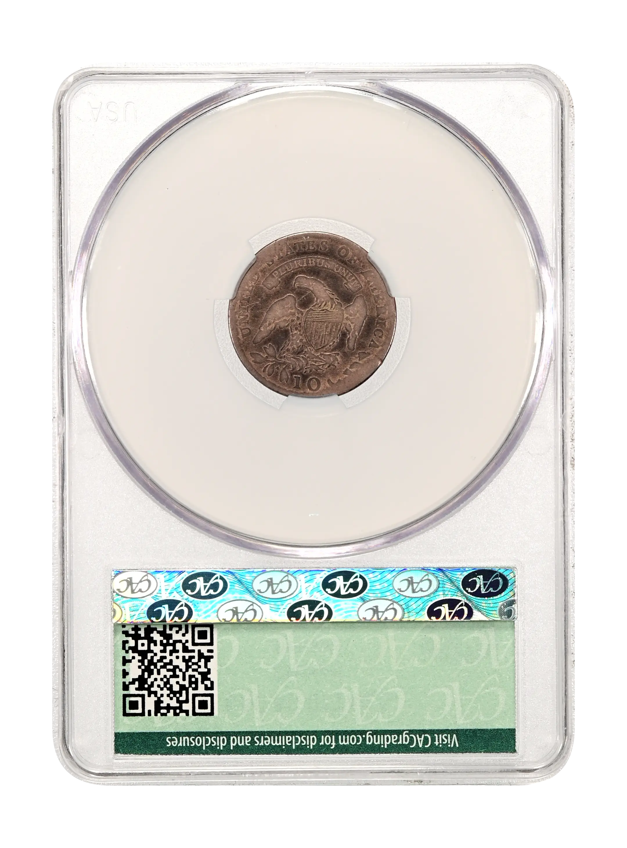 Reverse: An eagle is centered in the design with a shield over its chest, holding arrows and olive branches in its talons. A ribbon above bears the motto E PLURIBUS UNUM with UNITED STATES OF AMERICA around the periphery. The denomination listed as "10 C." appears at the bottom.