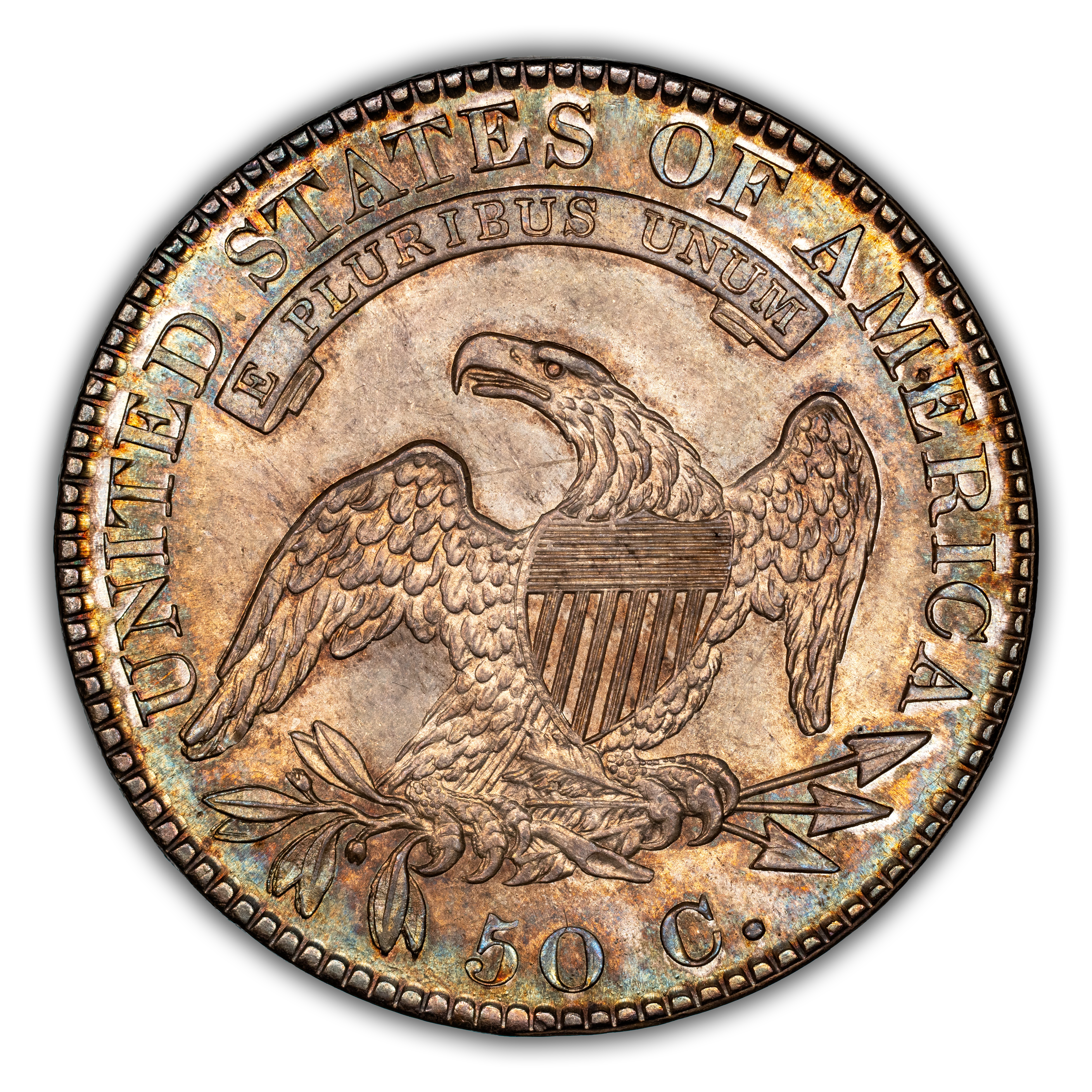 Reverse: An heraldic eagle holding olive branches and 3 arrows in its claws is surrounded by the words UNITED STATES OF AMERICA around the periphery. A ribbon below bears the motto E PLURIBUS UNUM. The denomination of 50C is centered below the eagle.