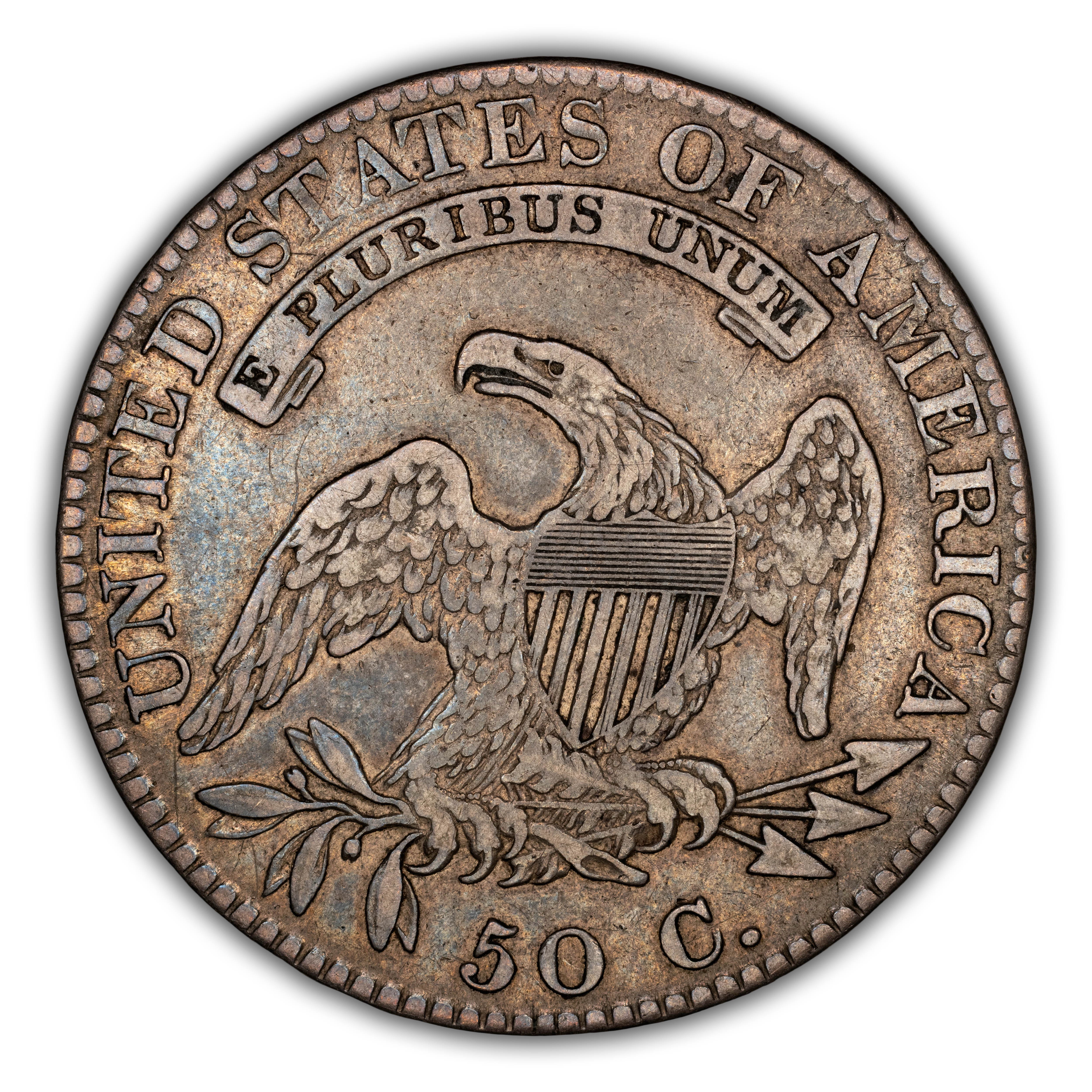 Reverse: An heraldic eagle holding olive branches and 3 arrows in its claws is surrounded by the words UNITED STATES OF AMERICA around the periphery. A ribbon below bears the motto E PLURIBUS UNUM. The denomination of 50C is centered below the eagle.
