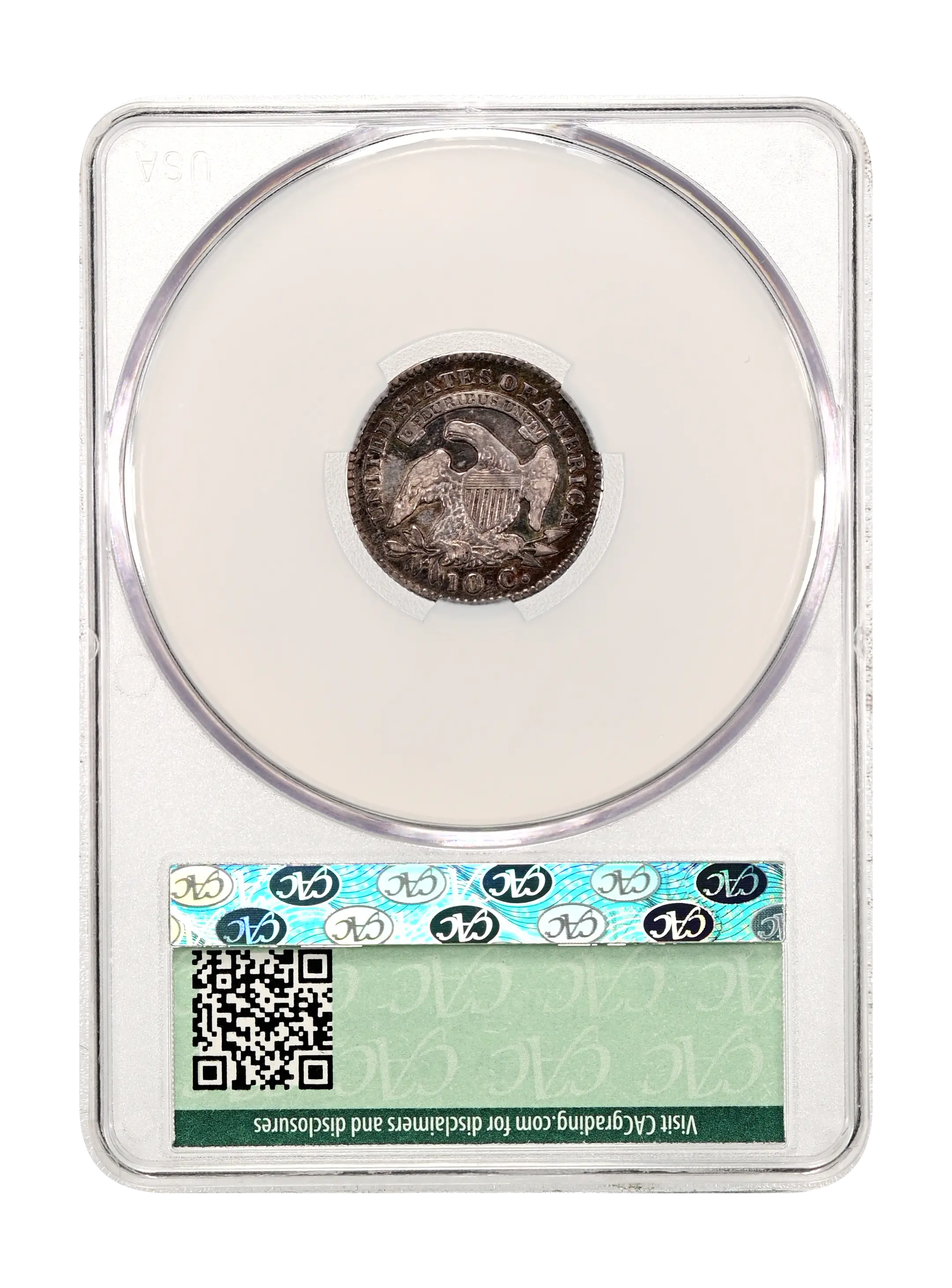 Capped Bust dimes, designed by John Reich, are generally more common than the Draped Bust issues. However, like their earlier counterparts they are challenging to locate in the better Mint States grades. The 1822 and 1829 Curl Base 2 are the rarest issues, with both regularly trading in the four-figure range.