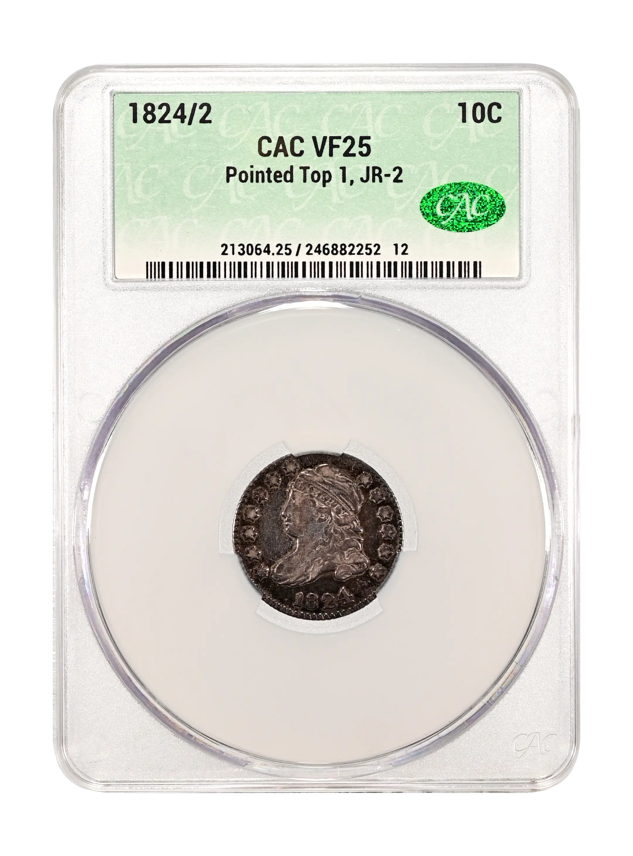 1824/2 10C Pointed Top 1, JR-2, High R.5, VF20 PCGS. Ex: David J. Davis. All 1824-dated dimes are overdates, with the 2 und...