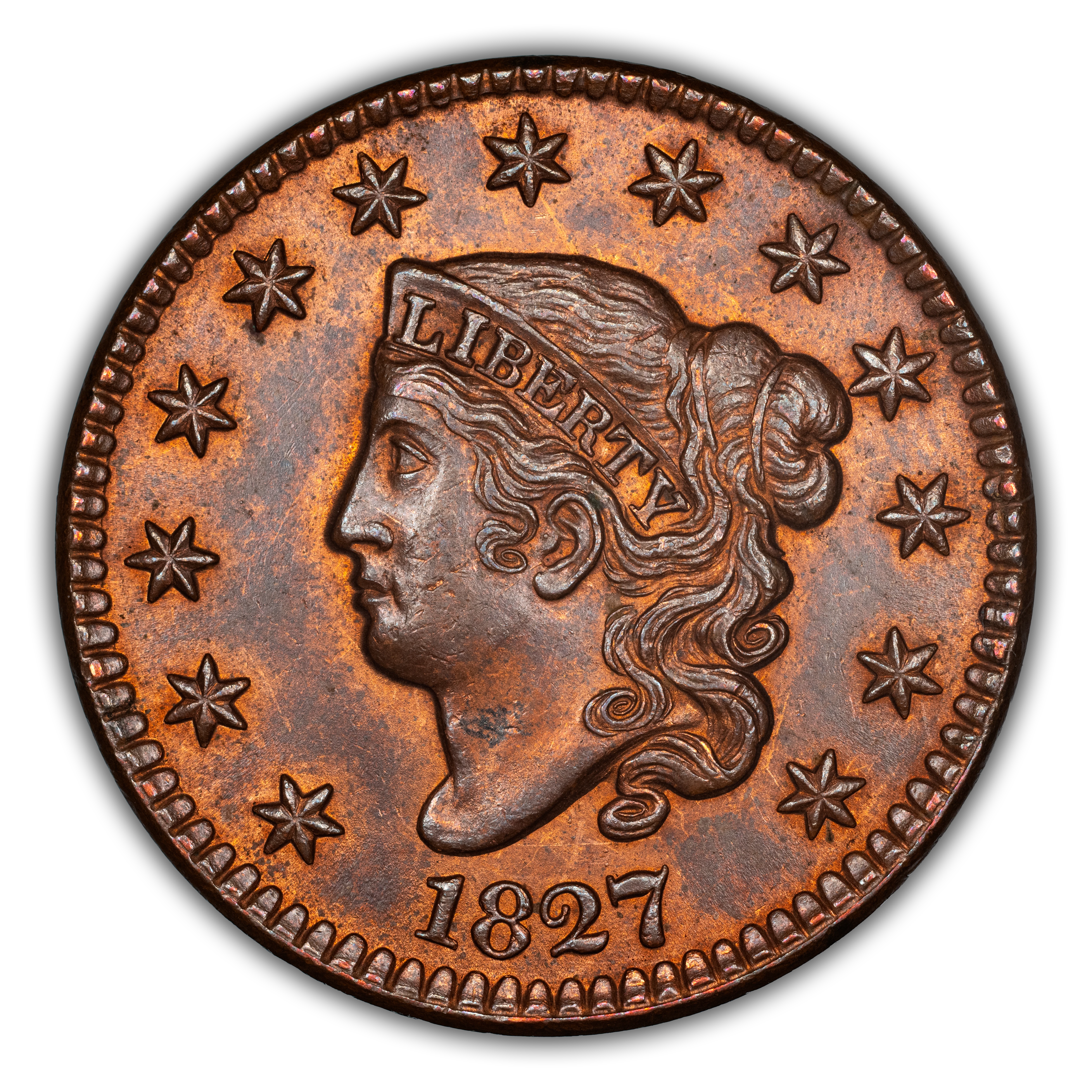 1827 Matron Head Cent. N-11. Rarity-1. MS-65 BN (PCGS). CAC.