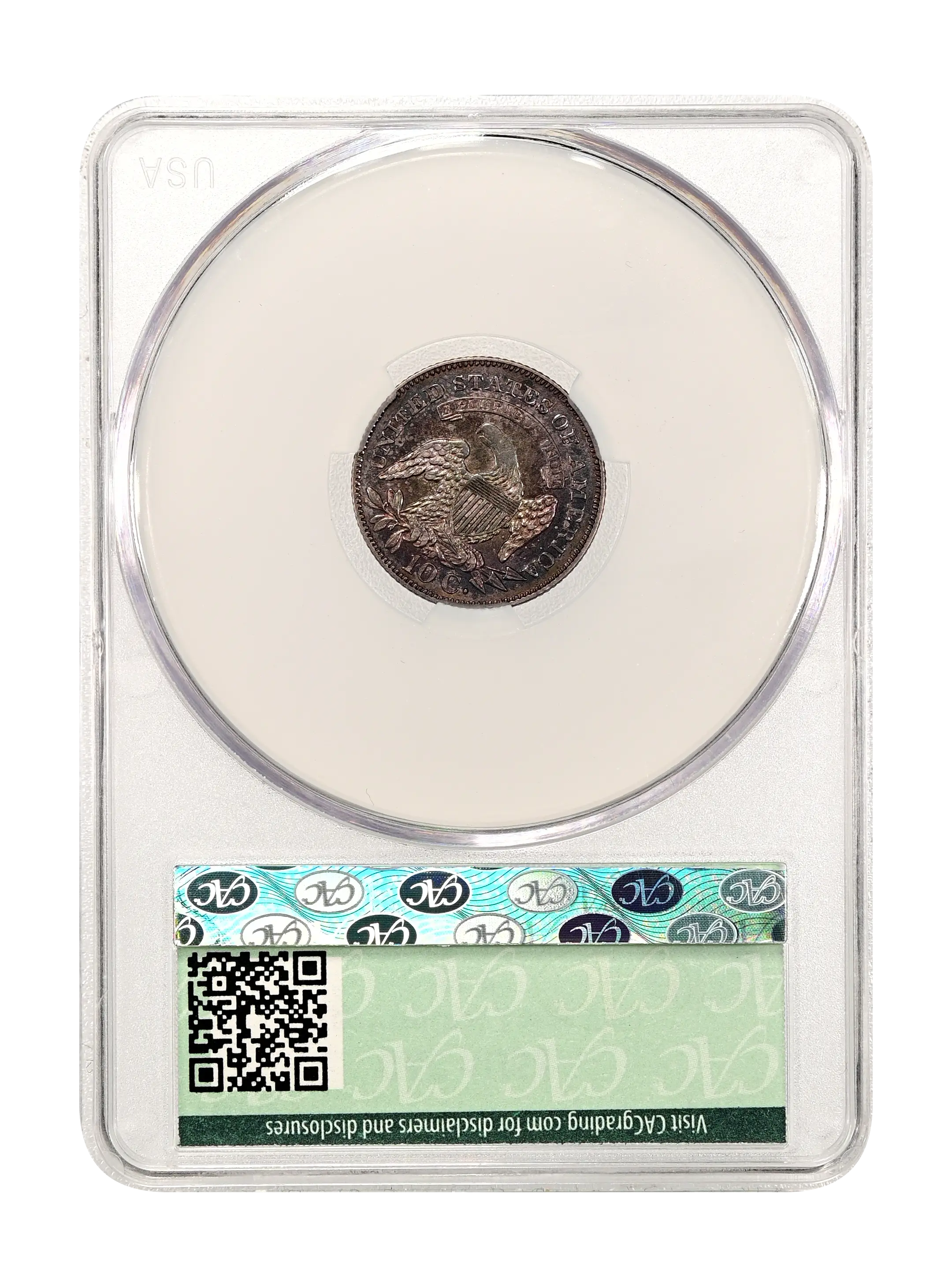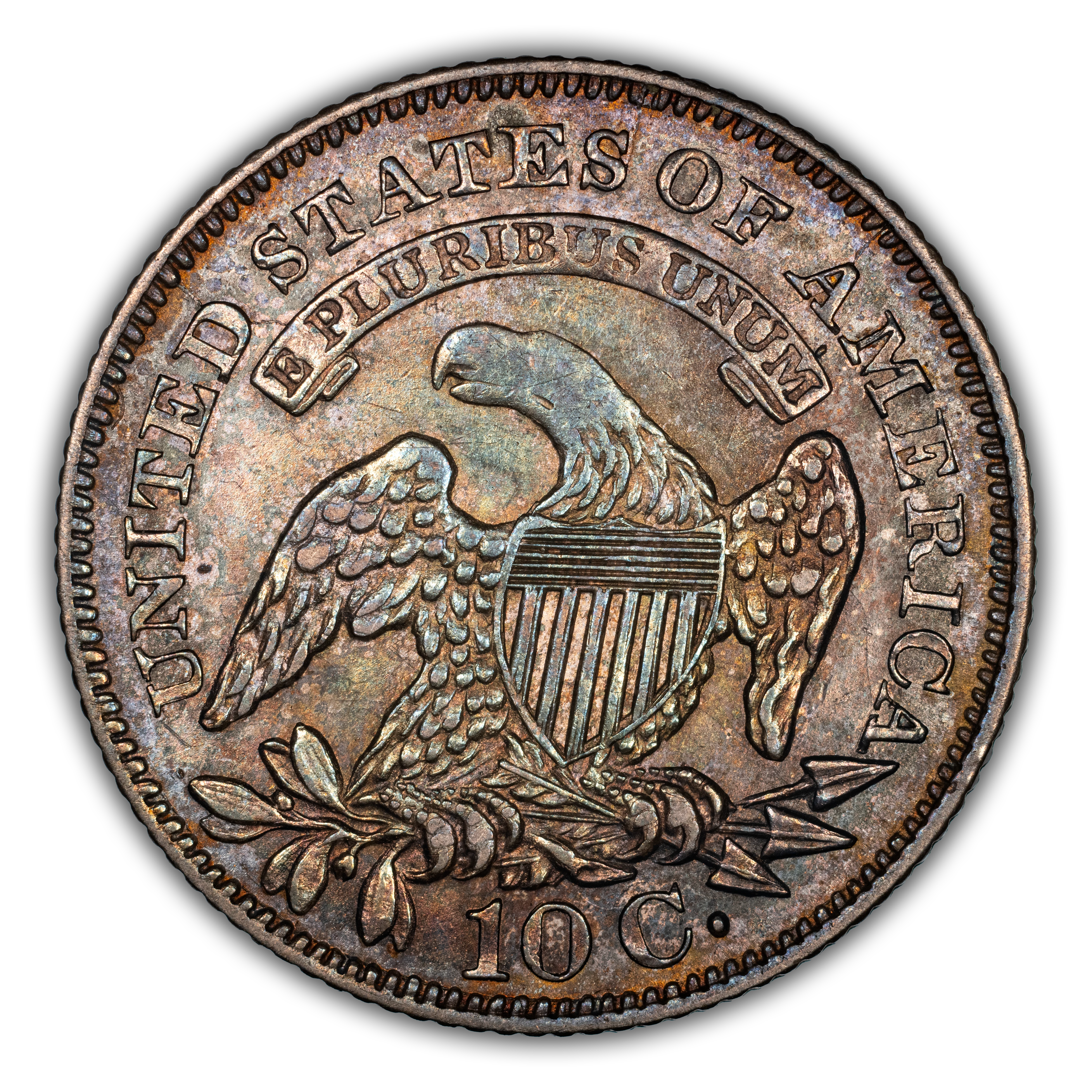 Capped Bust dimes, designed by John Reich, are generally more common than the Draped Bust issues. However, like their earlier counterparts they are challenging to locate in the better Mint States grades. The 1822 and 1829 Curl Base 2 are the rarest issues, with both regularly trading in the four-figure range.