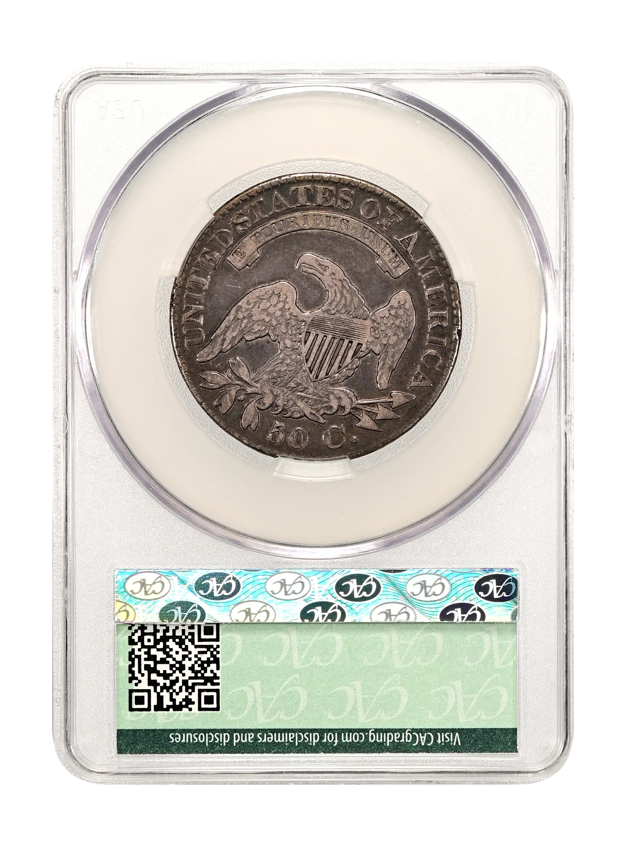 Reverse: An heraldic eagle holding olive branches and 3 arrows in its claws is surrounded by the words UNITED STATES OF AMERICA around the periphery. A ribbon below bears the motto E PLURIBUS UNUM. The denomination of 50C is centered below the eagle.