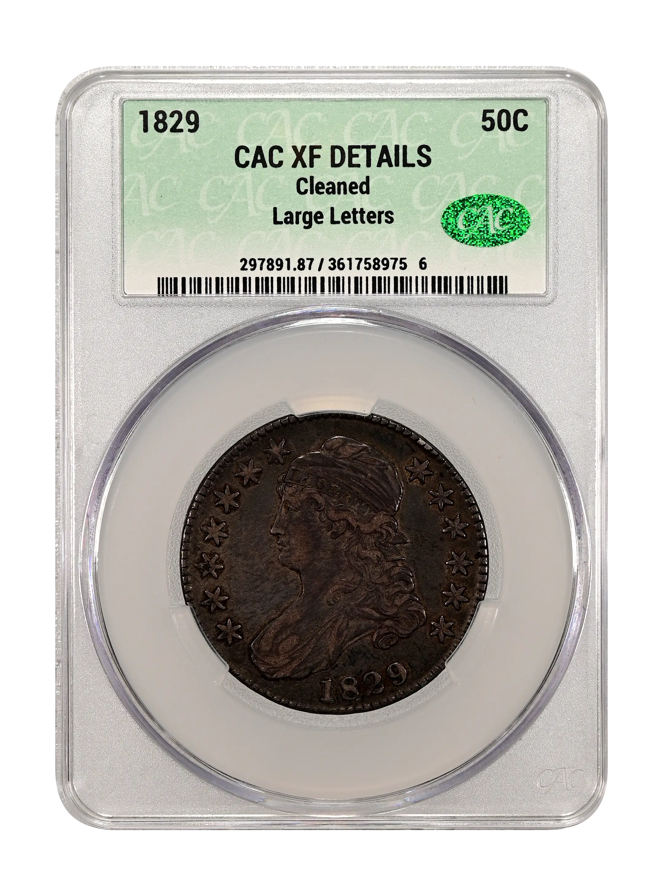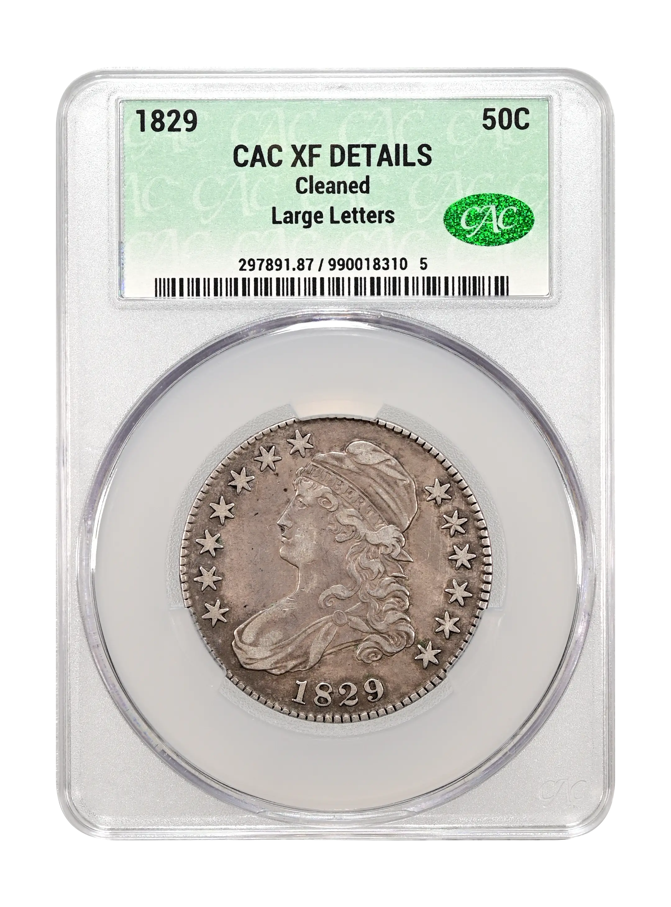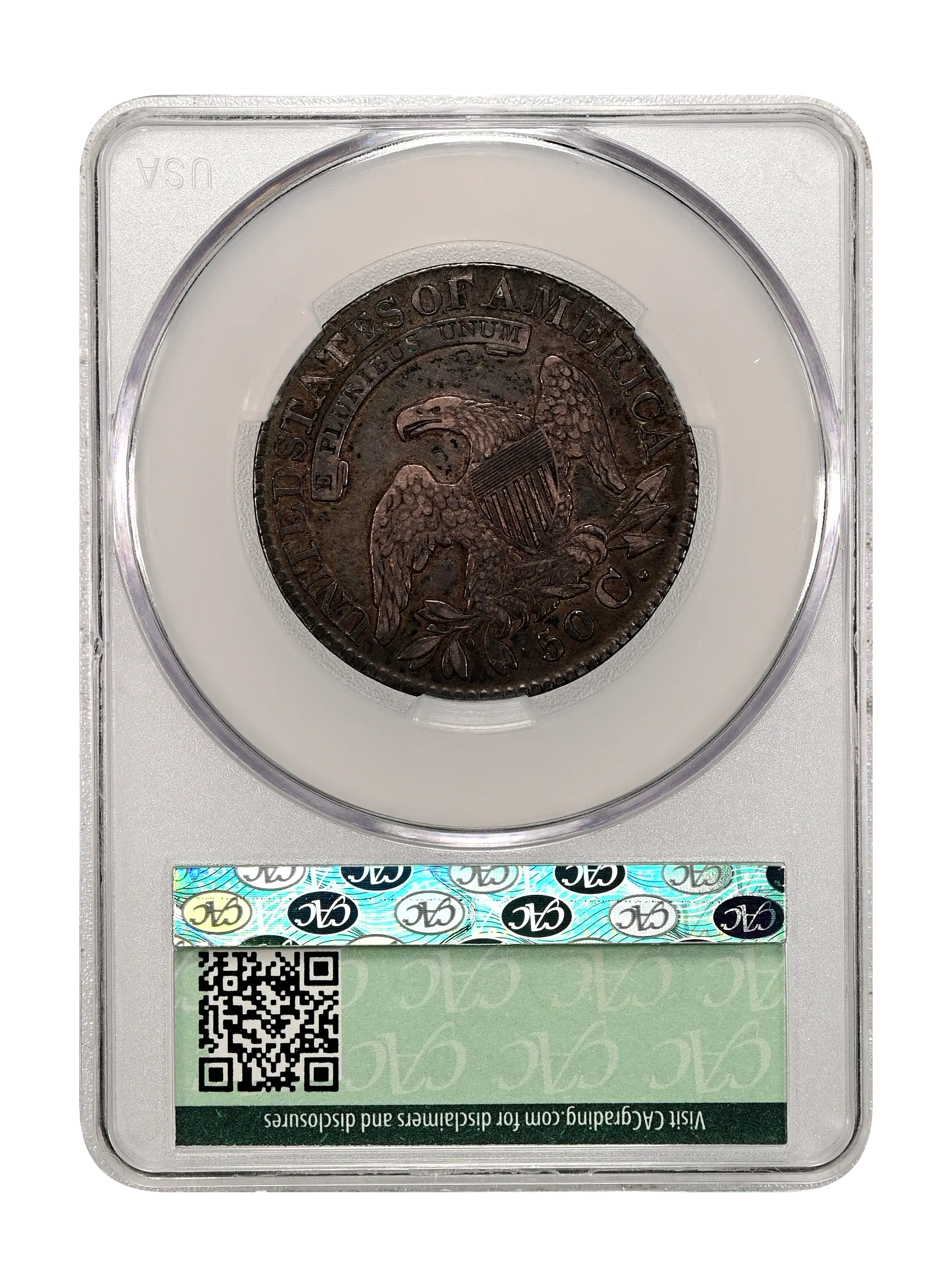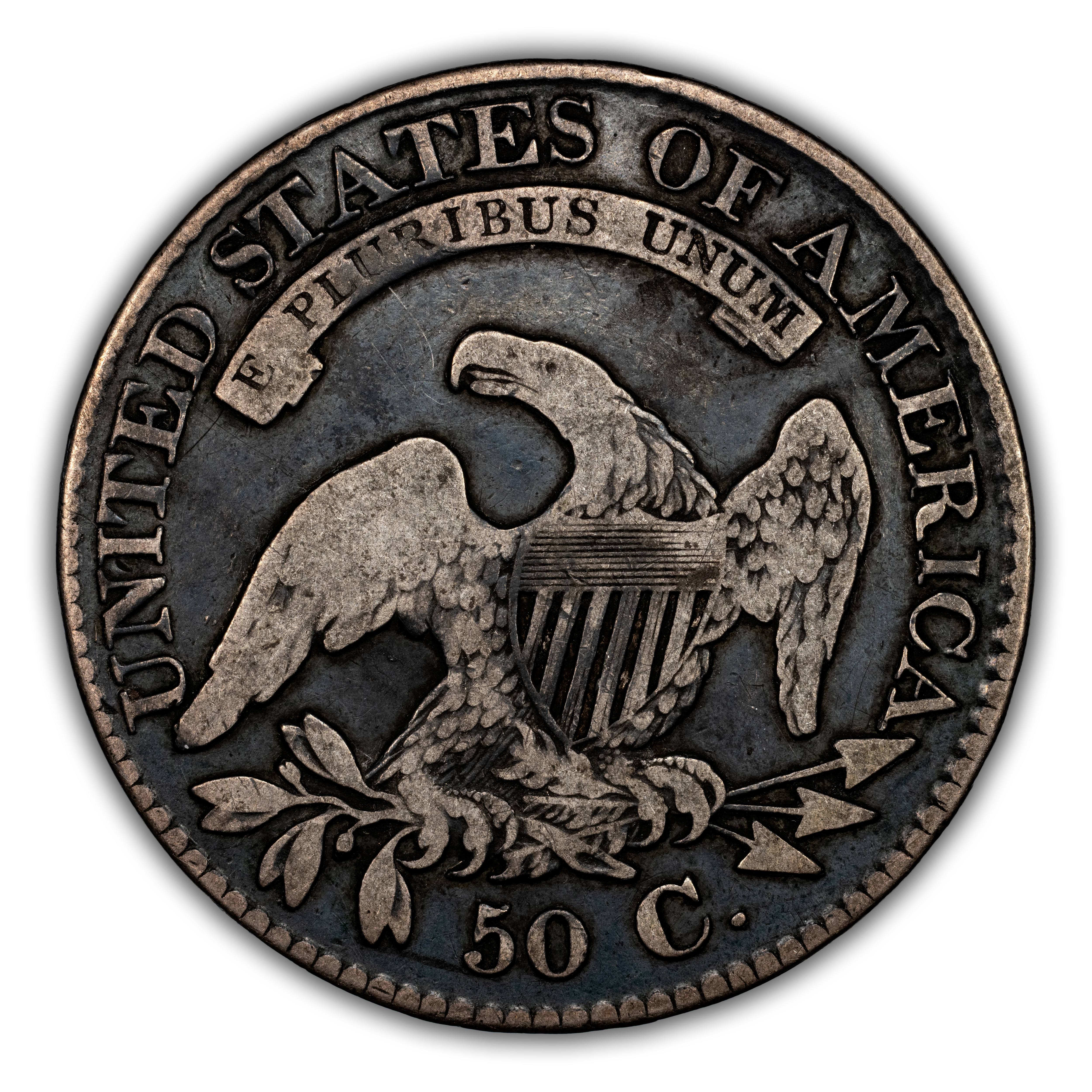 Reverse: An heraldic eagle holding olive branches and 3 arrows in its claws is surrounded by the words UNITED STATES OF AMERICA around the periphery. A ribbon below bears the motto E PLURIBUS UNUM. The denomination of 50C is centered below the eagle.