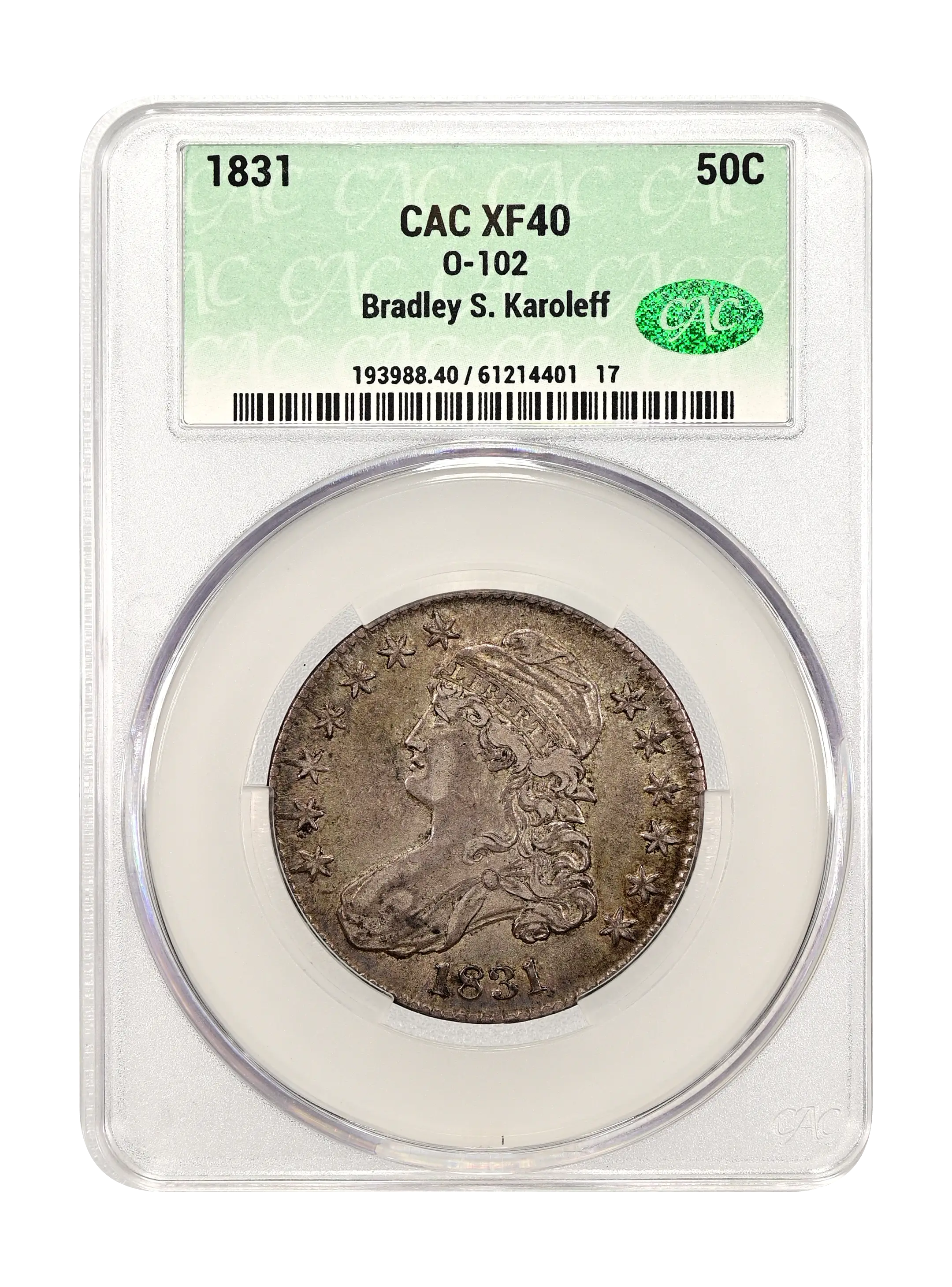 1831 50C O-102, R.1, AU55 PCGS. Housed in a Generation 3.1 green label holder. CDN: $400 Whsle. Bid for NGC/PCGS AU55. Mint...