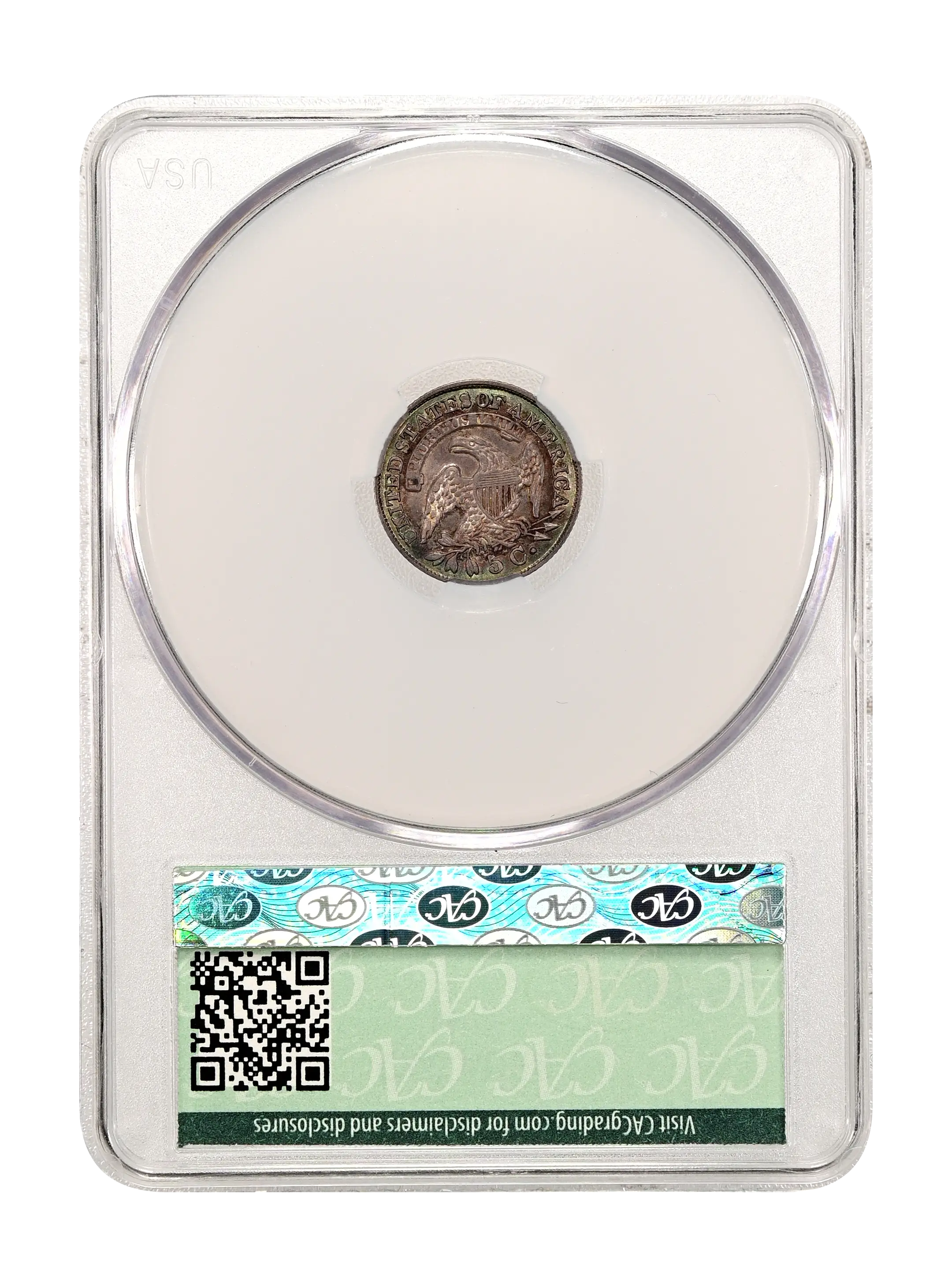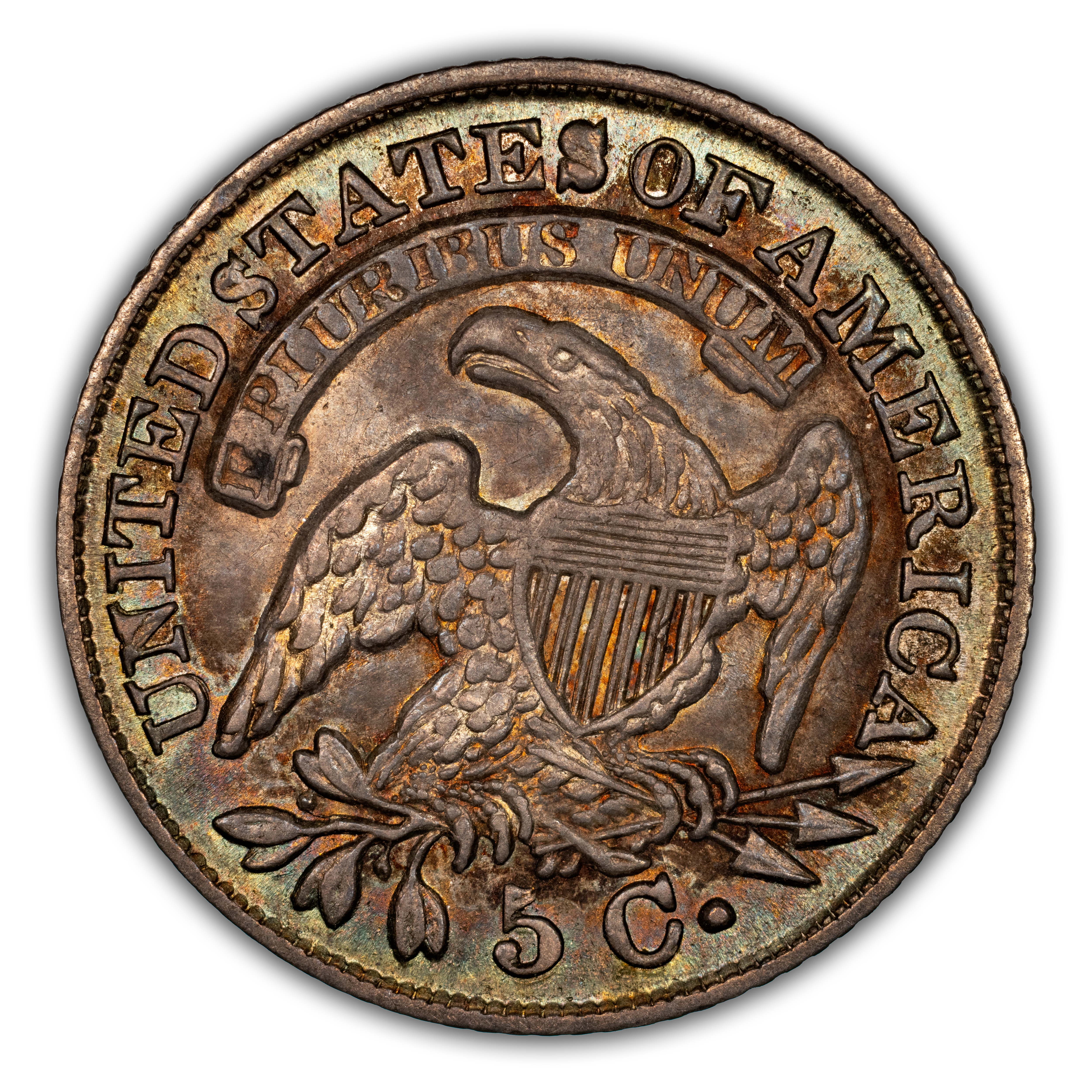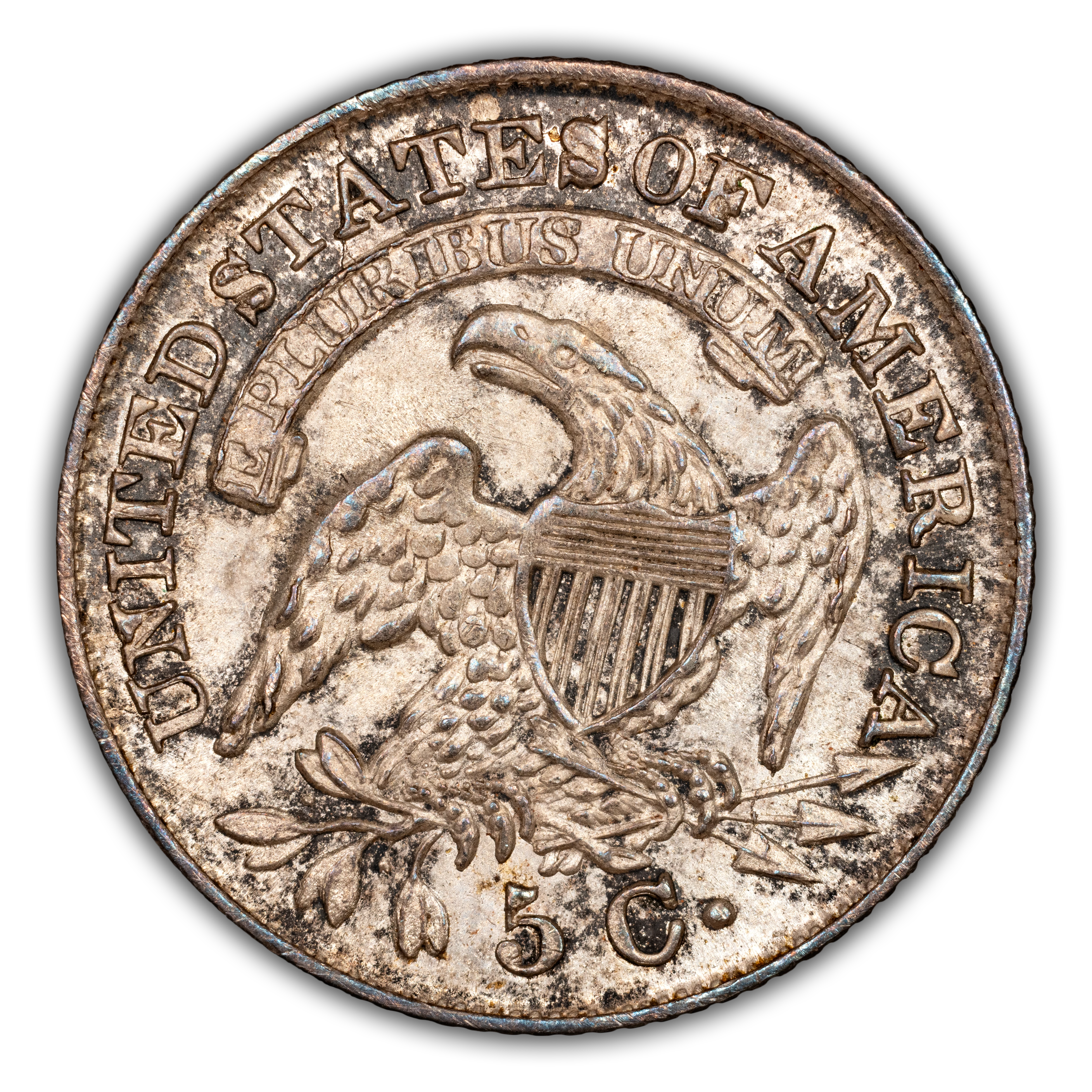 Reverse: An eagle is centered in the design with a shield over its chest, holding arrows and olive branches in its talons. A ribbon above bears the motto E PLURIBUS UNUM with UNITED STATES OF AMERICA around the periphery. The denomination listed as "5C." appears at the bottom.