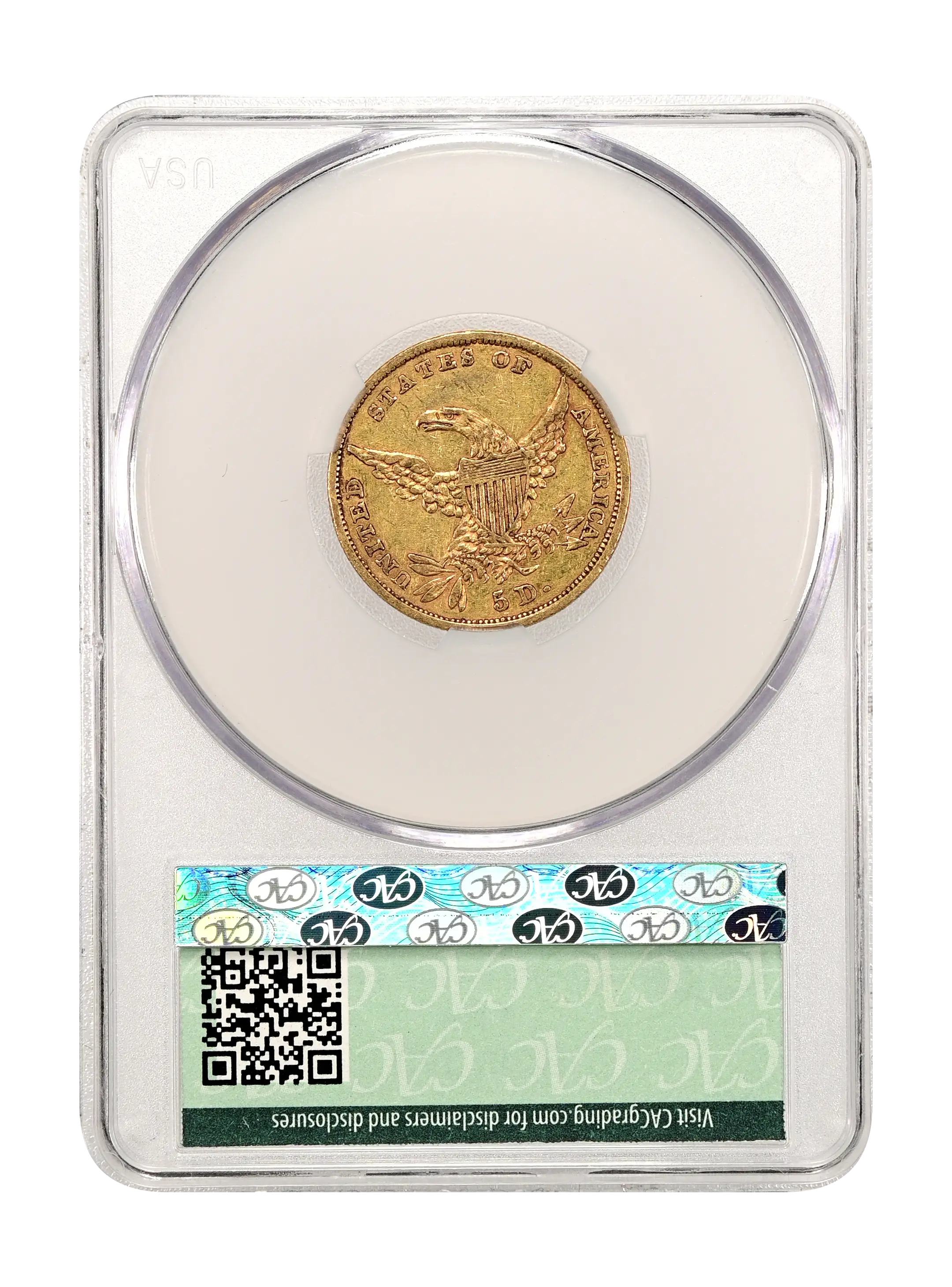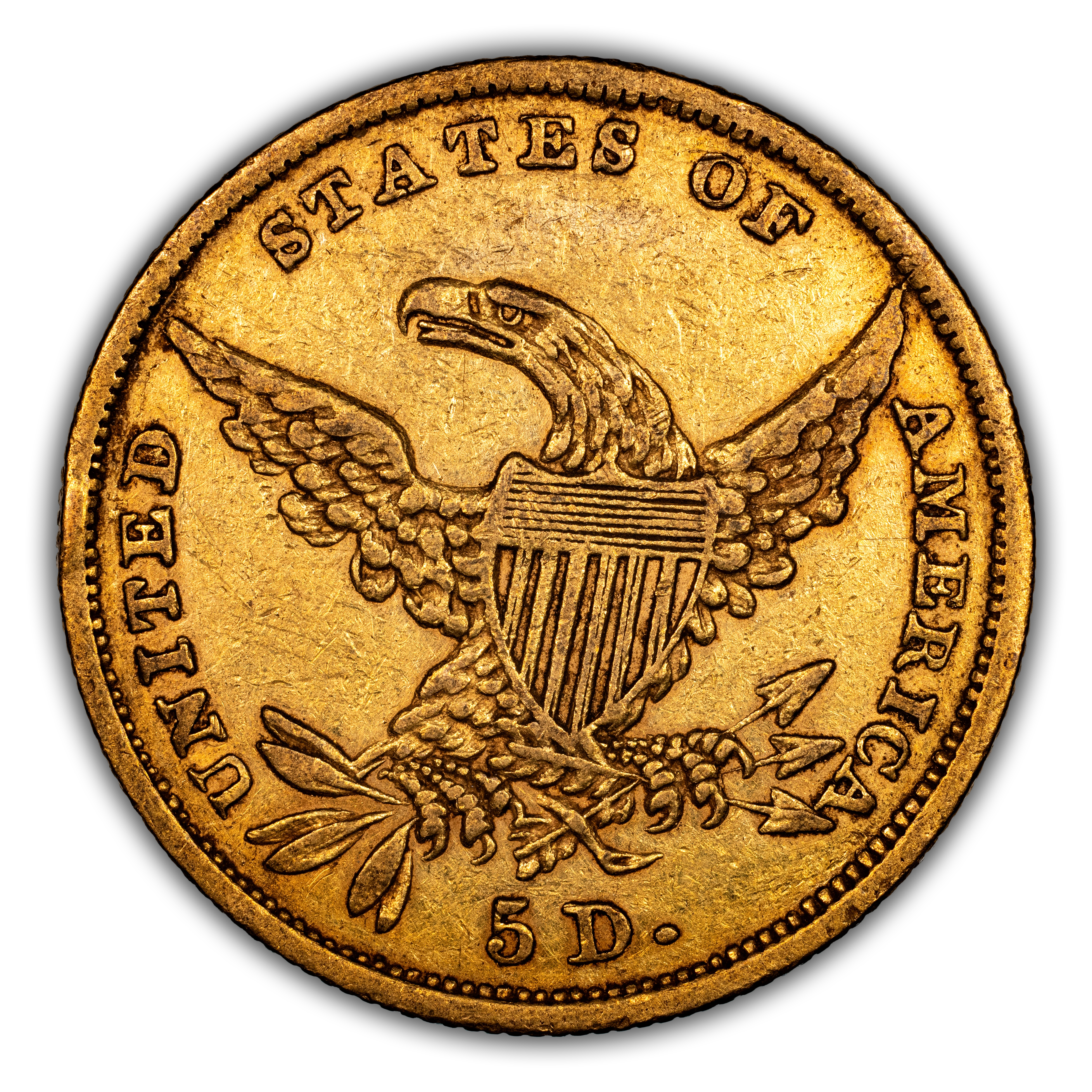 Reverse: An eagle with wings fully spread. The words UNITED STATES OF AMERICA around the periphery with "5 D." written as a fraction appears at the bottom.