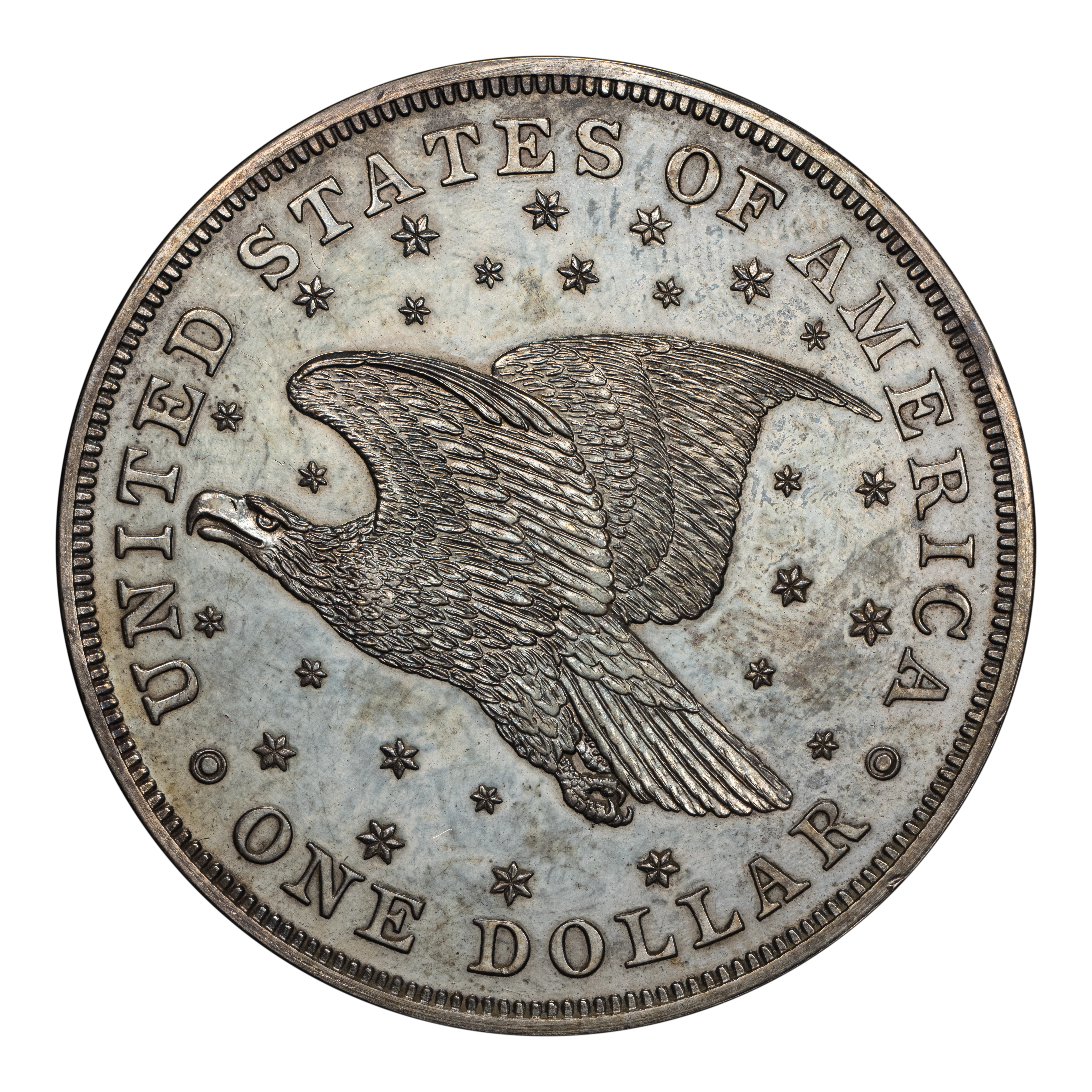 Reverse: A large eagle in flight soaring through a starry field. UNITED STATES OF AMERICA * ONE DOLLAR around the periphery.