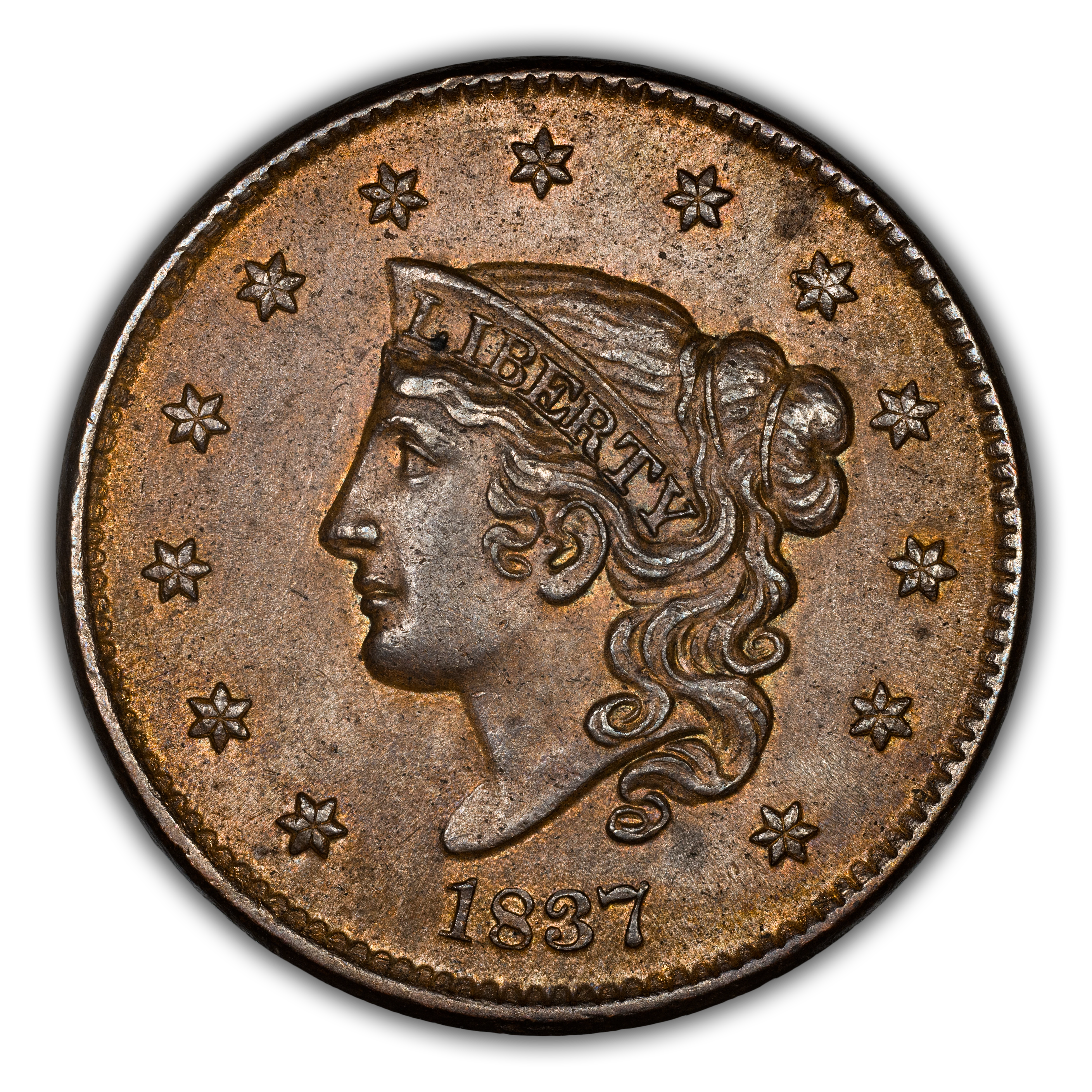 1837 1C Medium Letters, MS65 Brown NGC. NGC Census: (53/18). PCGS Population: (29/12). CDN: $1,300 Whsle. Bid for NGC/PCGS ...