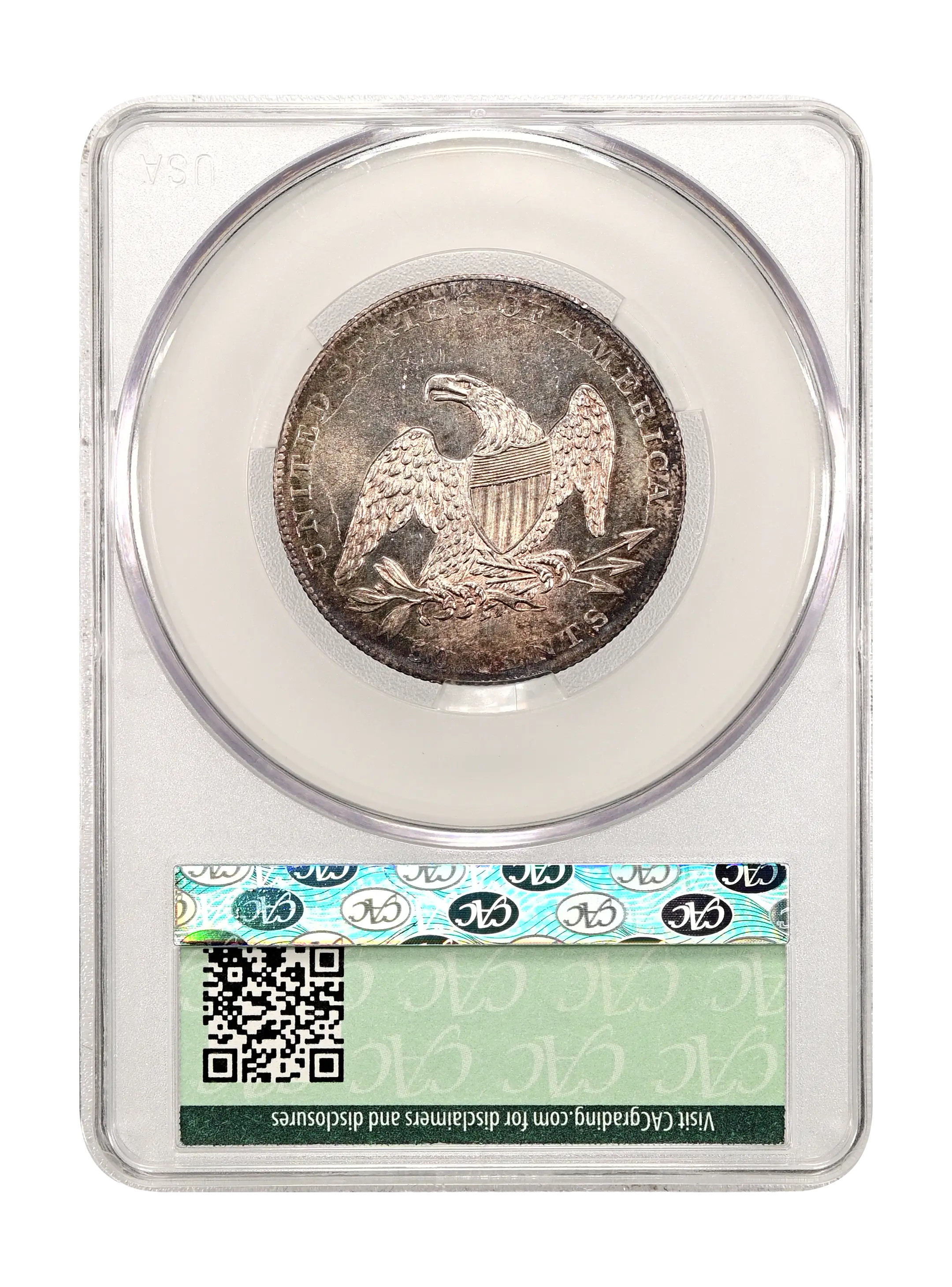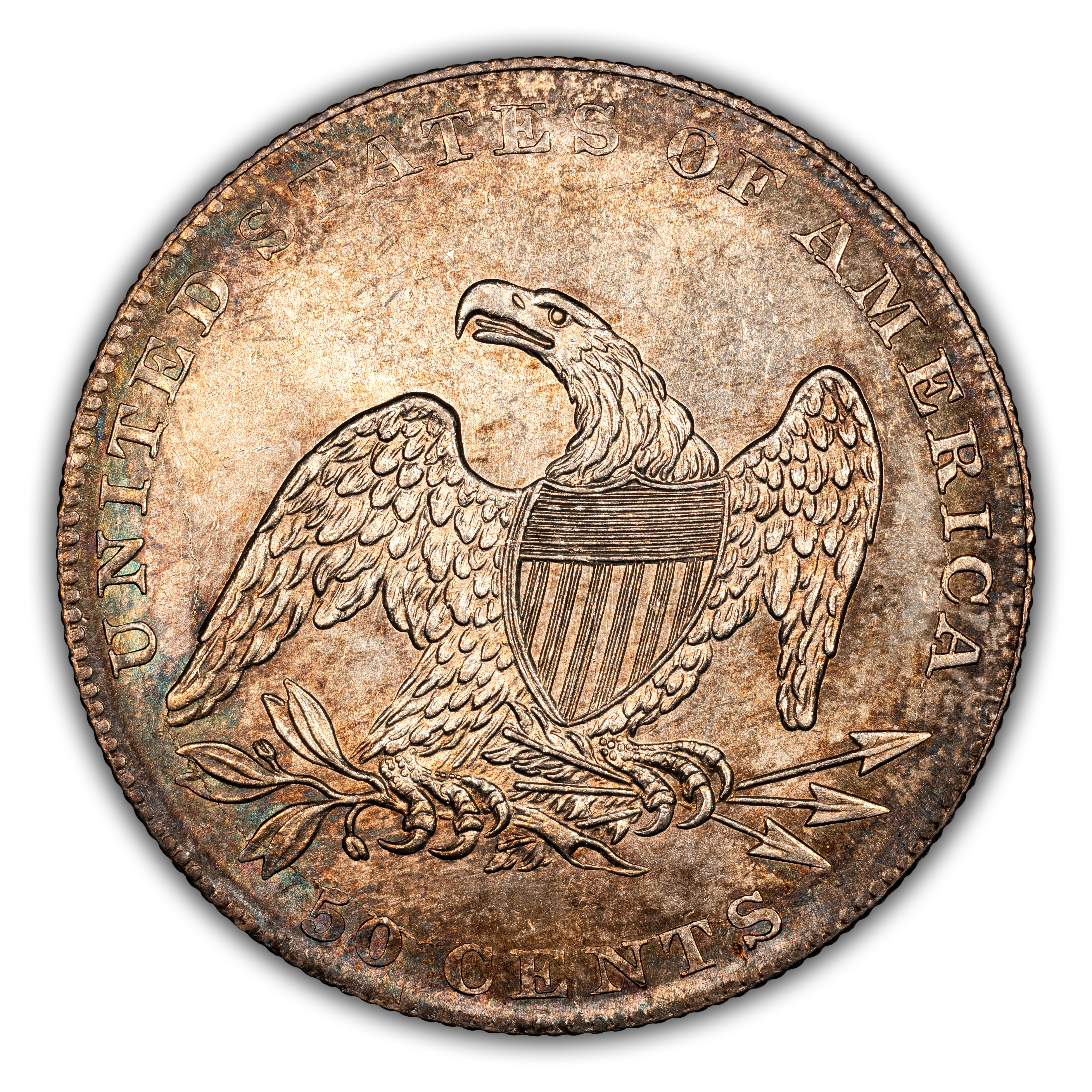 Reverse: An heraldic eagle holding olive branches and 3 arrows in its claws is surrounded by the words UNITED STATES OF AMERICA around the periphery. A ribbon below bears the motto E PLURIBUS UNUM. The denomination of 50 CENTS is centered below the eagle.
