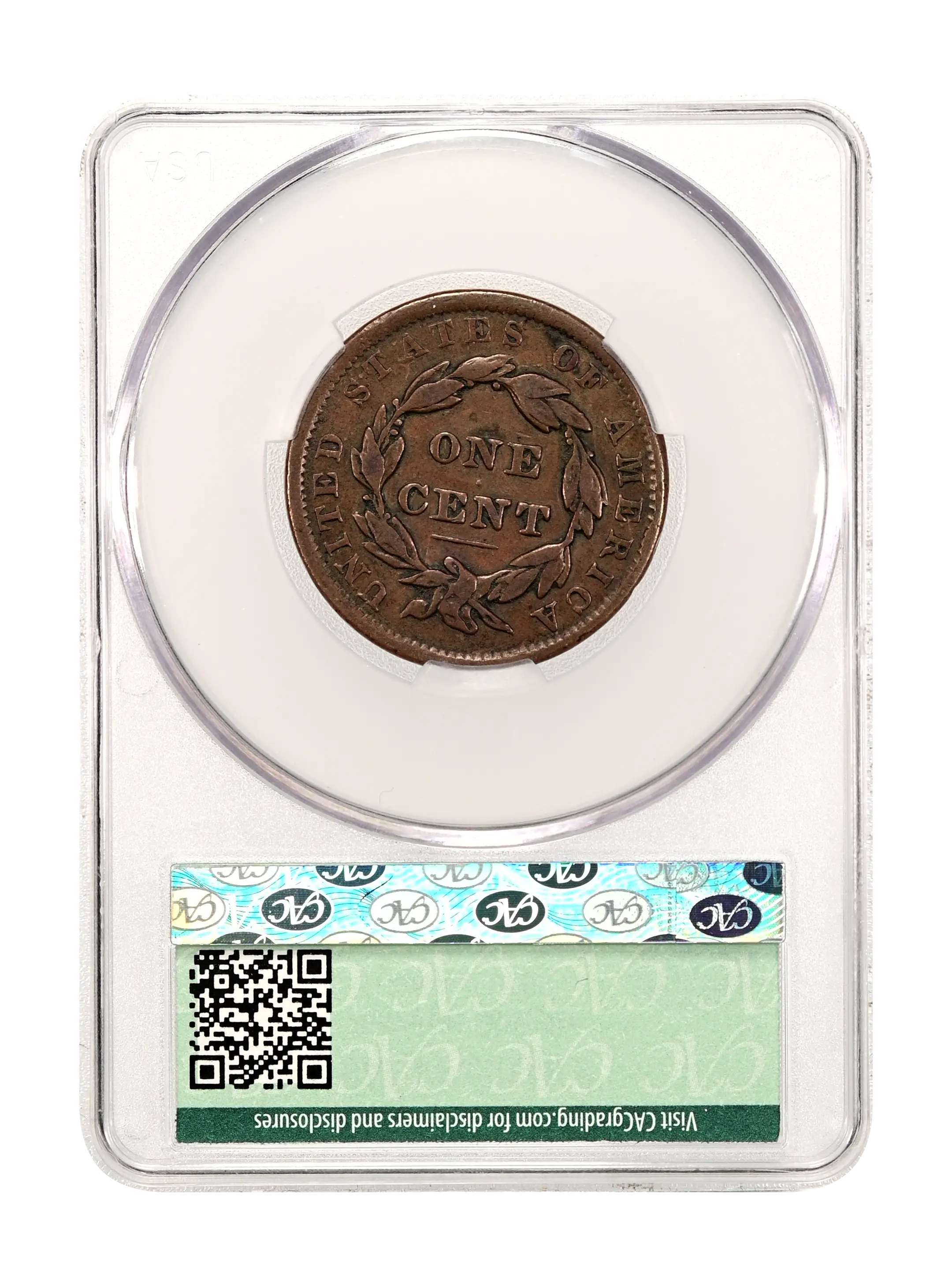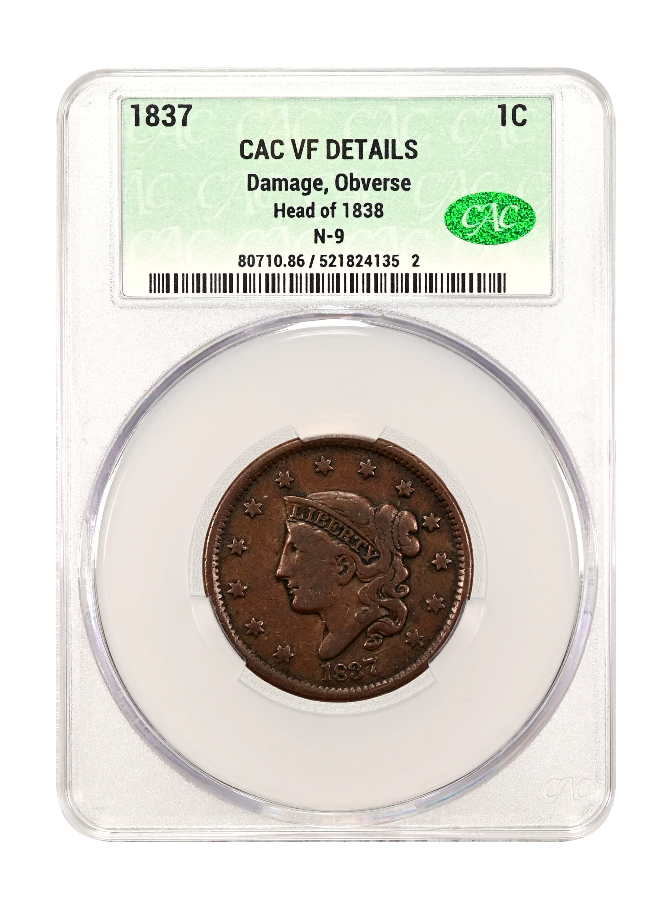 1837 1C Head of 1838, N-9, R.1, MS62 Brown NGC. Our EAC Grade AU50. This is a representative of an intermediate die state, ...