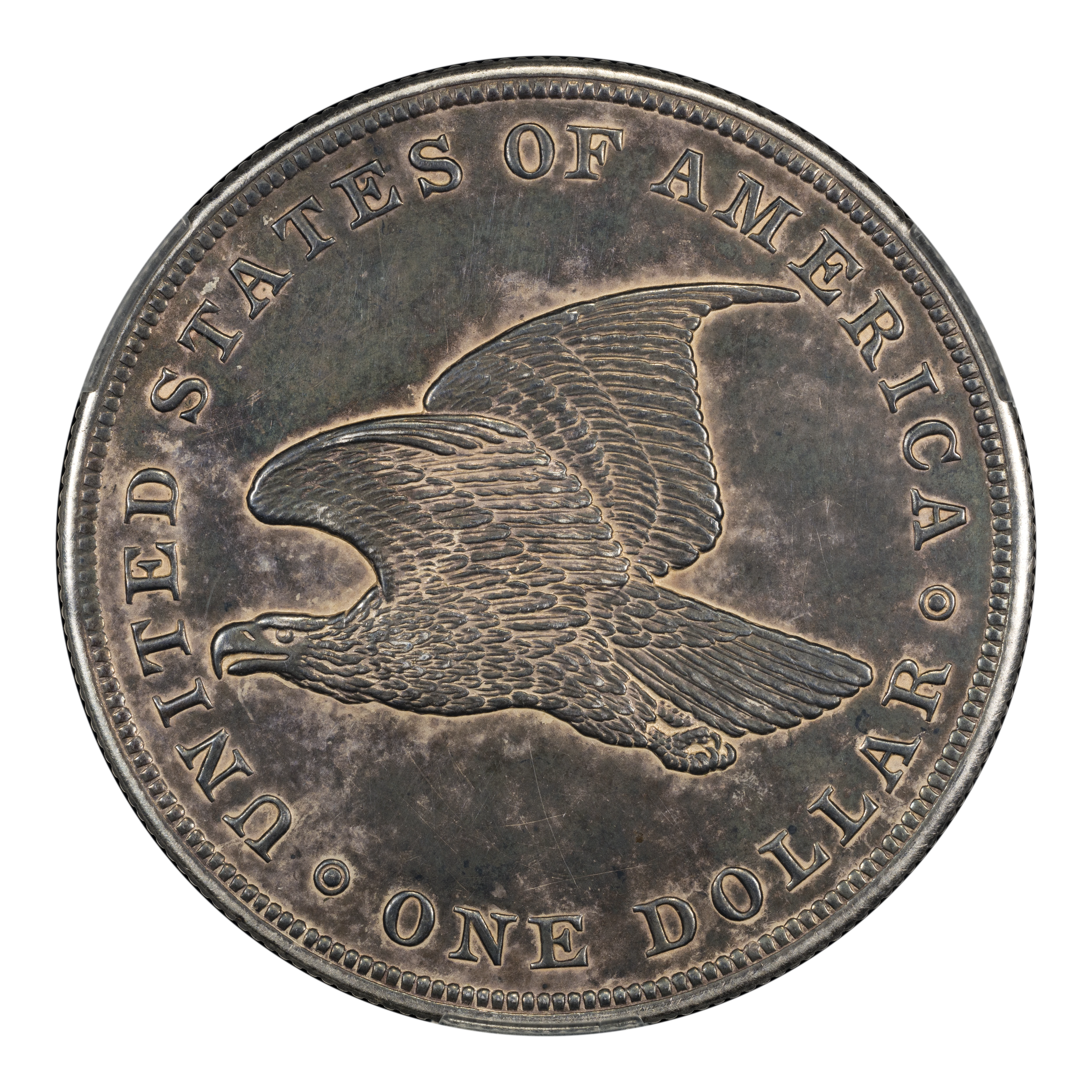 Reverse: A large eagle in flight soaring through a starry field. UNITED STATES OF AMERICA * ONE DOLLAR around the periphery.