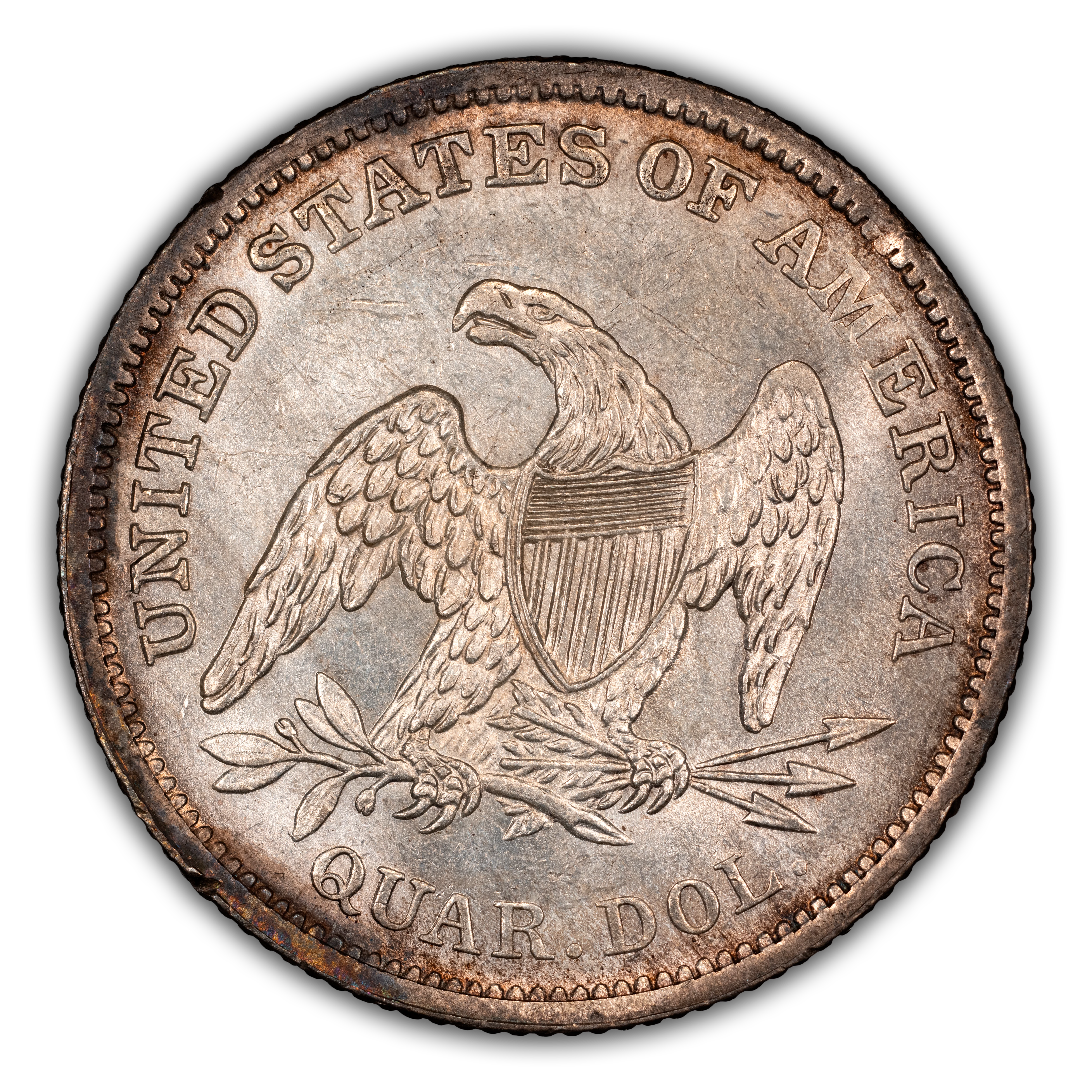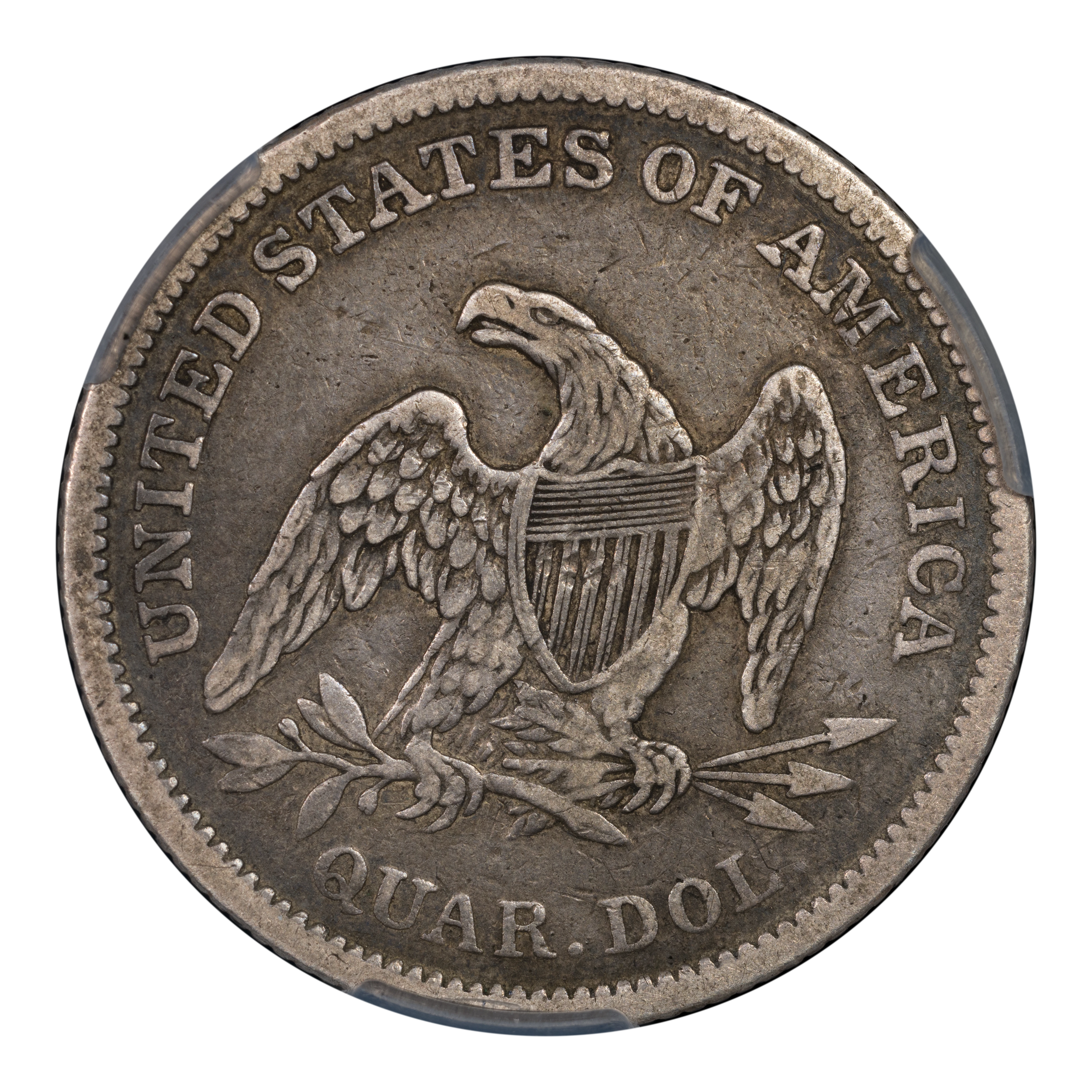 Reverse: The heraldic eagle is centered in the design with the words UNITED STATES OF AMERICA and QUAR. DOL. around the periphery.