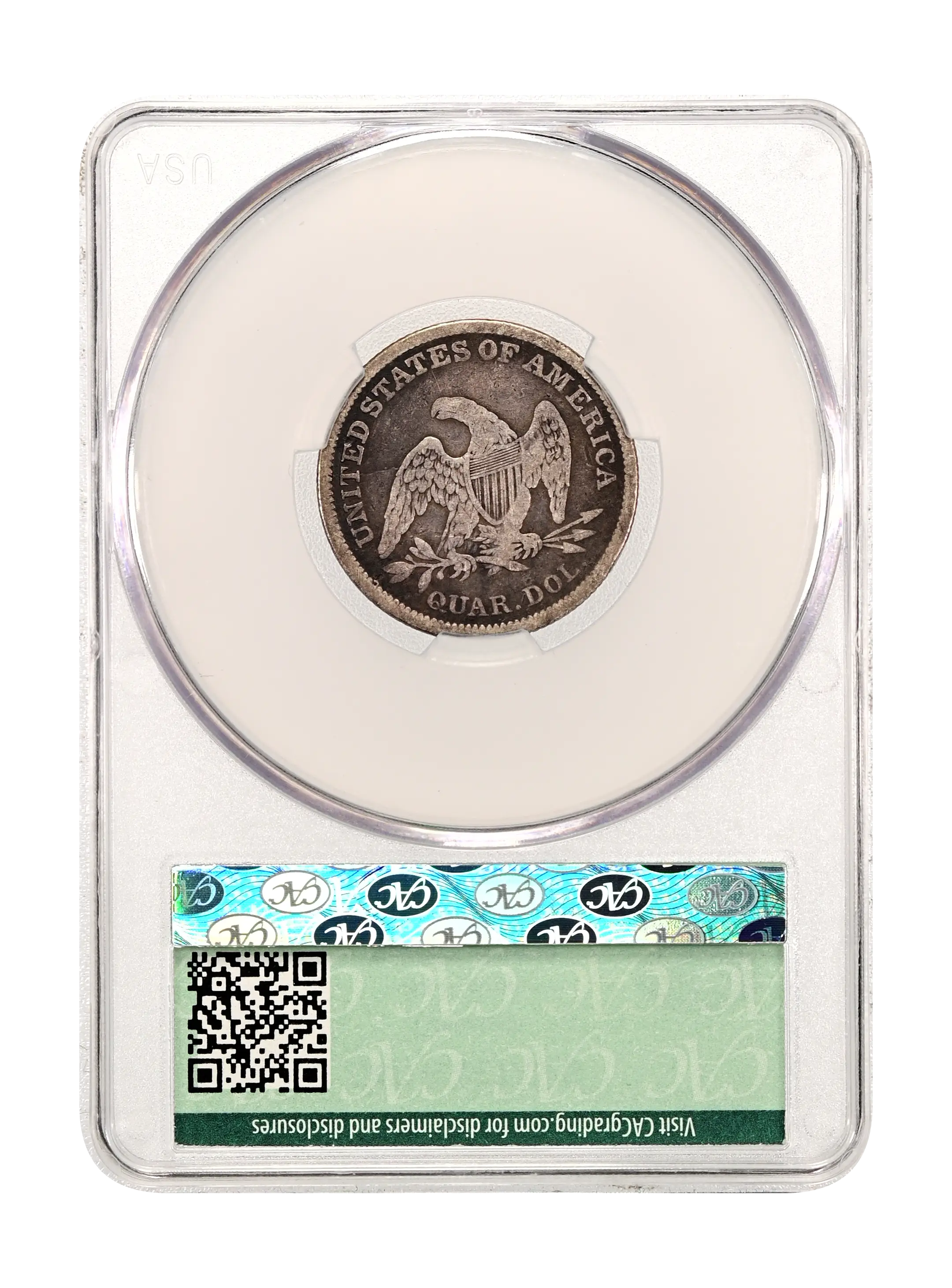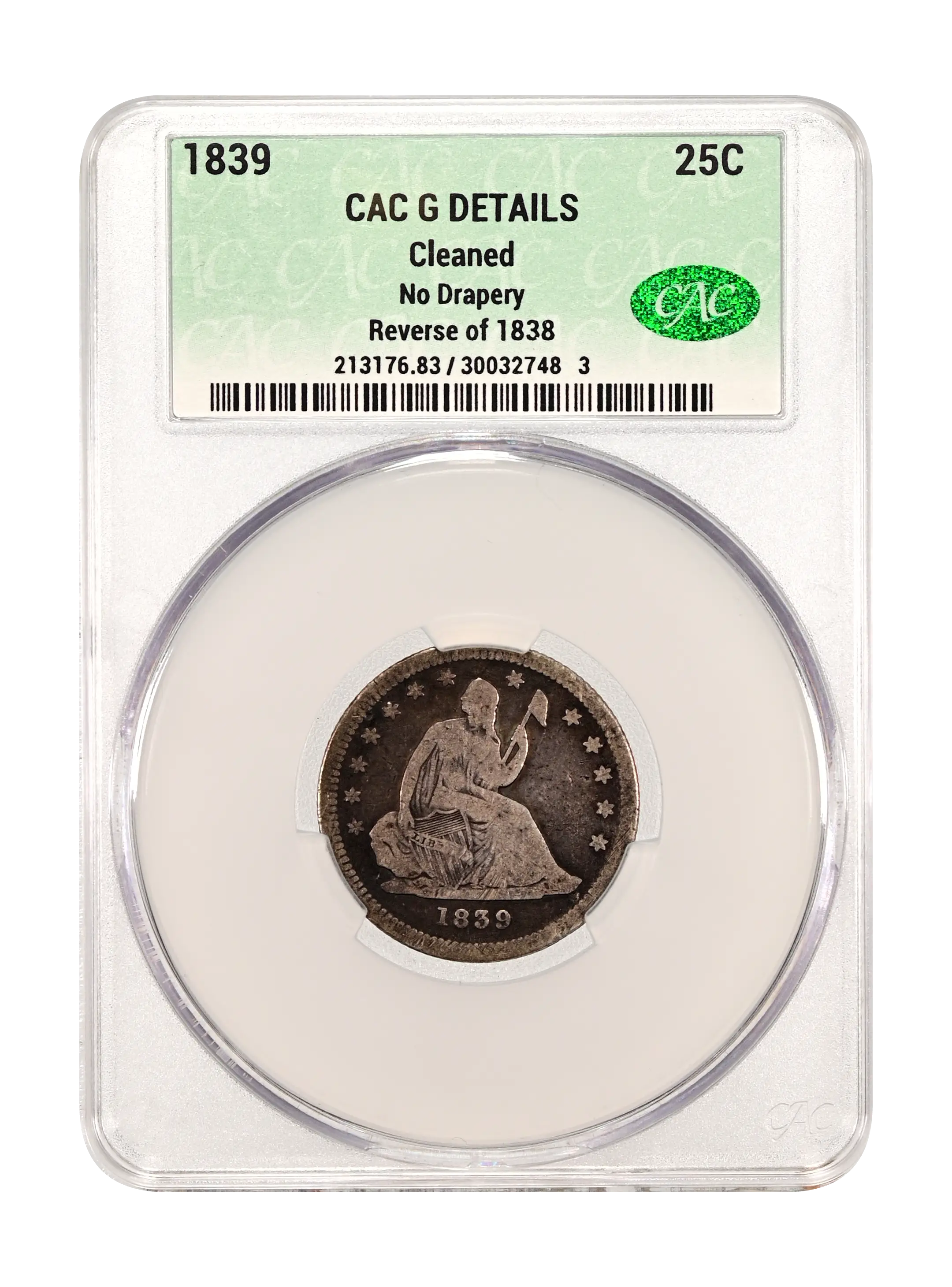 1839 No Drapery 25c Reverse of 1838 CAC G DETAILS