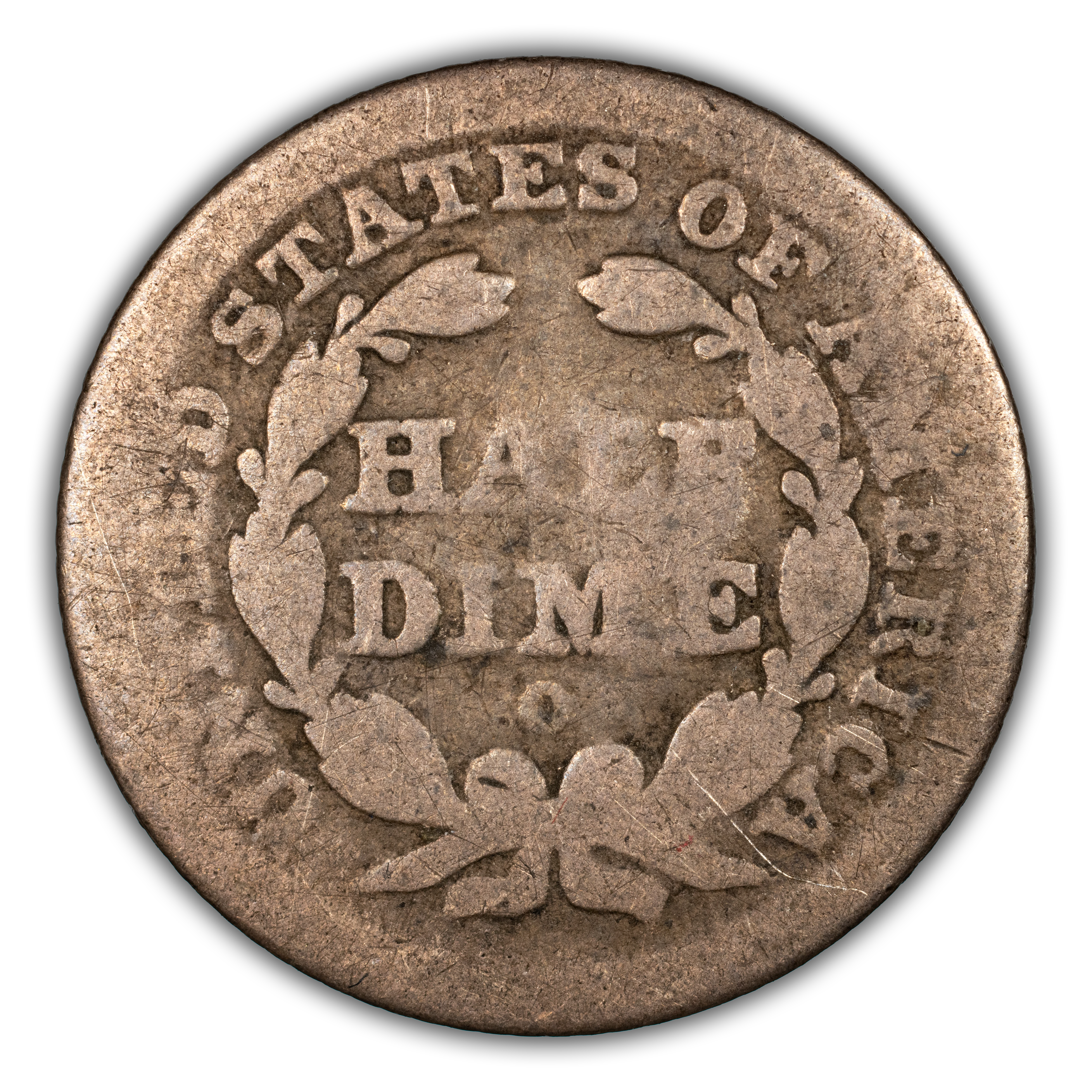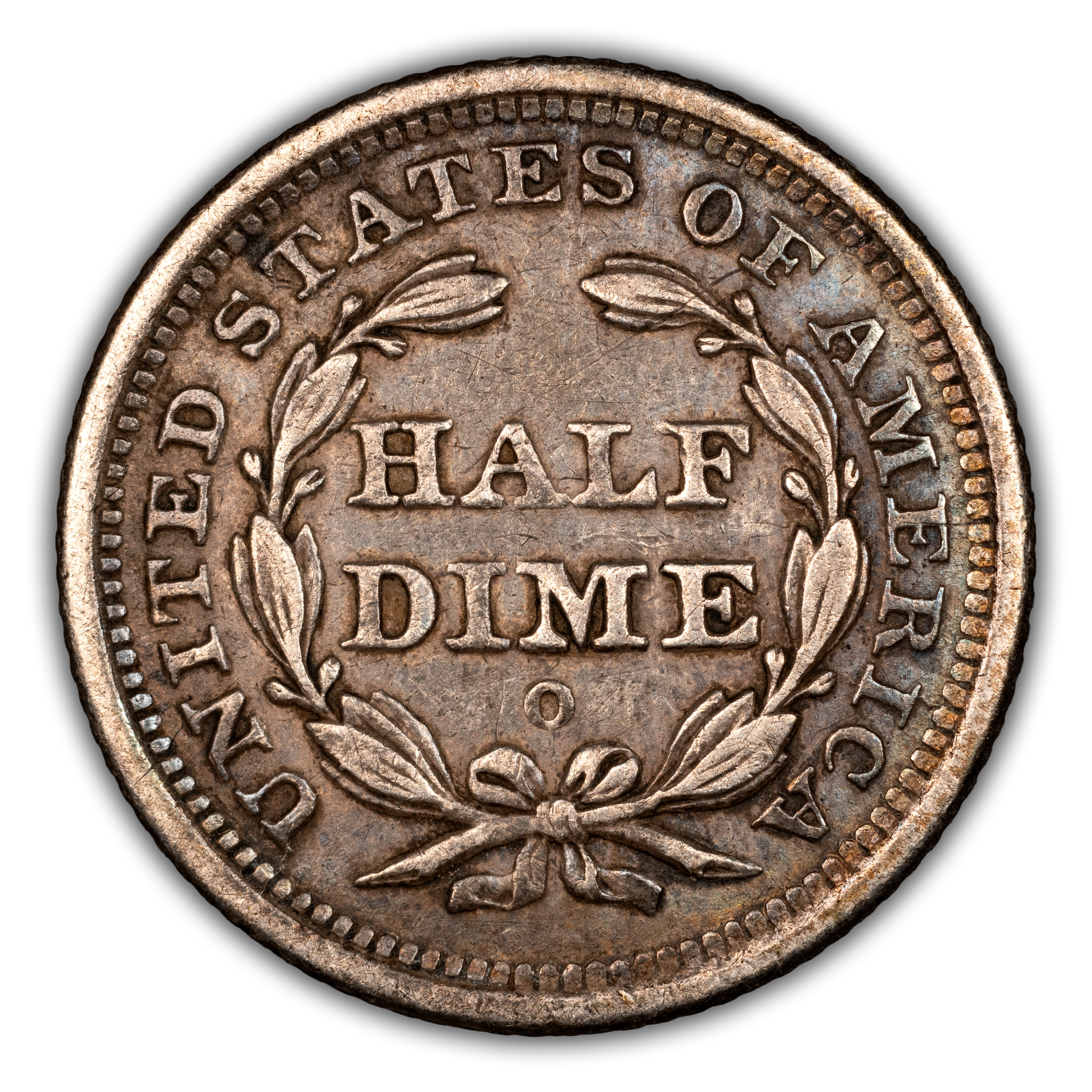 Reverse: The words HALF DIME are centered and surrounded by a wreath tied by ribbon and bow at the bottom with UNITED STATES OF AMERICA around the periphery. Mint mark, if any, appears at bottom center under the bow.