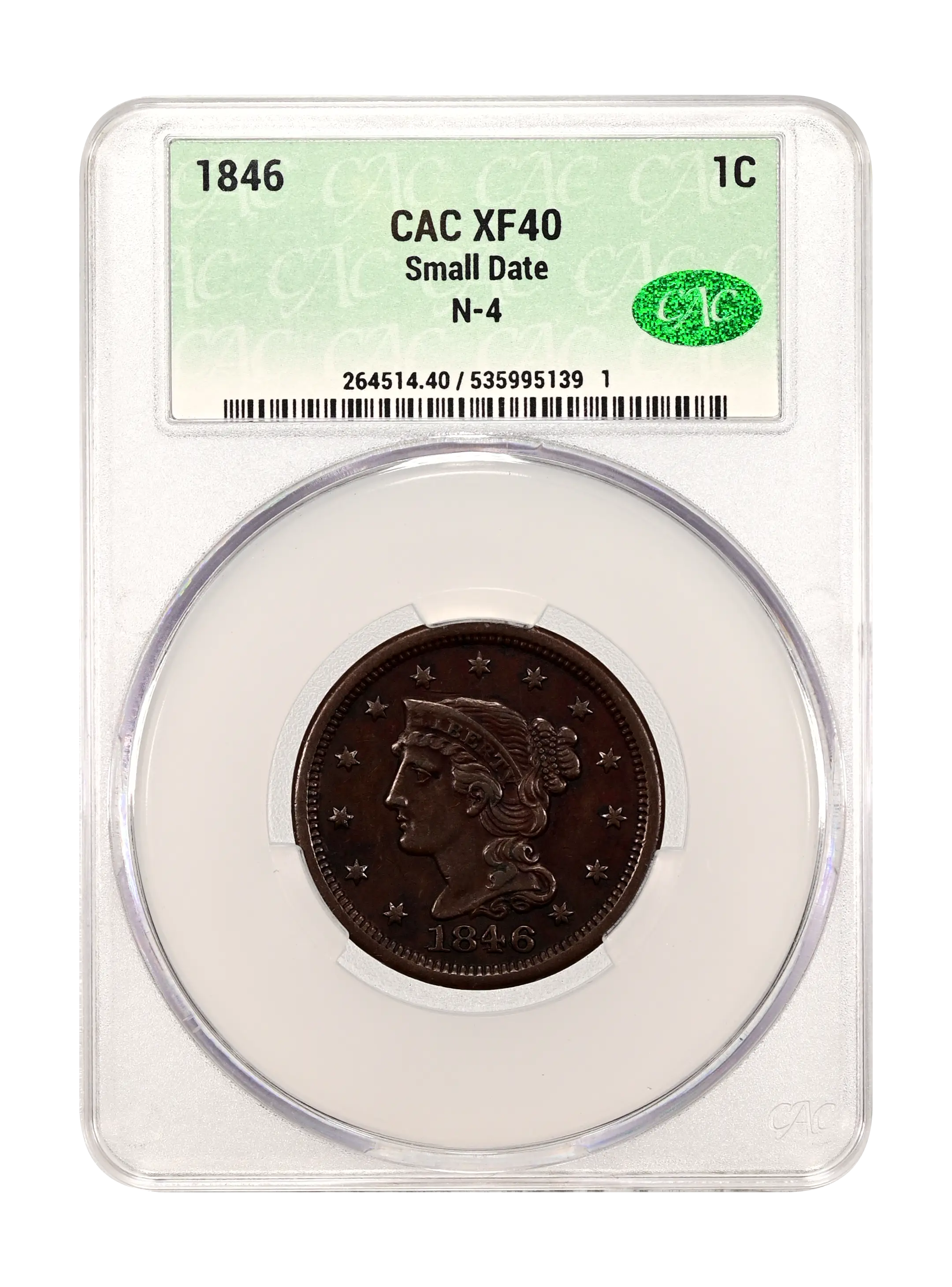 1846 Small Date 1c N-4 BN CAC XF40BN
