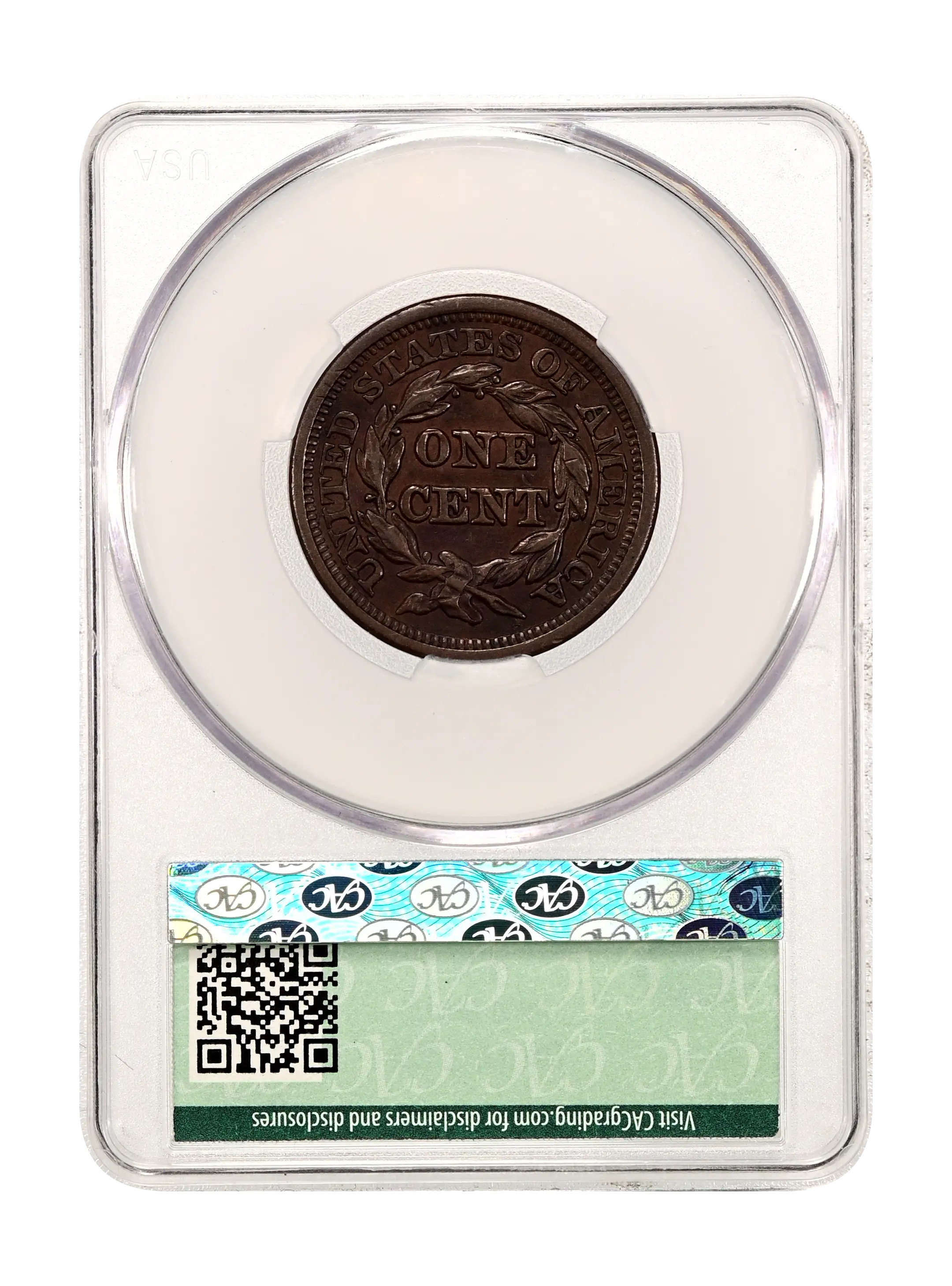 Reverse: The words UNITED STATES OF AMERICA around the periphery surround a wreath framing the words ONE CENT. The wreath is tied by a bow at the bottom.