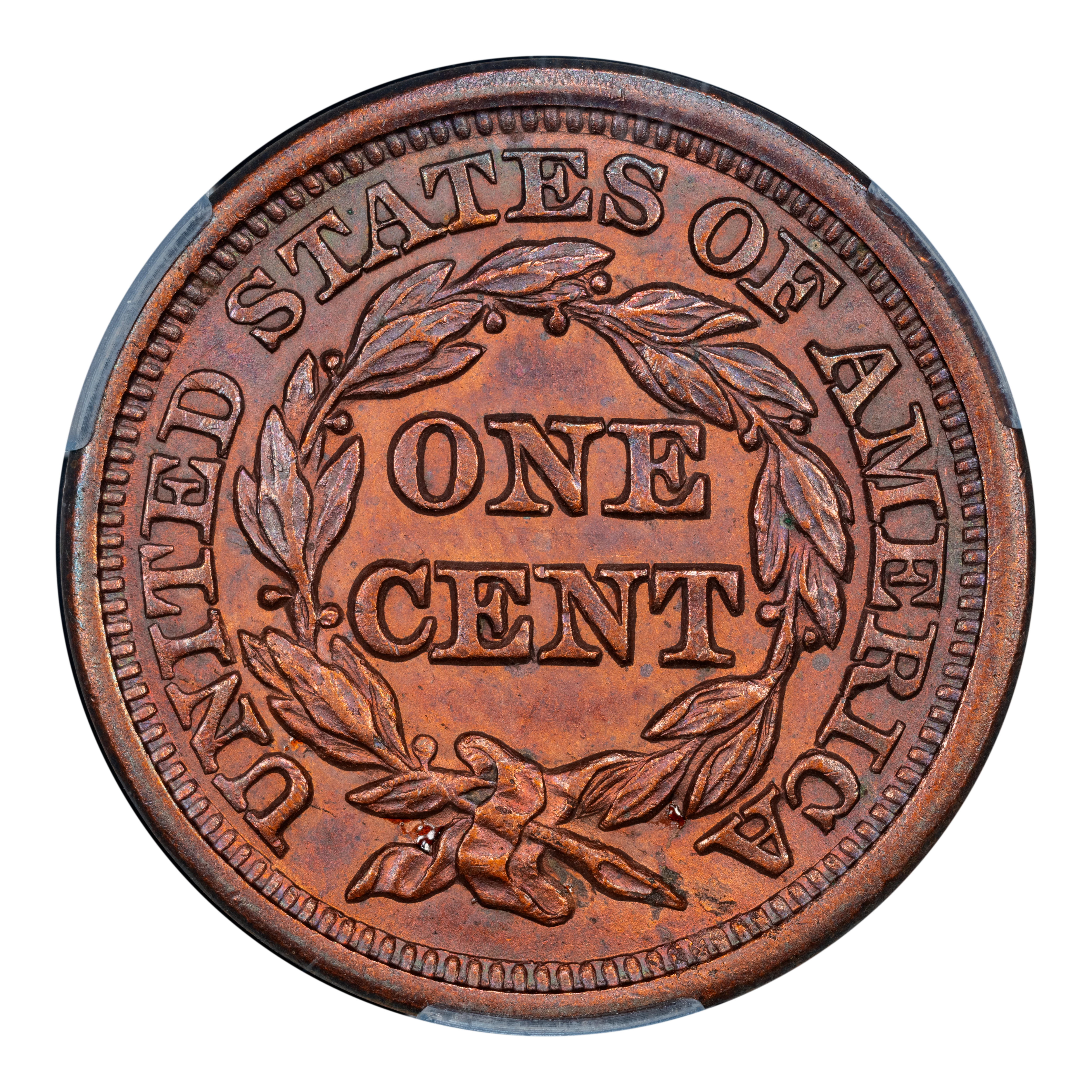 Reverse: The words UNITED STATES OF AMERICA around the periphery surround a wreath framing the words ONE CENT. The wreath is tied by a bow at the bottom.
