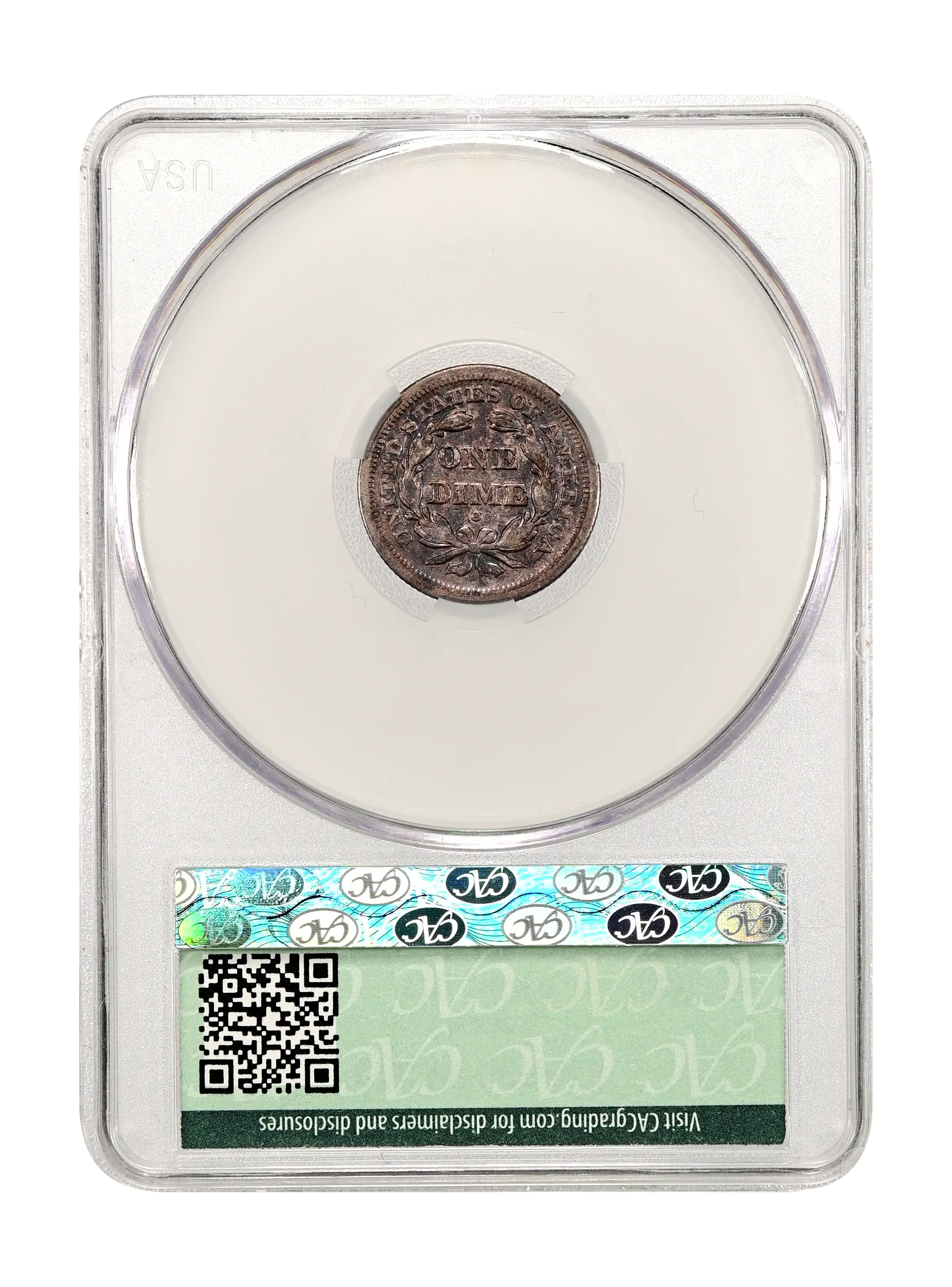 Reverse: The words ONE DIME are centered and surrounded by an ornate wreath tied by ribbon and double bow at the bottom with UNITED STATES OF AMERICA around the periphery. Mint mark appears at bottom center under the bow.