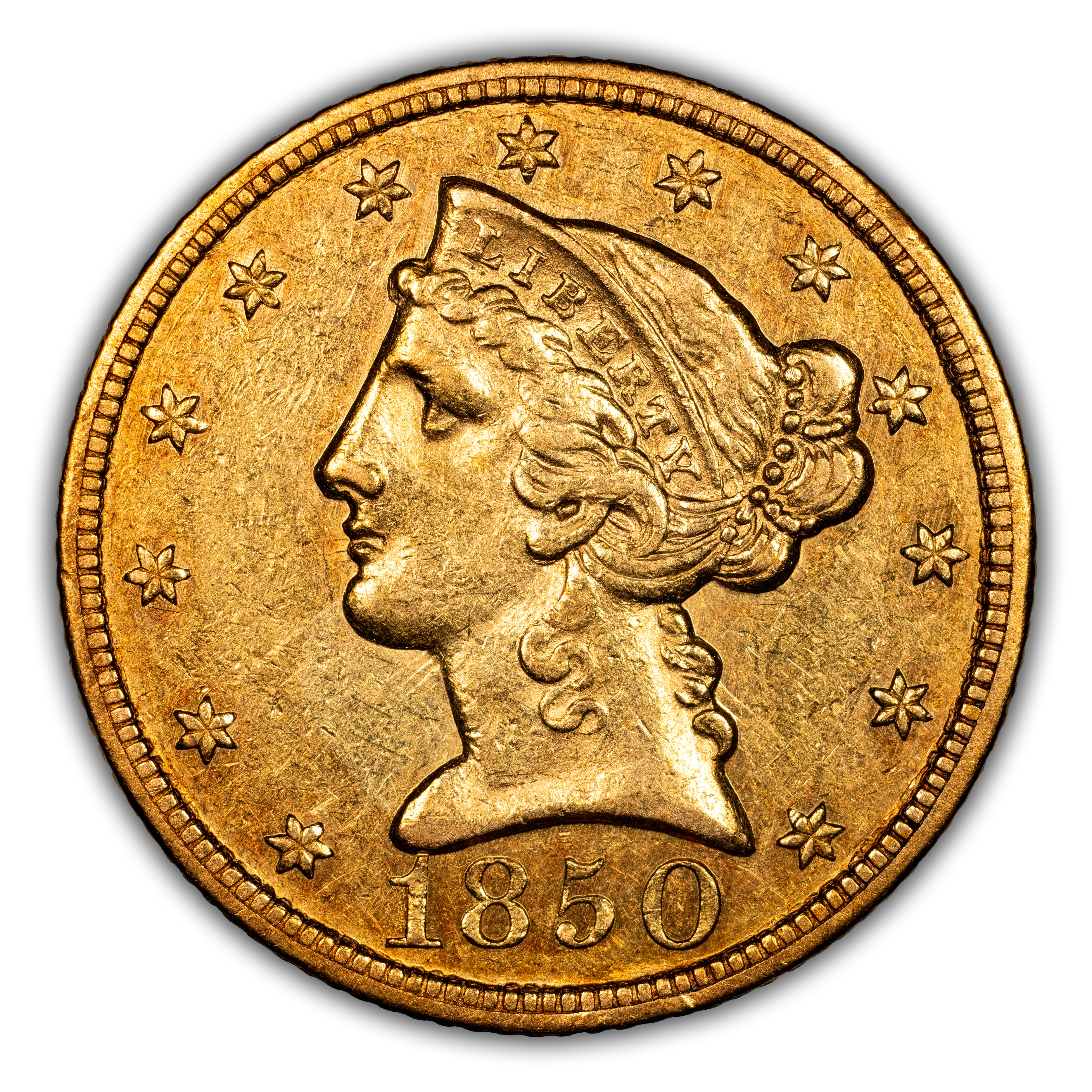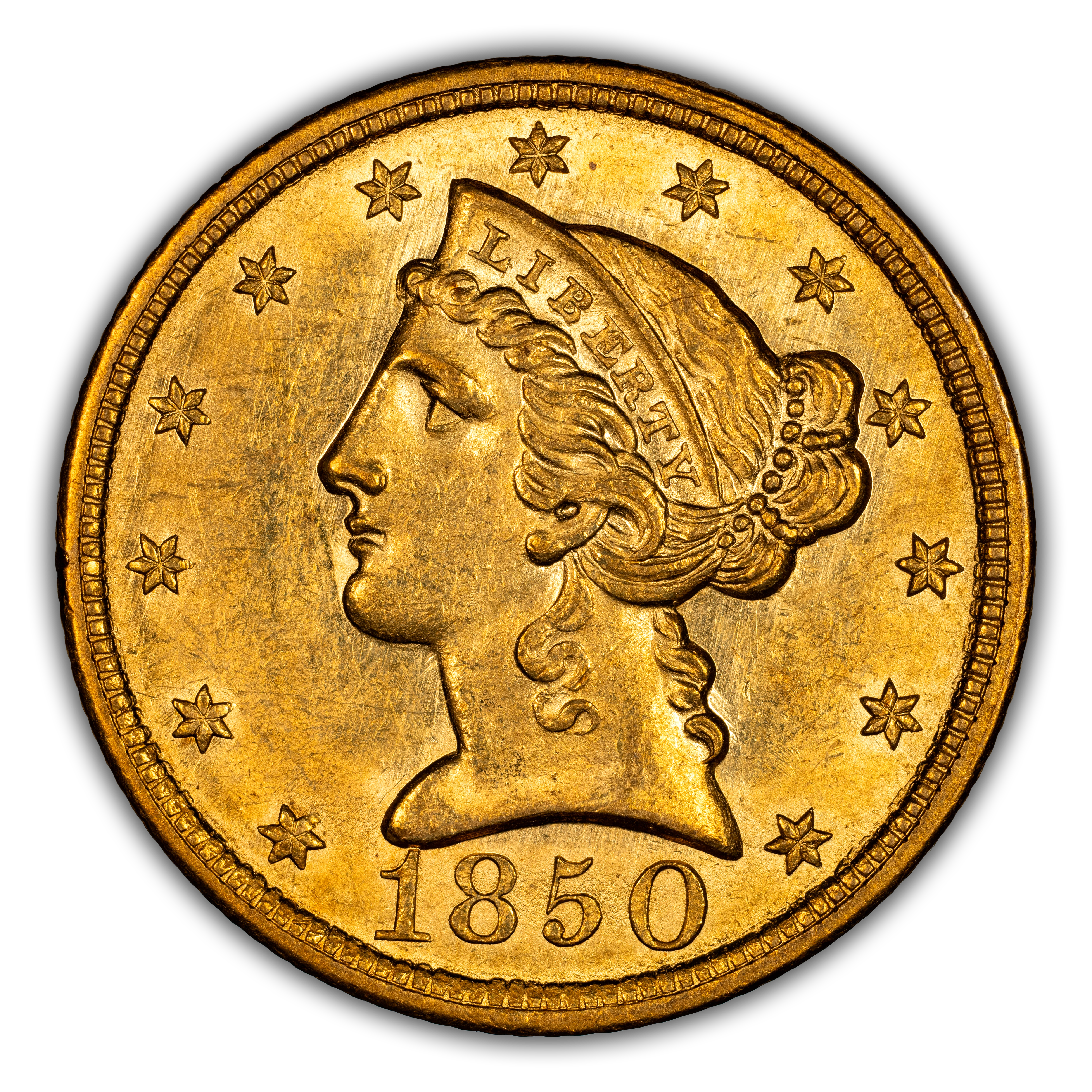 1850-C $5 AU55+ NGC. CAC. Variety 1. Ex: Rive d'Or Collection. The 1850-C is moderately plentiful in the context of Charlot...