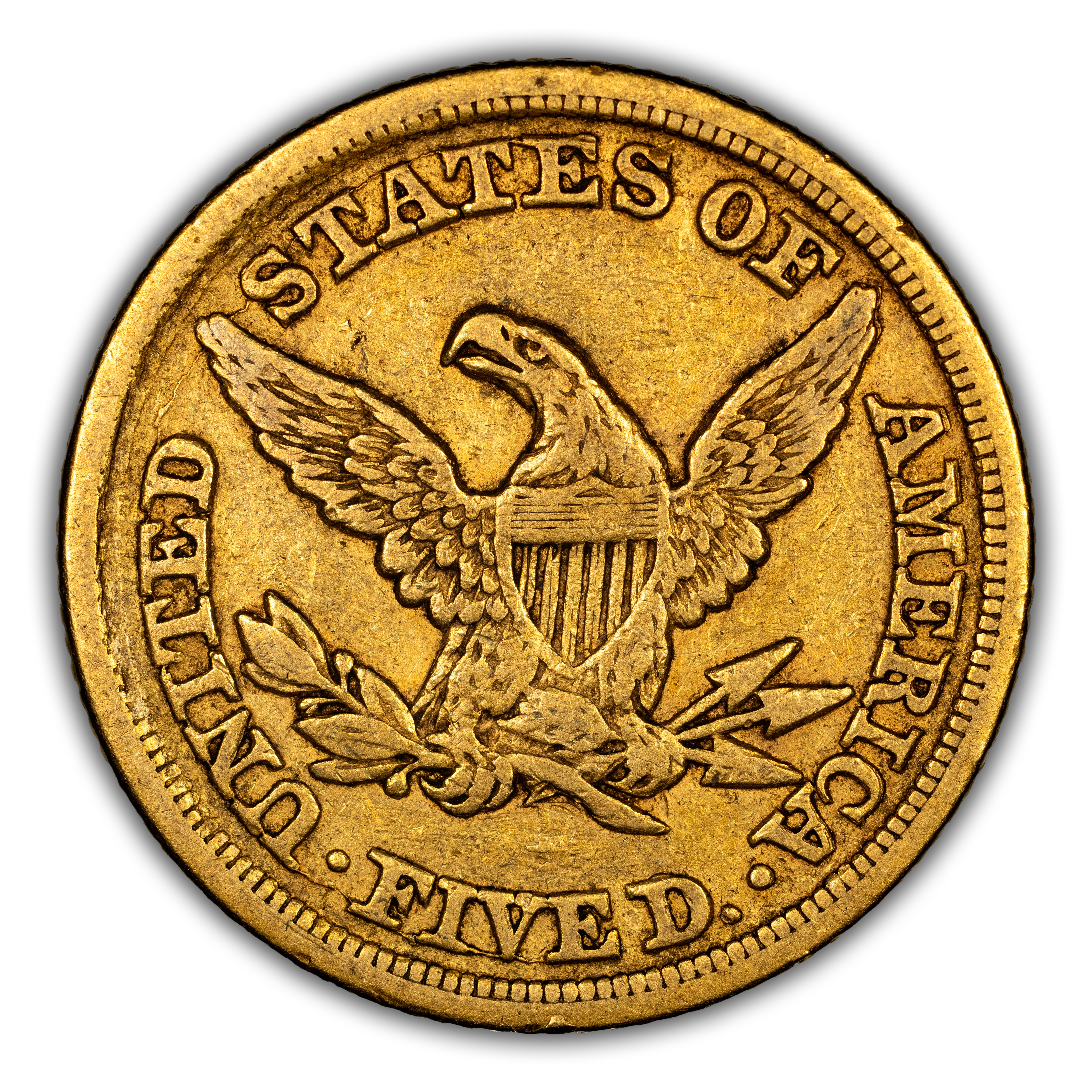 Reverse: Heraldic eagle holding arrows and branch in its claws is centered in the design with the words UNITED STATES OF AMERICA * FIVE D. around the periphery. Mintmark (if any) is located under the eagle's claws.