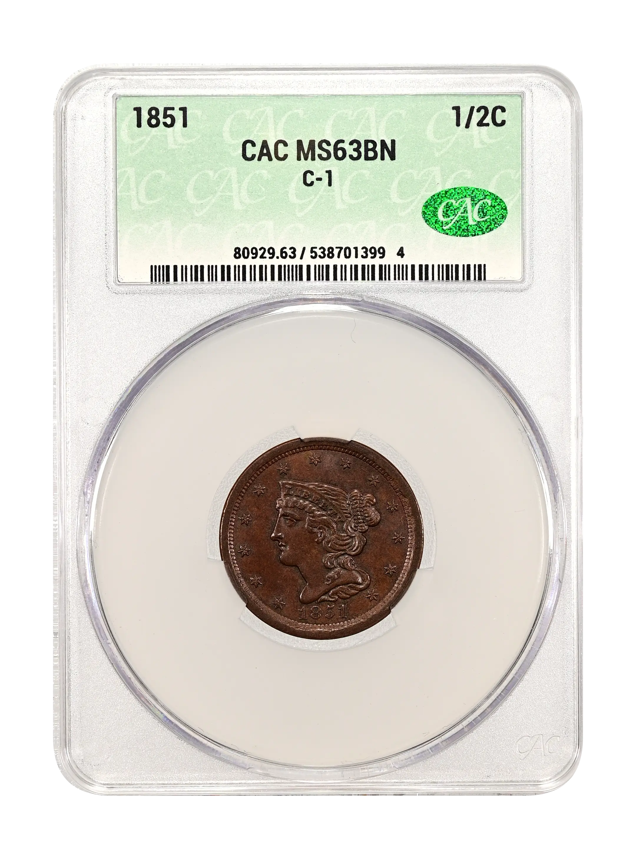 1851 C-1, B-1, R.1, MS65 Brown NGC. CAC. Our EAC grade MS62. ...