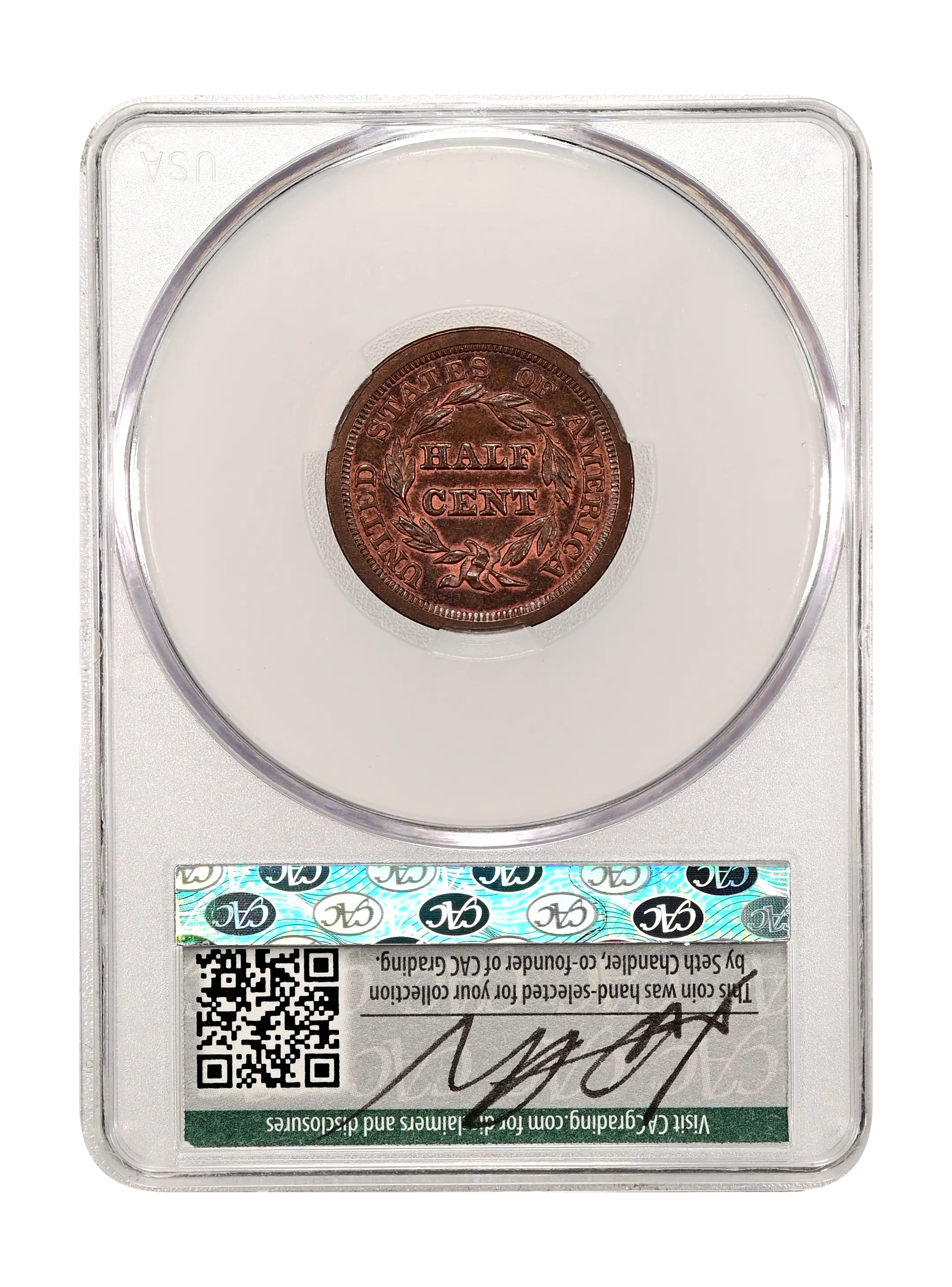 Reverse: The words UNITED STATES OF AMERICA around the periphery surround a wreath framing the words HALF CENT. The wreath is tied by a bow at the bottom.