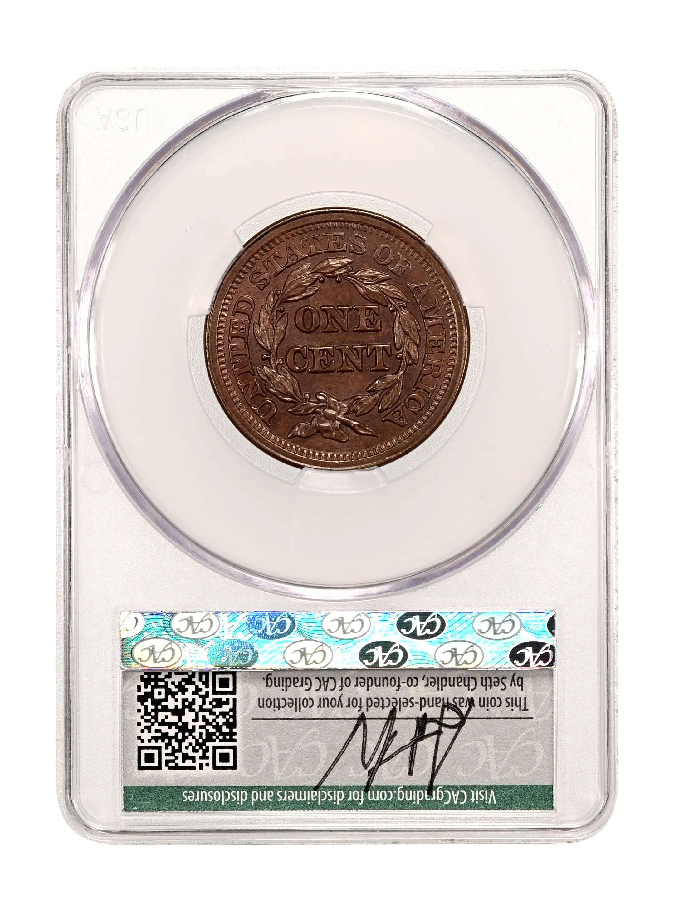 Reverse: The words UNITED STATES OF AMERICA around the periphery surround a wreath framing the words ONE CENT. The wreath is tied by a bow at the bottom.