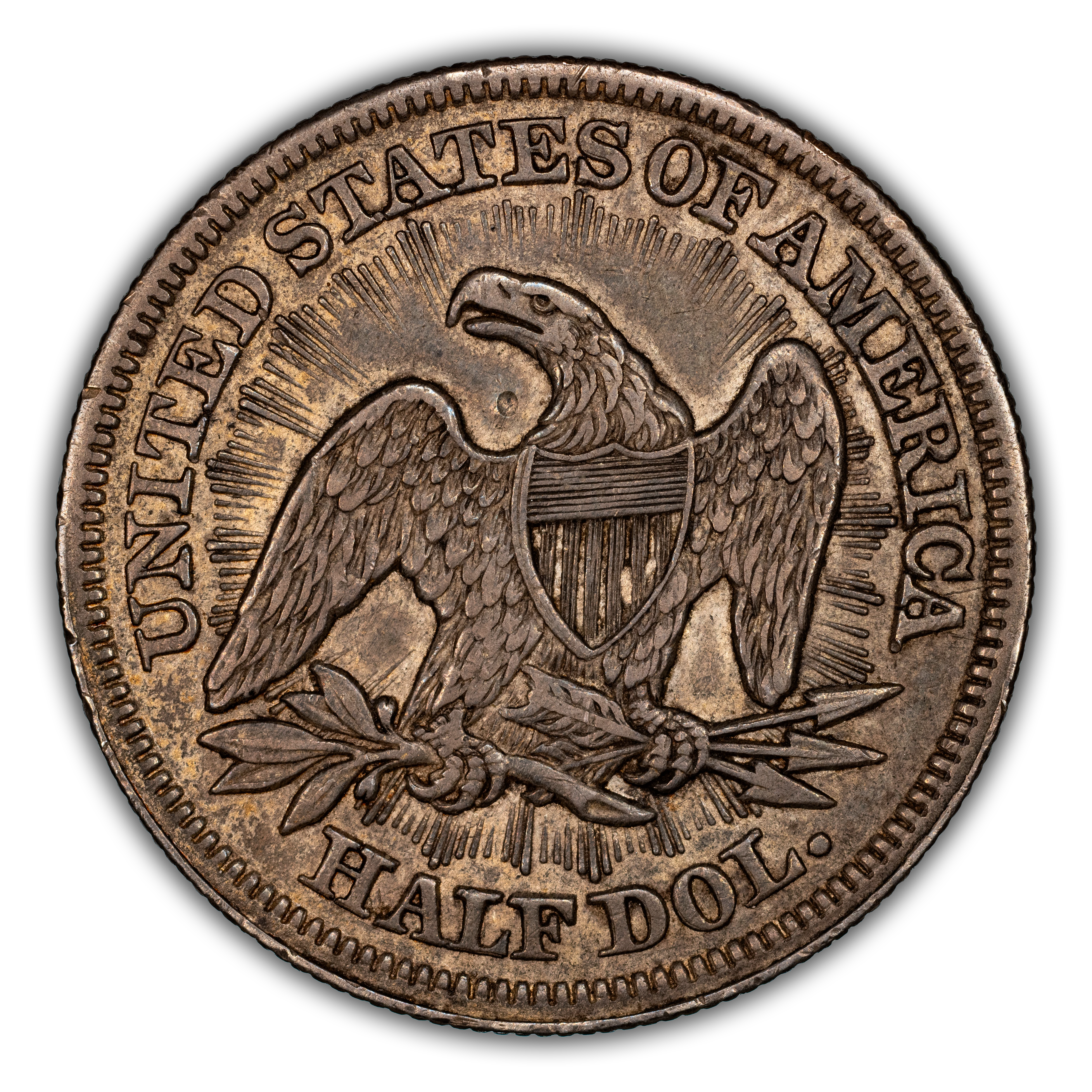 Reverse: The heraldic eagle is centered in the design with the words UNITED STATES OF AMERICA and HALF DOL. around the periphery. Rays (or raised lines) appear in the open spaces around the eagle fanning outward to the lettering.