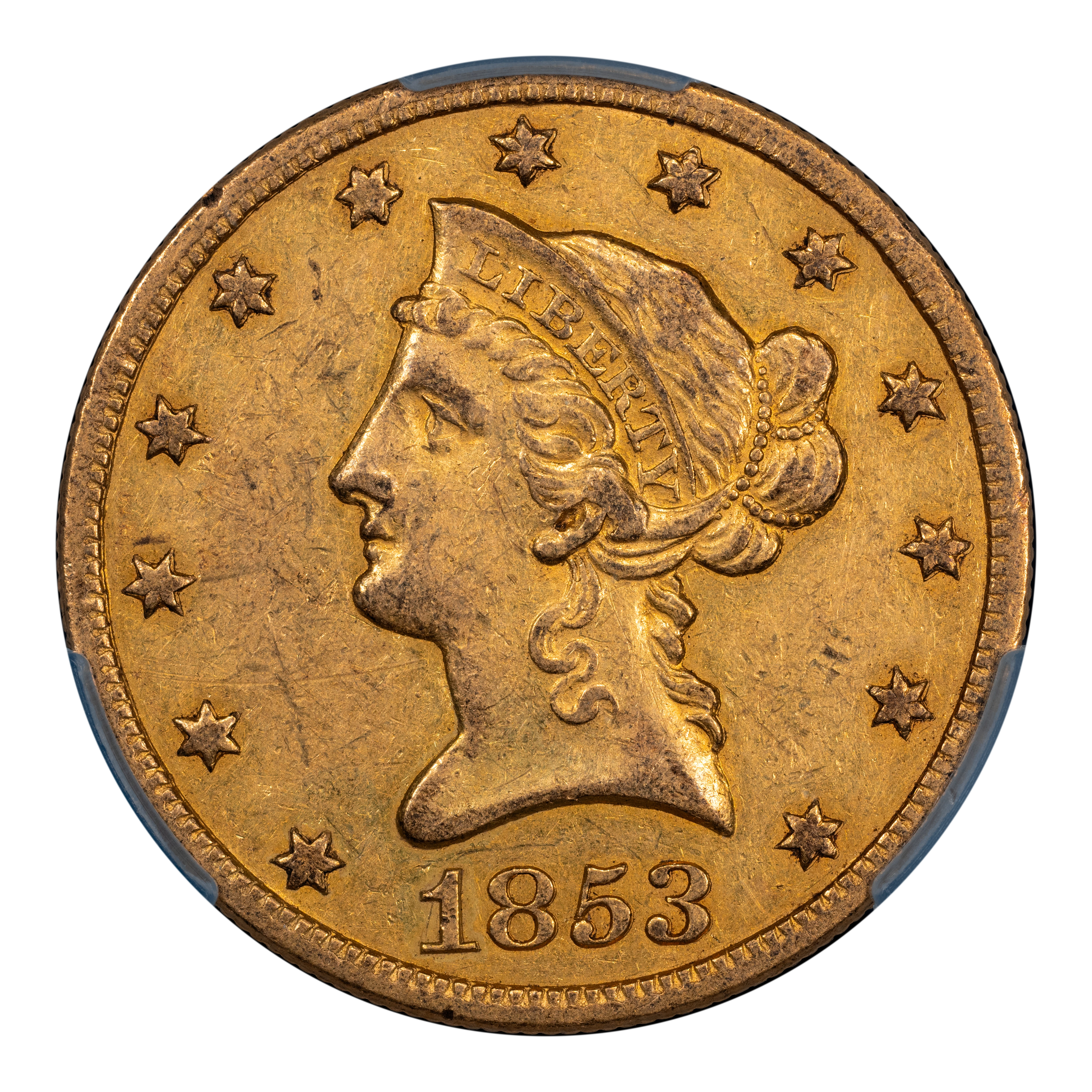 1853-O $10 CAC AU55