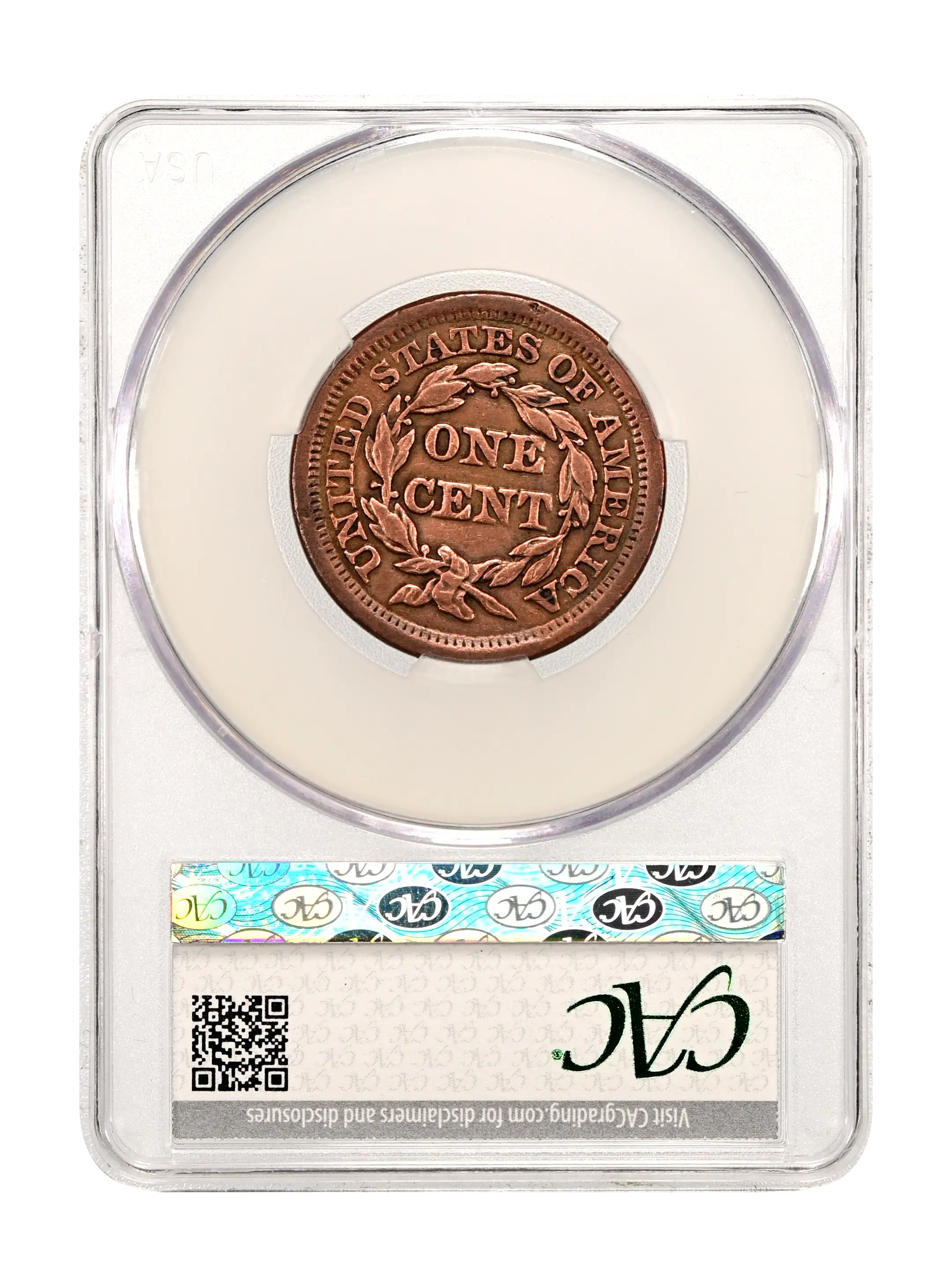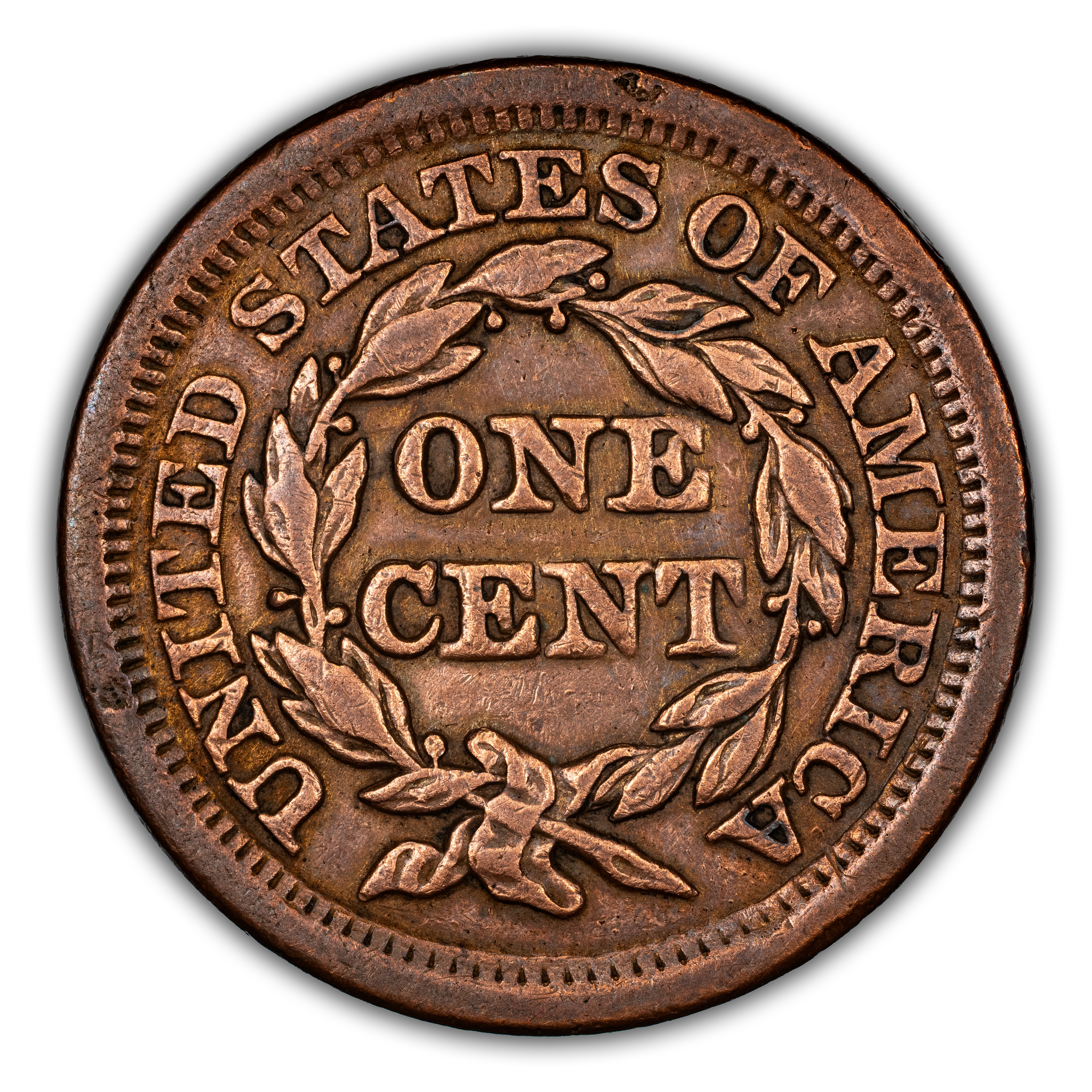 Reverse: The words UNITED STATES OF AMERICA around the periphery surround a wreath framing the words ONE CENT. The wreath is tied by a bow at the bottom.
