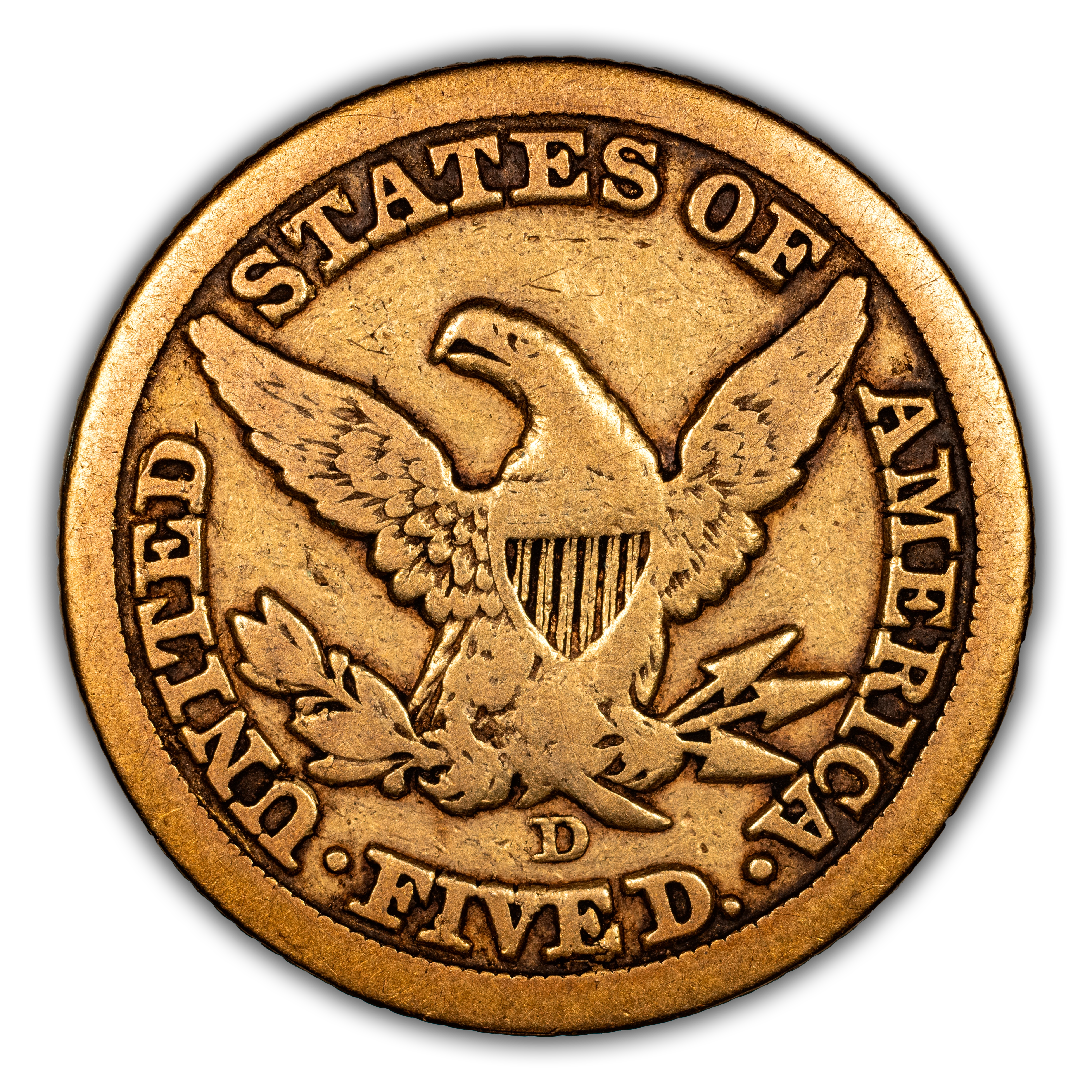 Reverse: Heraldic eagle holding arrows and branch in its claws is centered in the design with the words UNITED STATES OF AMERICA * FIVE D. around the periphery. Mintmark (if any) is located under the eagle's claws.
