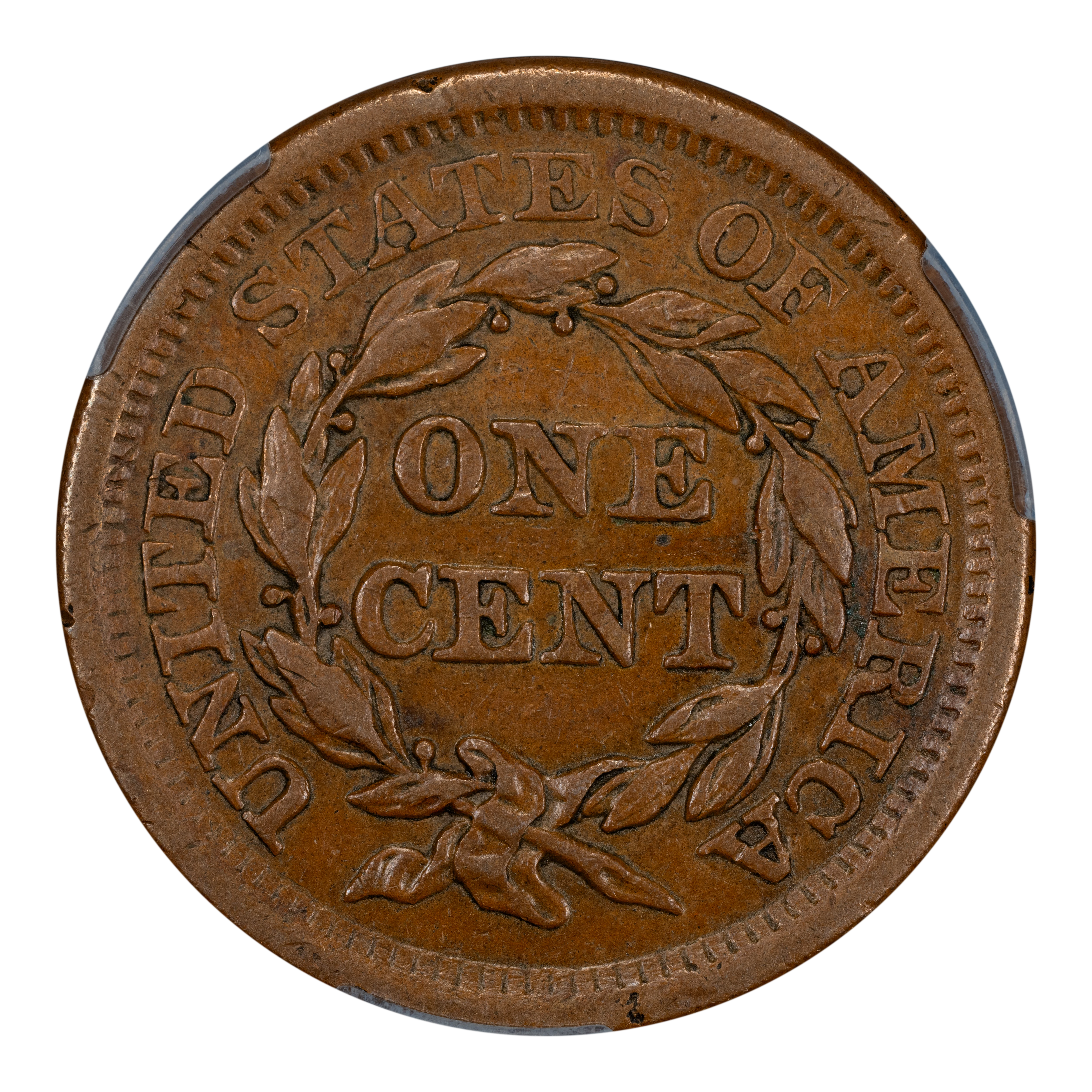 Reverse: The words UNITED STATES OF AMERICA around the periphery surround a wreath framing the words ONE CENT. The wreath is tied by a bow at the bottom.