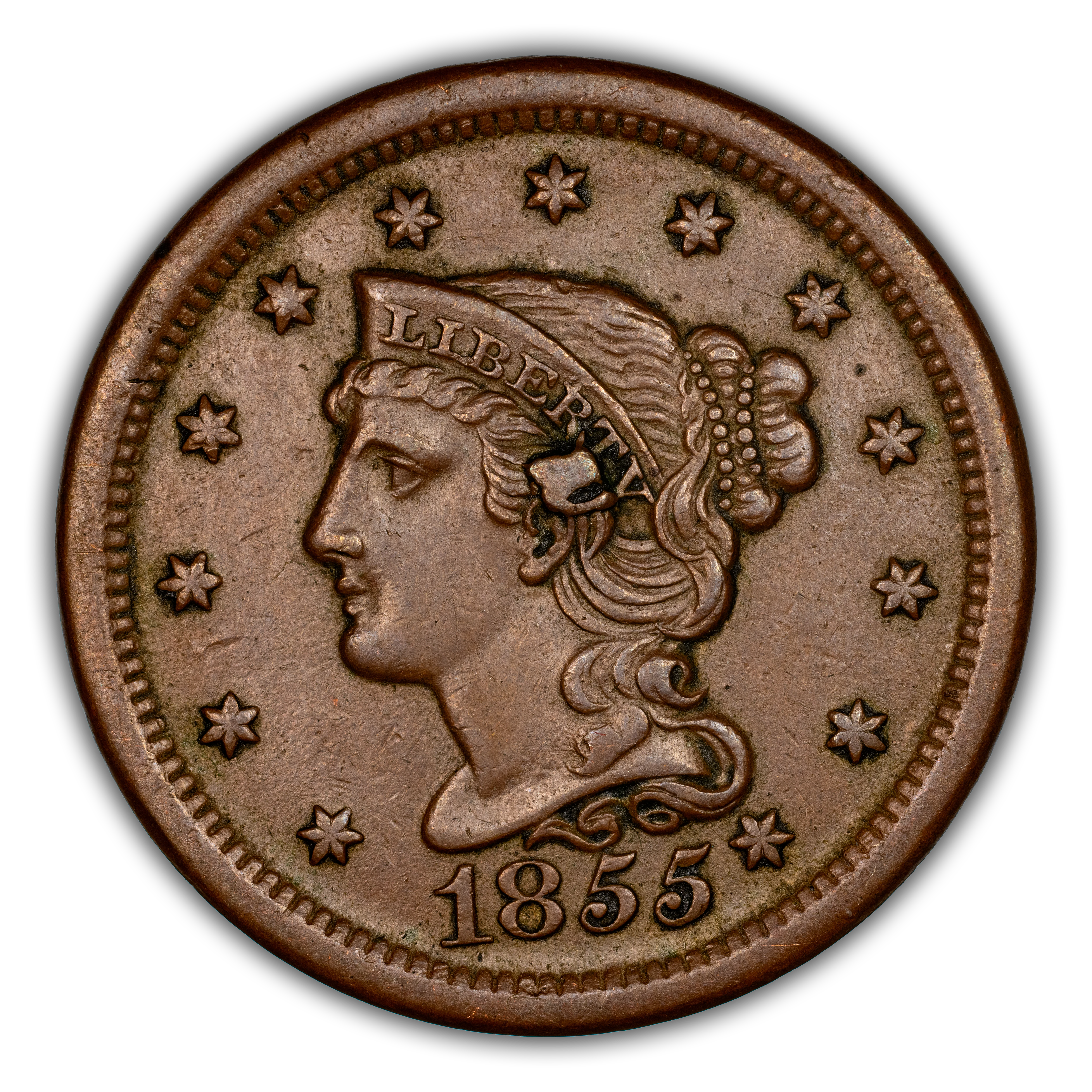 1855 Braided Hair Cent. N-9. Rarity-1. Slanting 5s, Knob on Ear. AU-53 (PCGS).