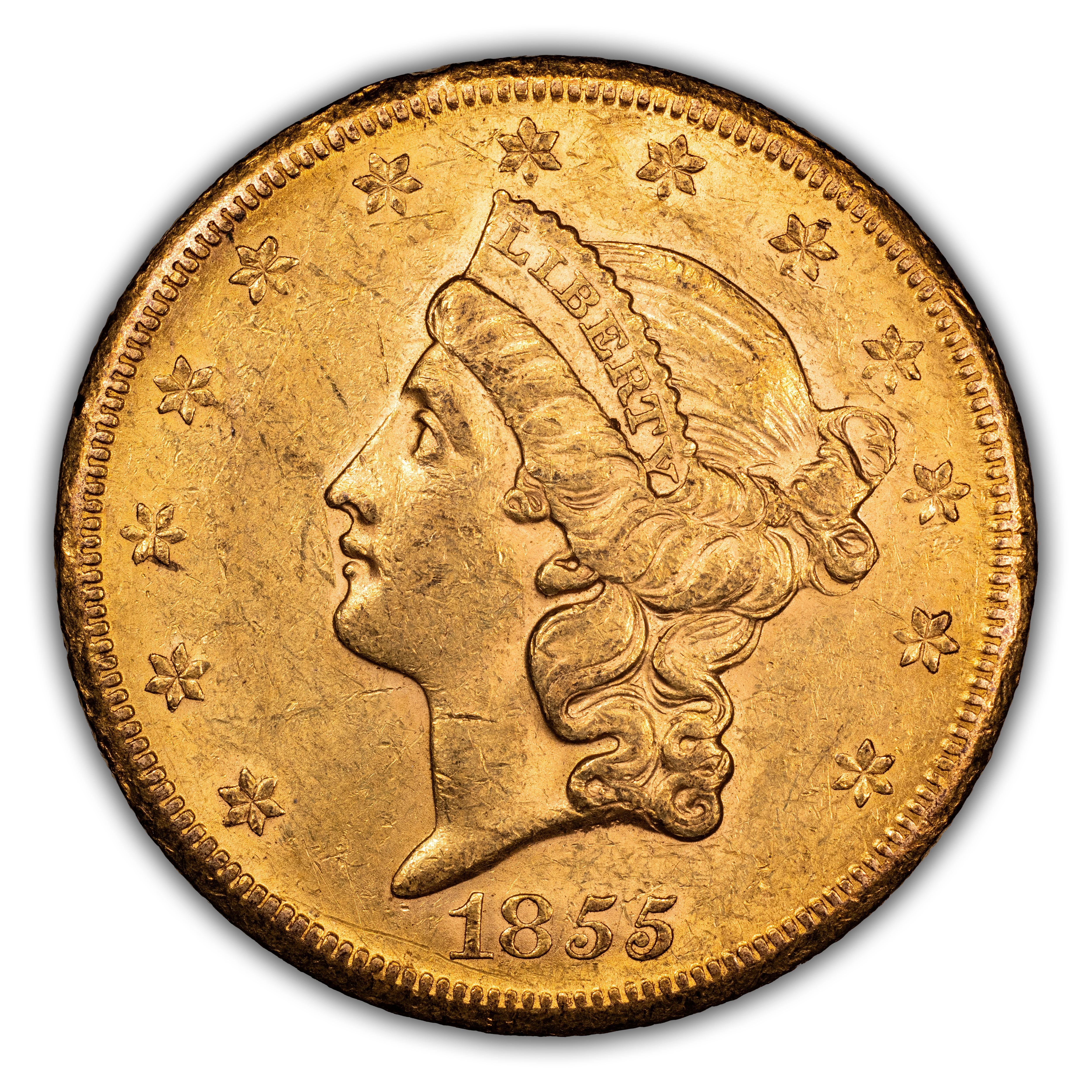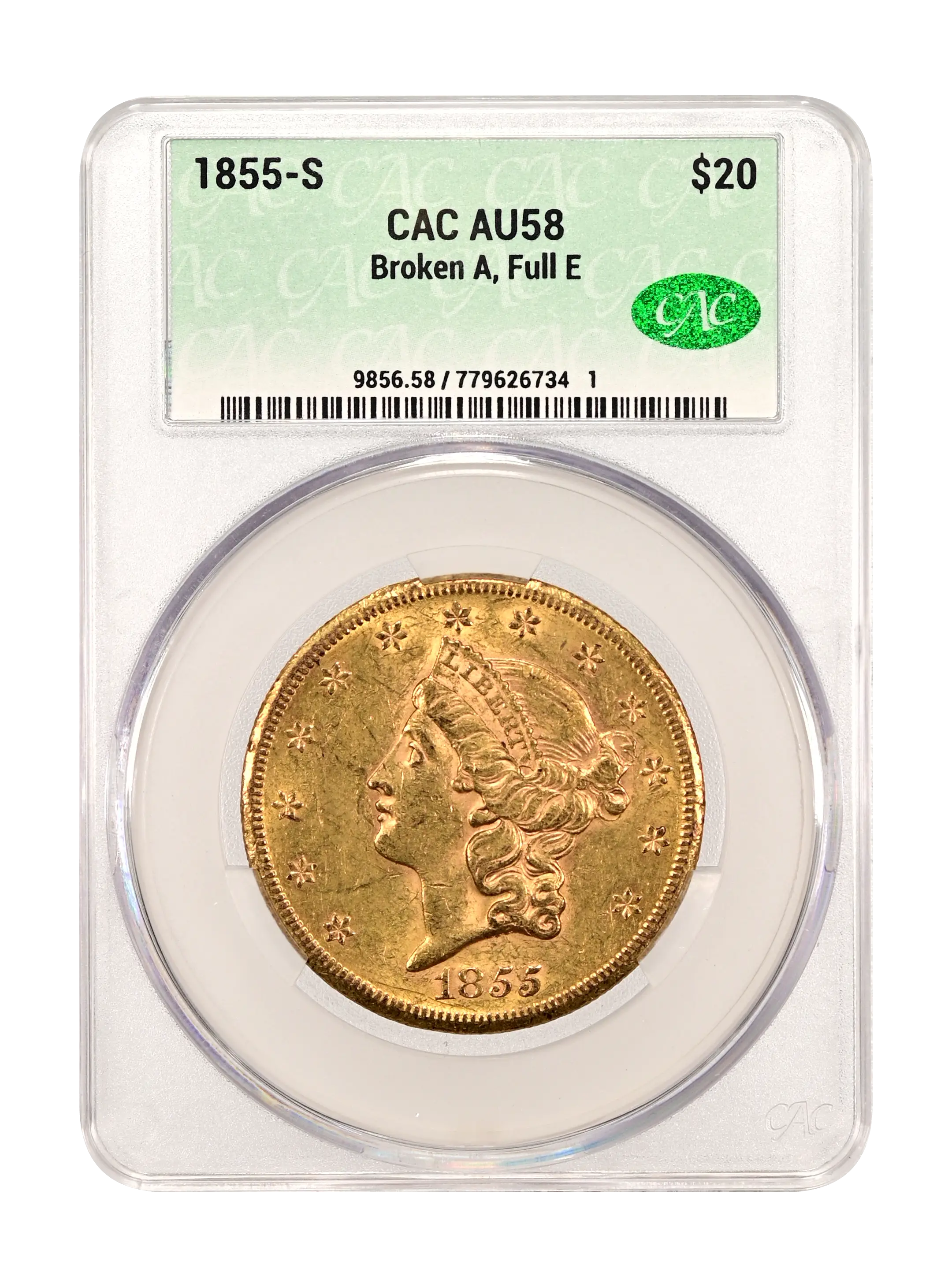 1855-S $20 Broken A, Full E, Variety 14A, AU58 PCGS. CAC....