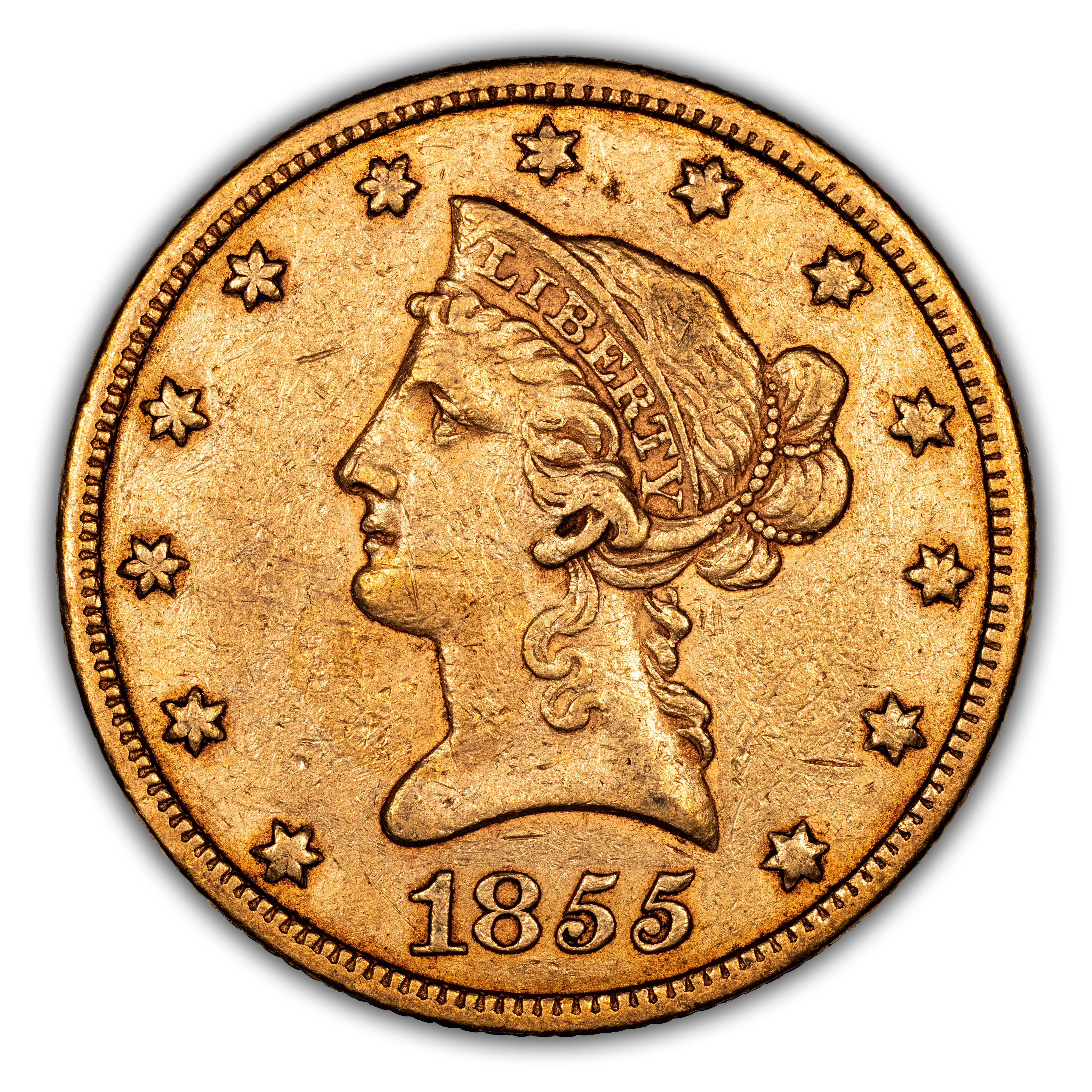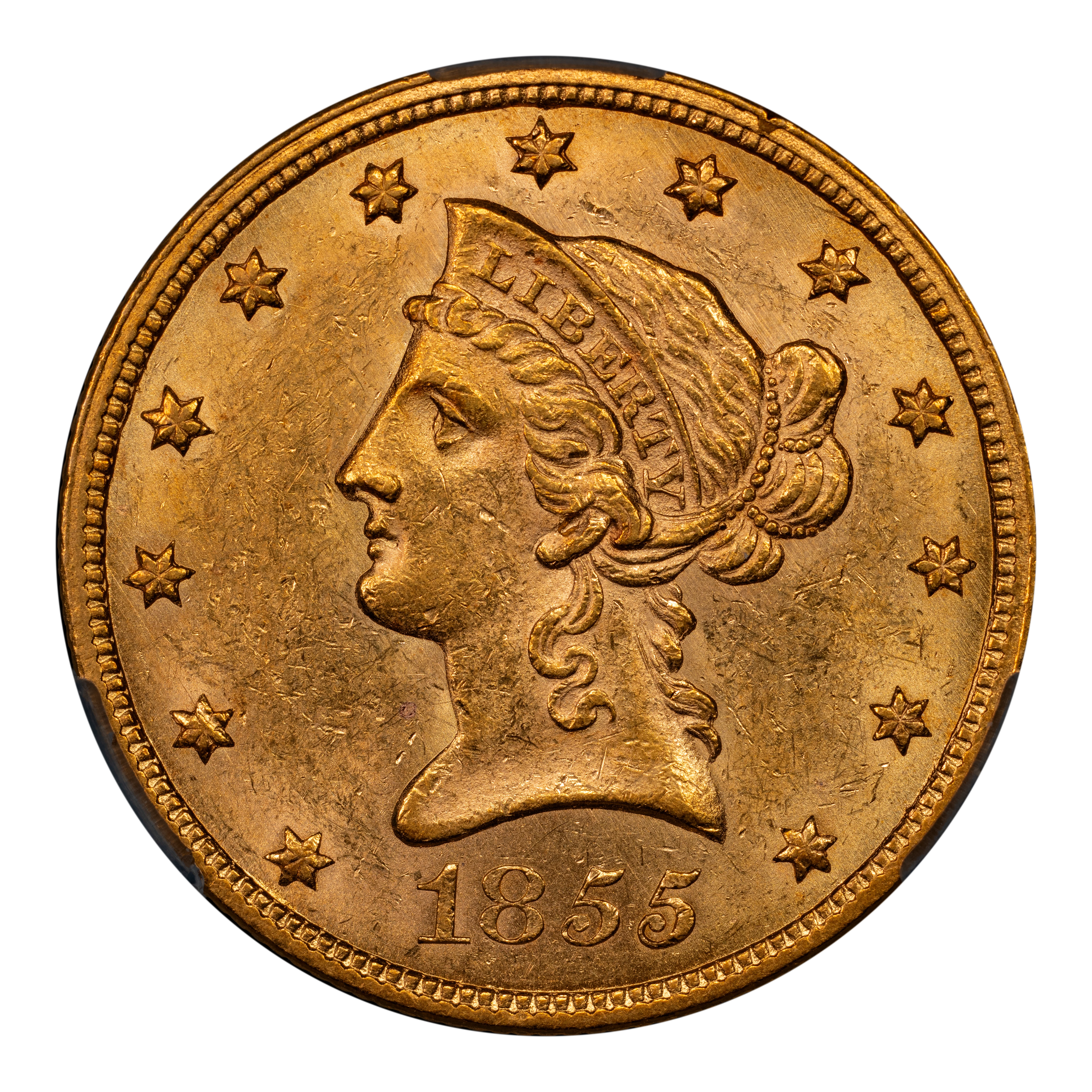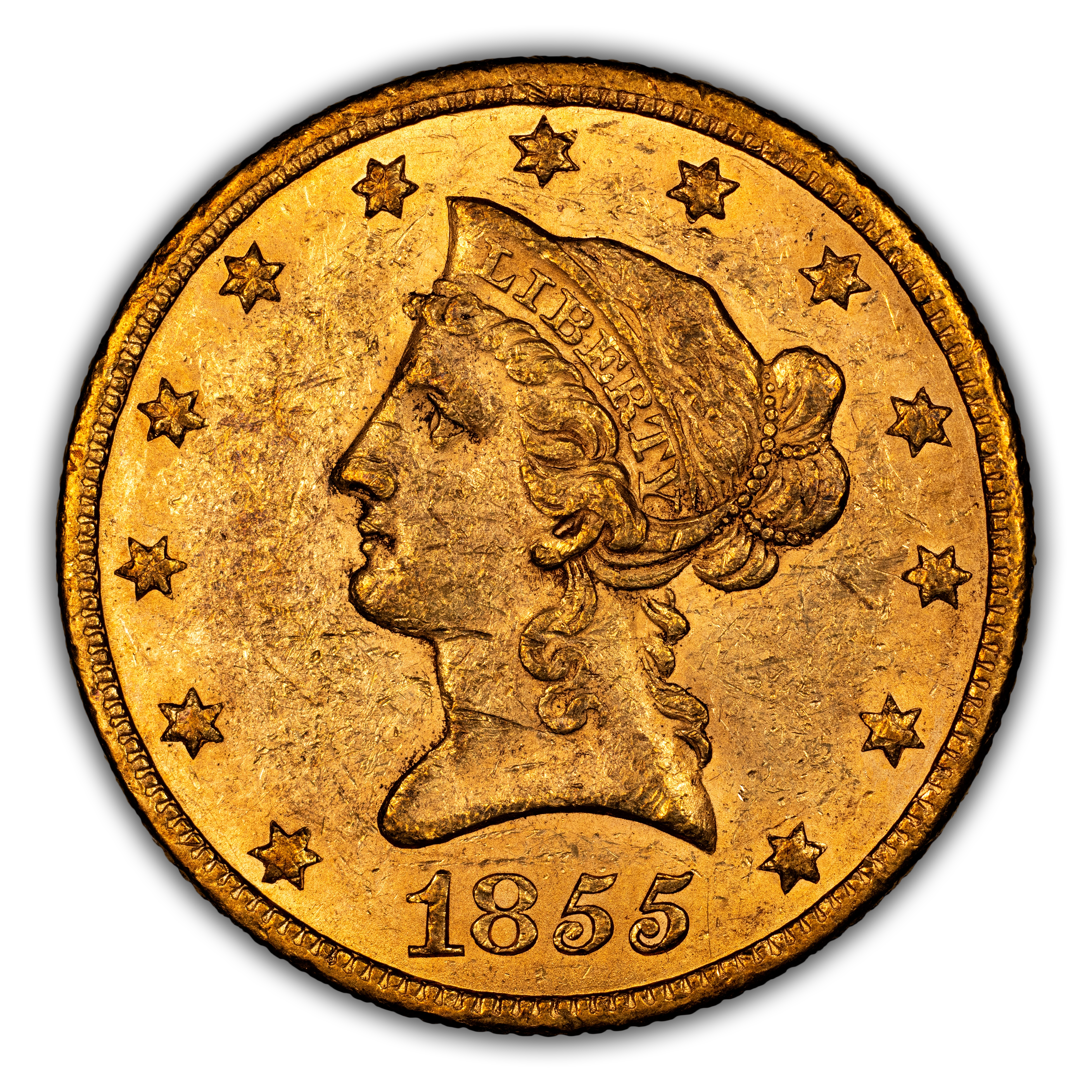 1855 $10 NGC AU58 - Desirable No Motto Eagle